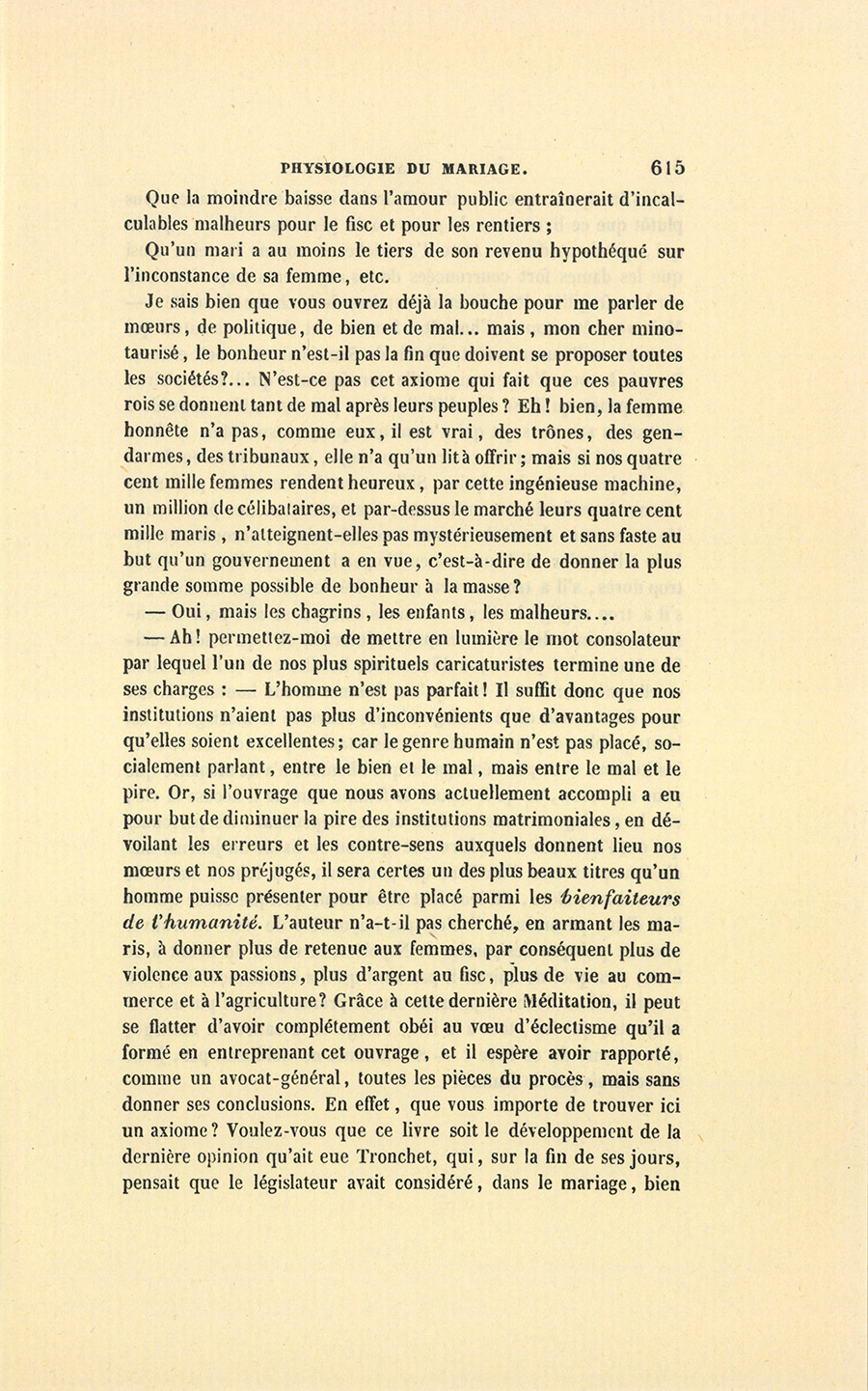 Je sais bien que vous ouvrez déjà la bouche pour me parler de mœurs, de politique, de bien et de mal… mais, mon cher minotaurisé, le bonheur n’est-il pas la fin que doivent se proposer toutes les sociétés ?… N’est-ce pas cet axiome qui fait que ces pauvres rois se donnent tant de mal après leurs peuples ? Eh ! bien, la femme honnête n’a pas, comme eux, il est vrai, des trônes, des gendarmes, des tribunaux, elle n’a qu’un lit à offrir ; mais si nos quatre cent mille femmes rendent heureux, par cette ingénieuse machine, un million de célibataires, et par-dessus le marché leurs quatre cent mille maris, n’atteignent-elles pas mystérieusement et sans faste au but qu’un gouvernement a en vue, c’est-à-dire de donner la plus grande somme possible de bonheur à la masse ?