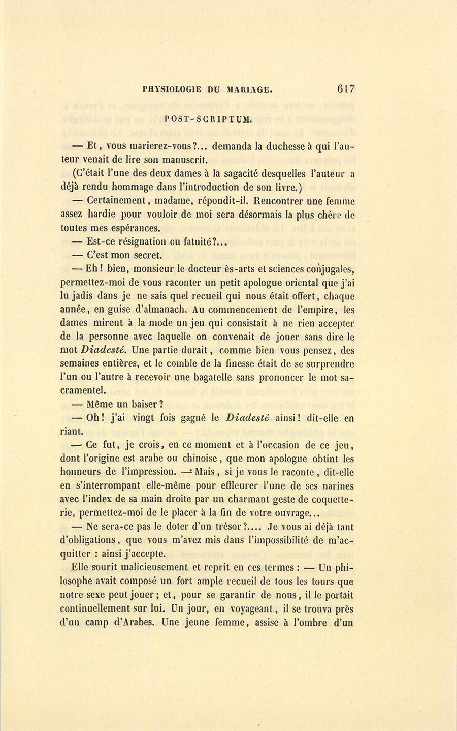 – Eh ! bien, monsieur le docteur ès-arts et sciences conjugales, permettez-moi de vous raconter un petit apologue oriental que j’ai lu jadis dans je ne sais quel recueil qui nous était offert, chaque année, en guise d’almanach. Au commencement de l’empire, les dames mirent à la mode un jeu qui consistait à ne rien accepter de la personne avec laquelle on convenait de jouer sans dire le mot Diadesté. Une partie durait, comme bien vous pensez, des semaines entières, et le comble de la finesse était de se surprendre l’un ou l’autre à recevoir une bagatelle sans prononcer le mot sacramentel.