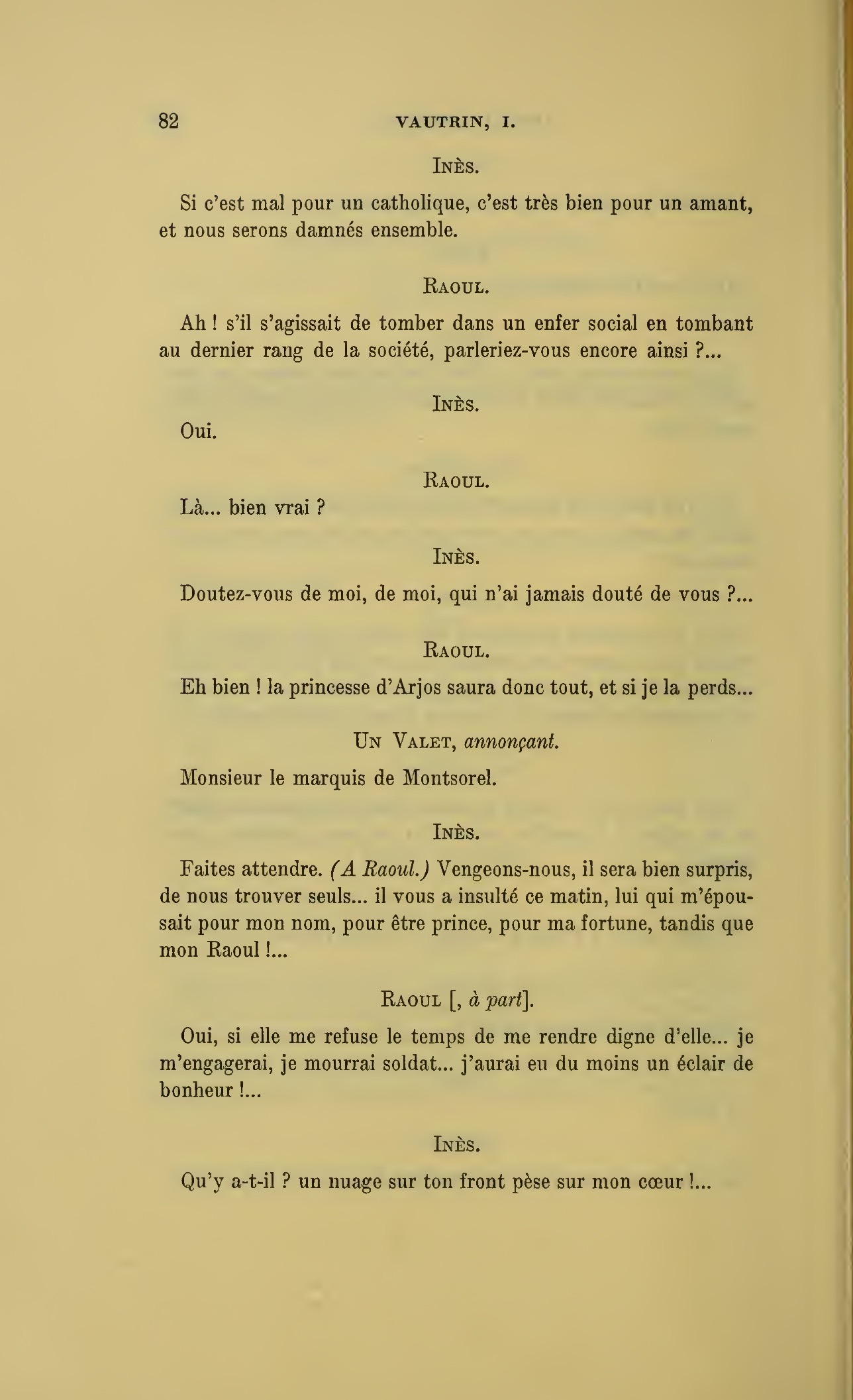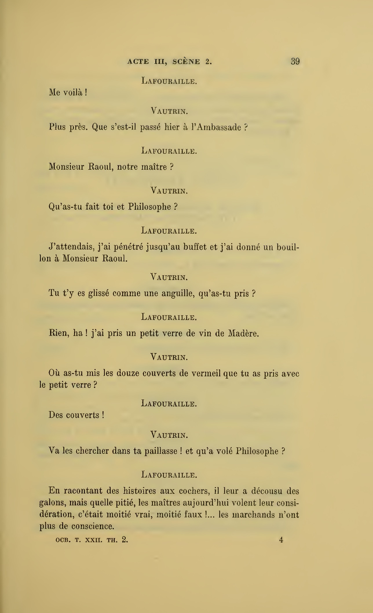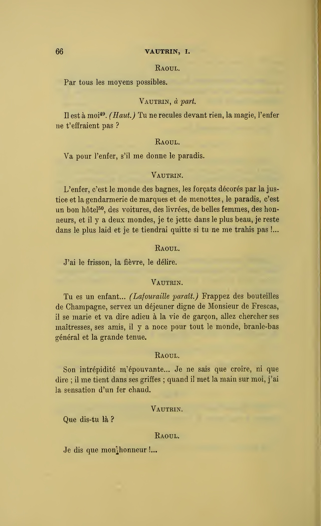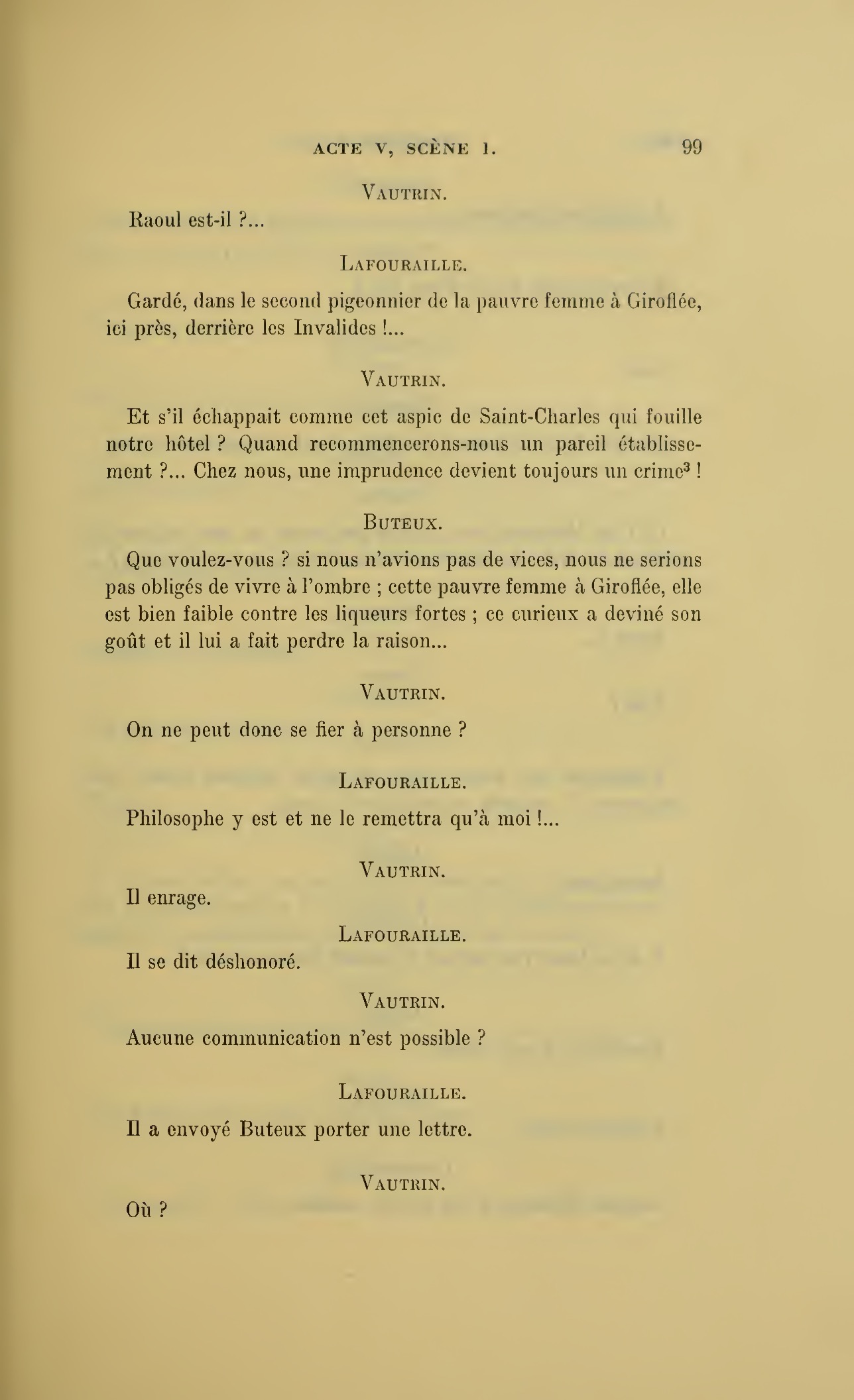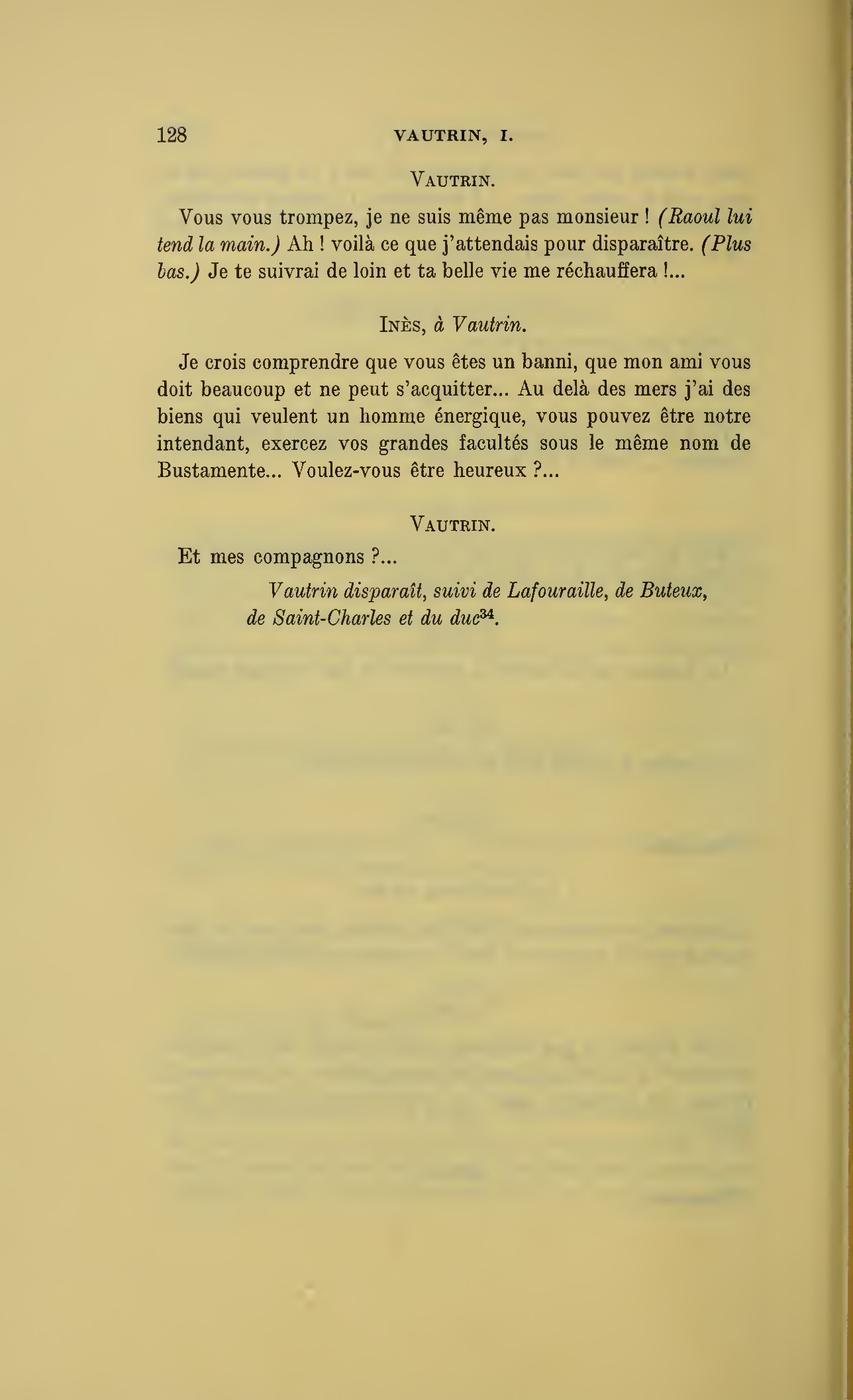 {p. 128} Vous vous trompez, je ne suis même pas monsieur ! (Raoul lui tend la main.) Ah ! voilà ce que j’attendais pour disparaître. (Plus bas.) Je te suivrai de loin et ta belle vie me réchauffera !…