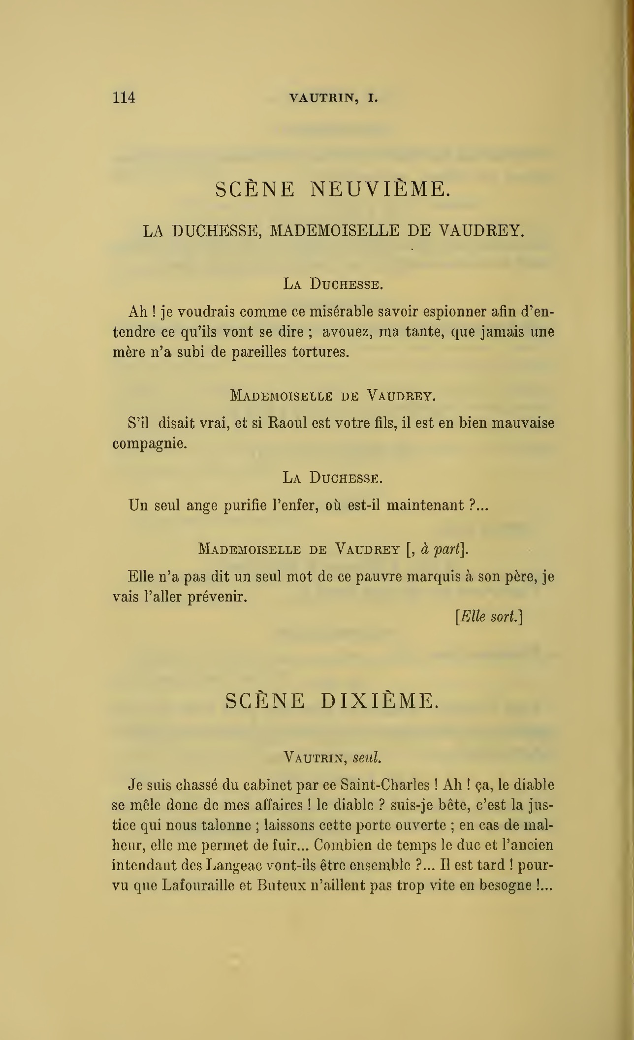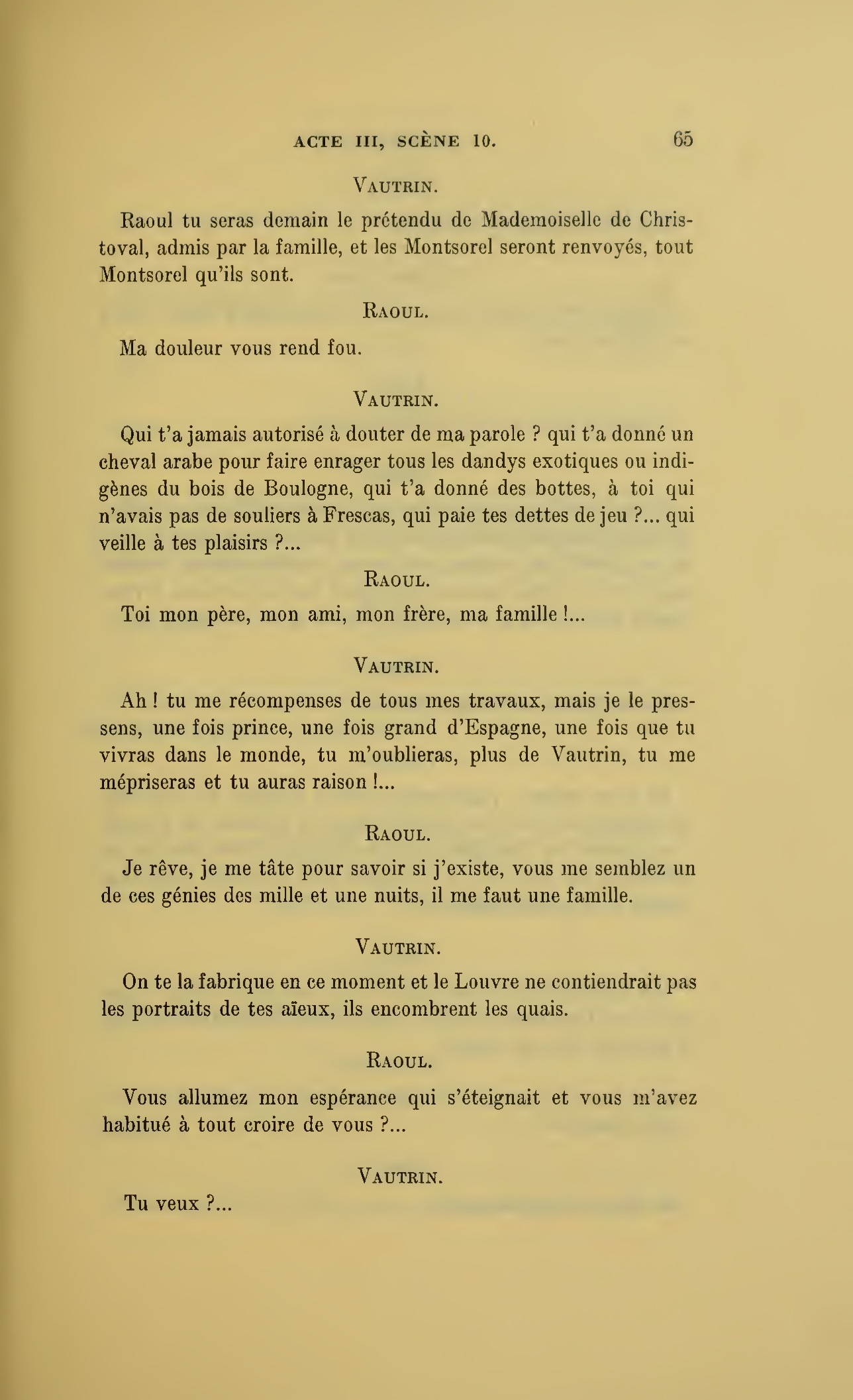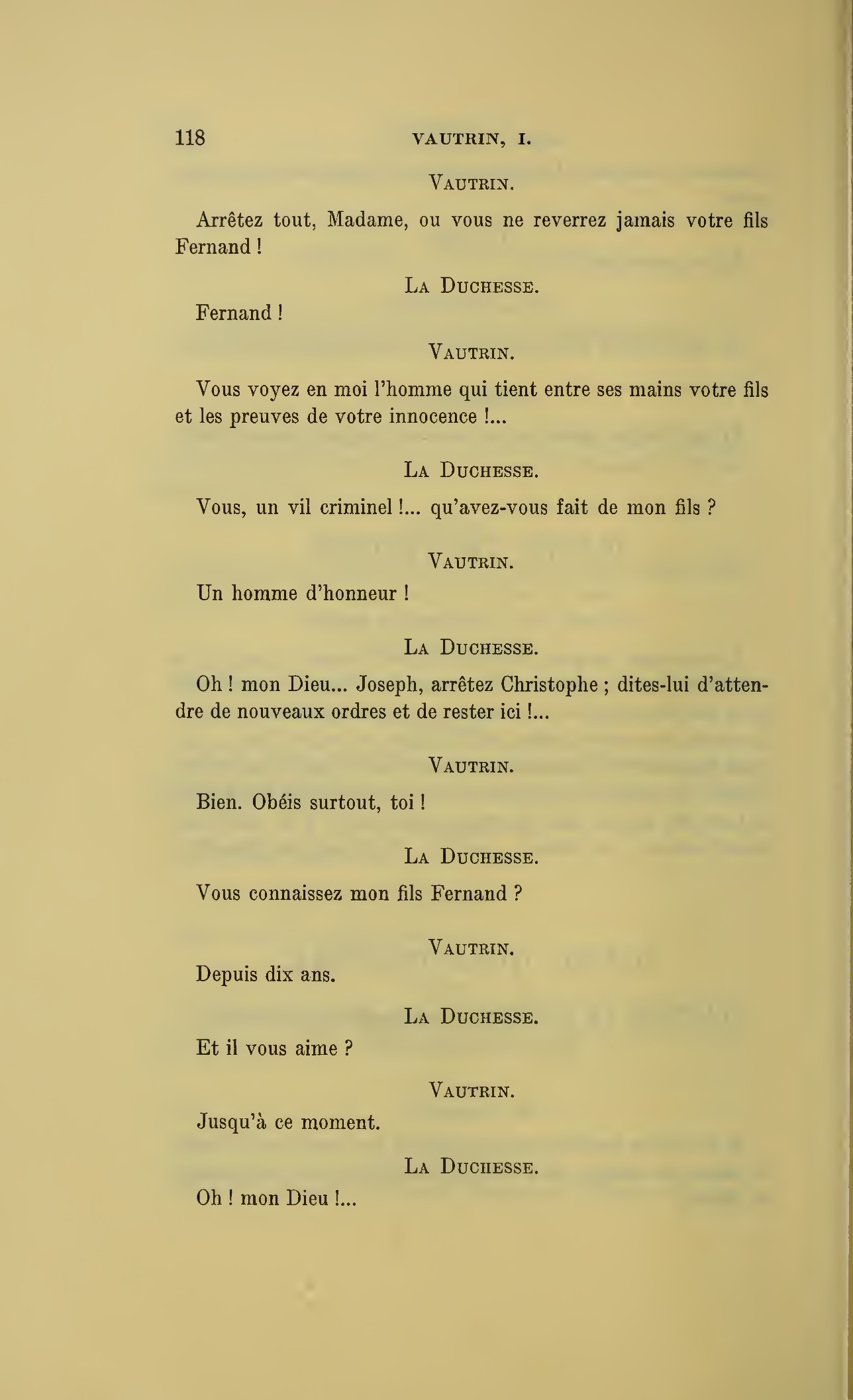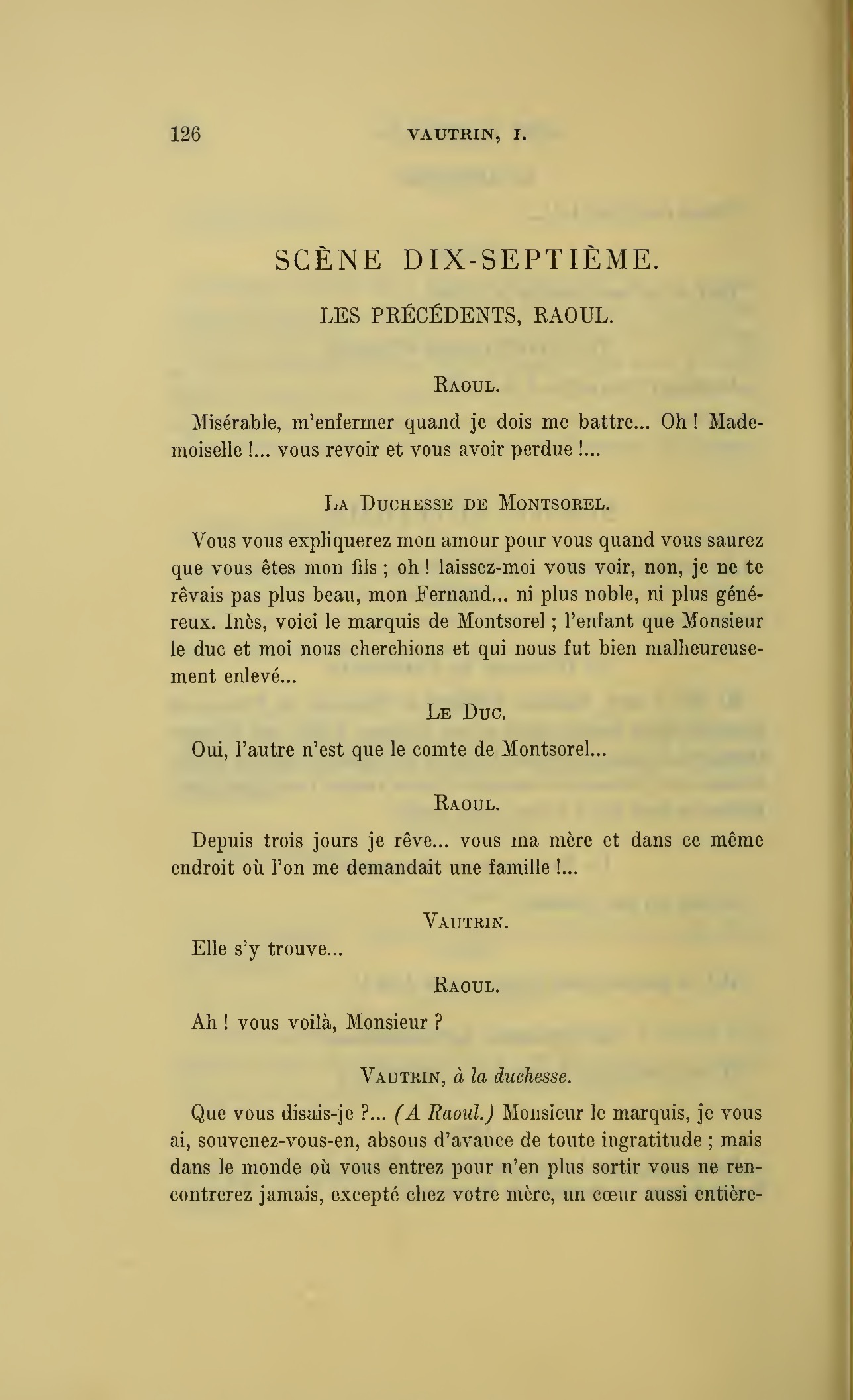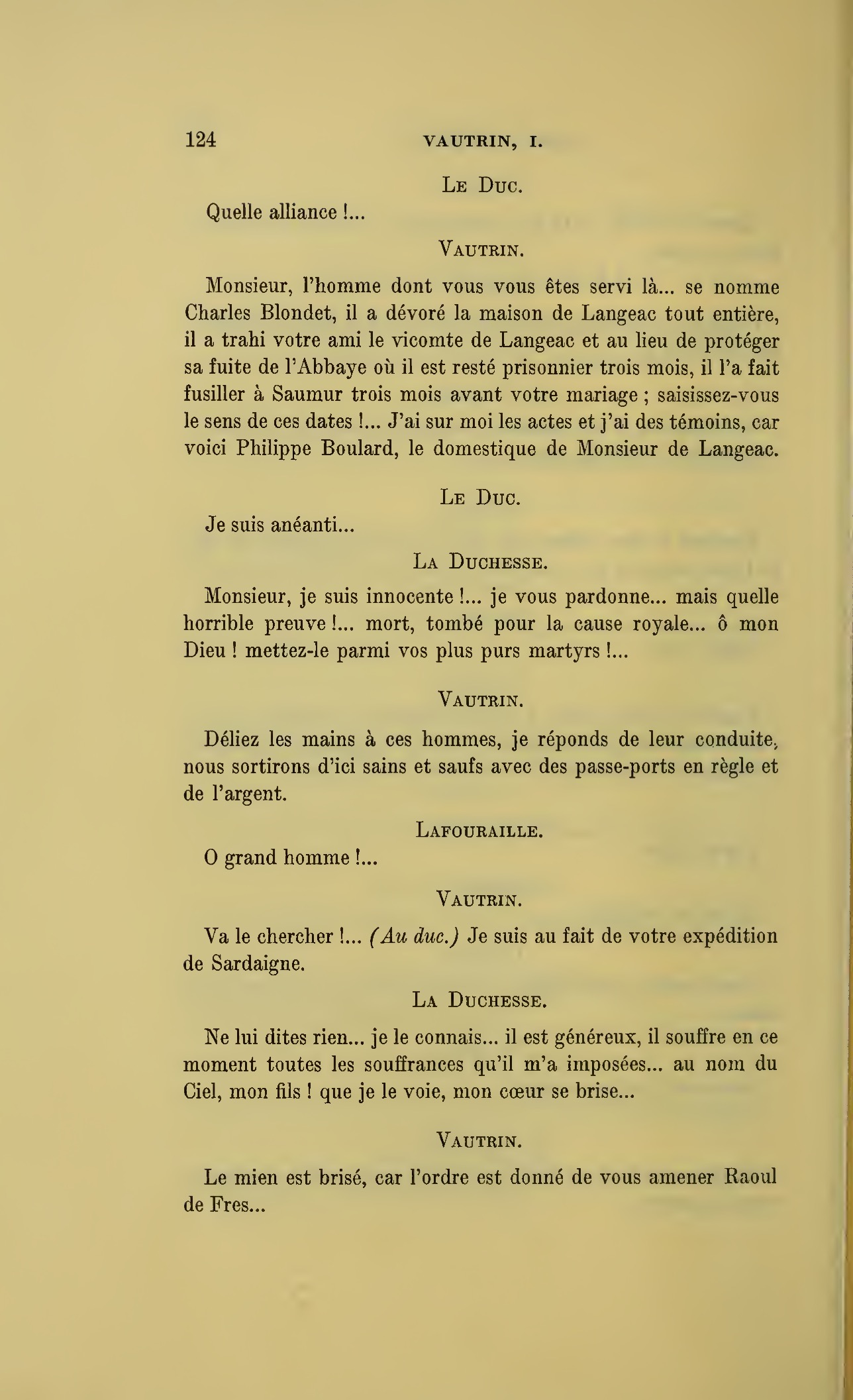 Que vous disais-je ?… (À Raoul.) monsieur le marquis, je vous ai, souvenez-vous-en, absous d’avance de toute ingratitude ; mais dans le monde où vous entrez pour n’en plus sortir vous ne rencontrerez jamais, excepté chez votre mère, un cœur aussi entièrement {p. 127}dévoué que celui de Vautrin… Et moi ? ne parlons pas de moi, voilà ta mère, adieu… (À la duchesse.) L’enfant m’oubliera, la mère saura-t-elle tendre parfois une main secourable à celui qui l’a su remplacer pendant dix ans ?