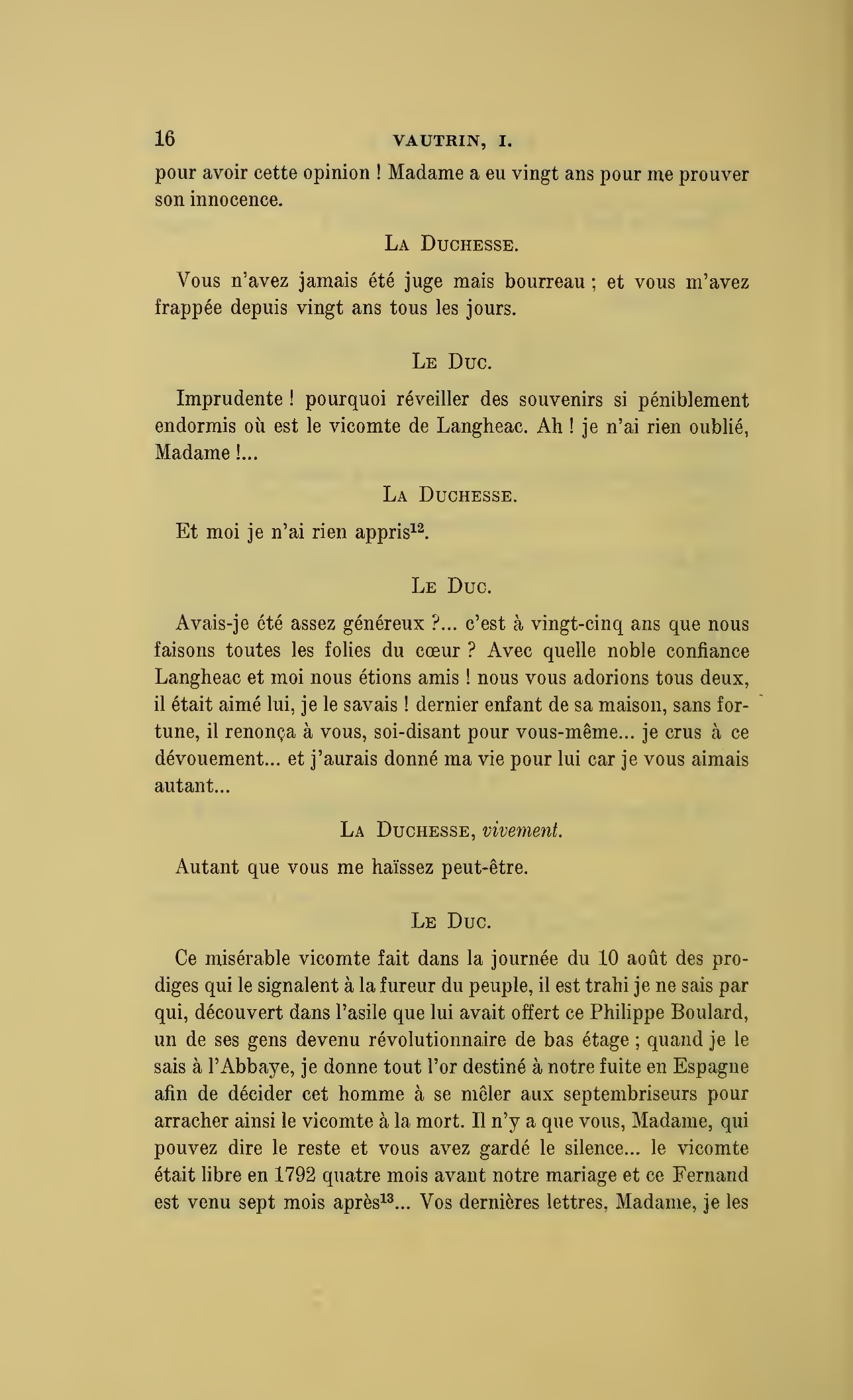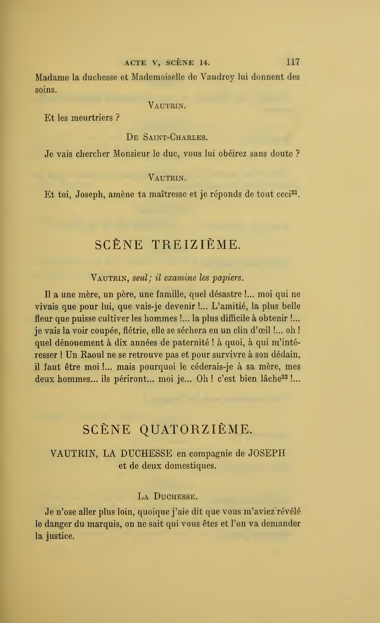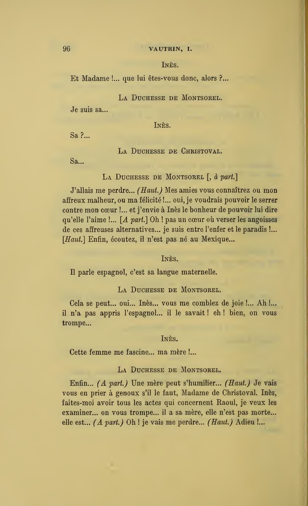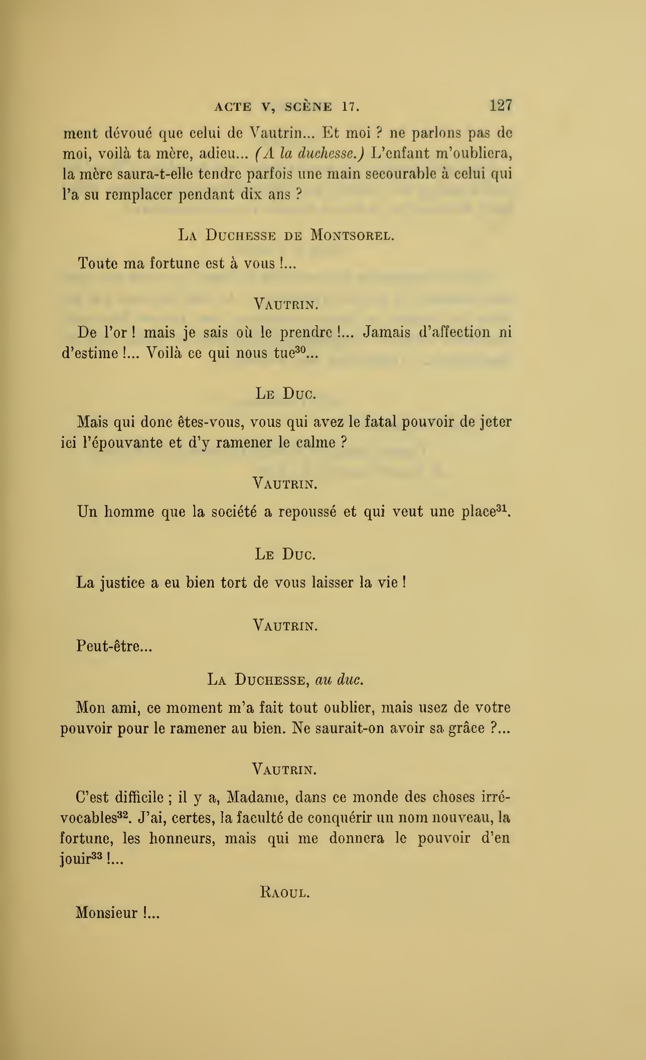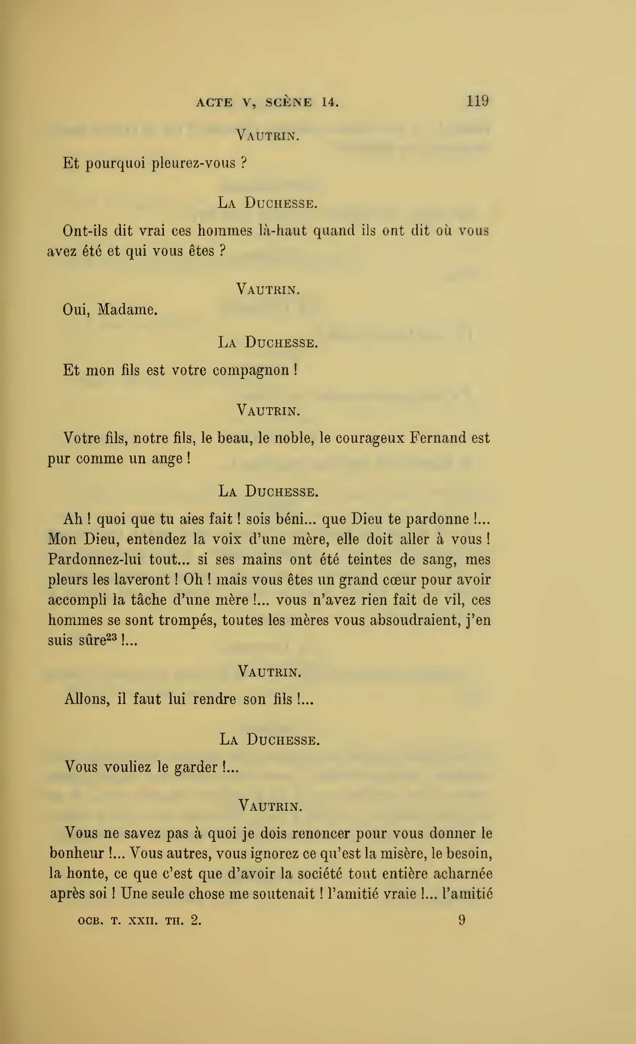 Que vous disais-je ?… (À Raoul.) monsieur le marquis, je vous ai, souvenez-vous-en, absous d’avance de toute ingratitude ; mais dans le monde où vous entrez pour n’en plus sortir vous ne rencontrerez jamais, excepté chez votre mère, un cœur aussi entièrement {p. 127}dévoué que celui de Vautrin… Et moi ? ne parlons pas de moi, voilà ta mère, adieu… (À la duchesse.) L’enfant m’oubliera, la mère saura-t-elle tendre parfois une main secourable à celui qui l’a su remplacer pendant dix ans ?