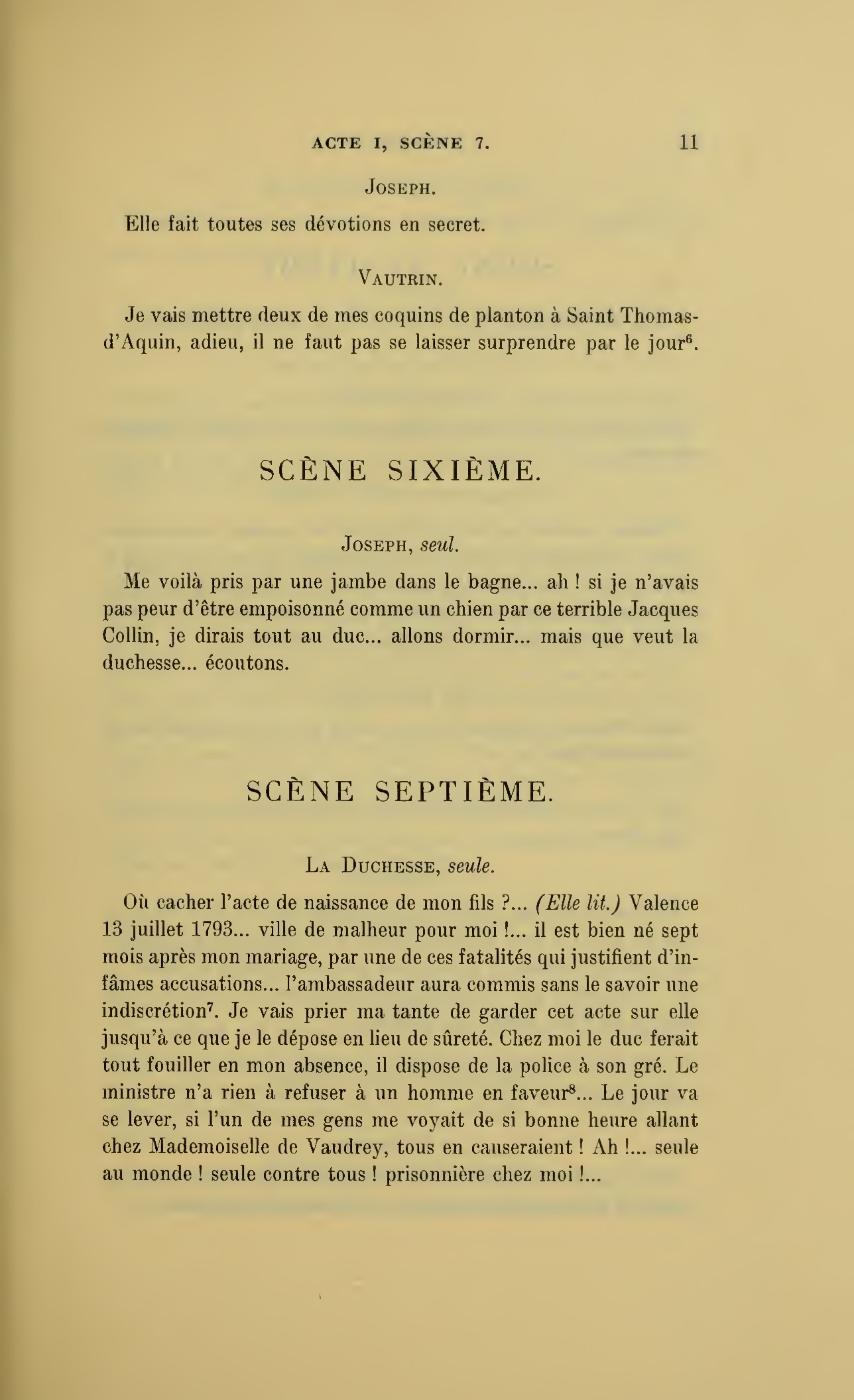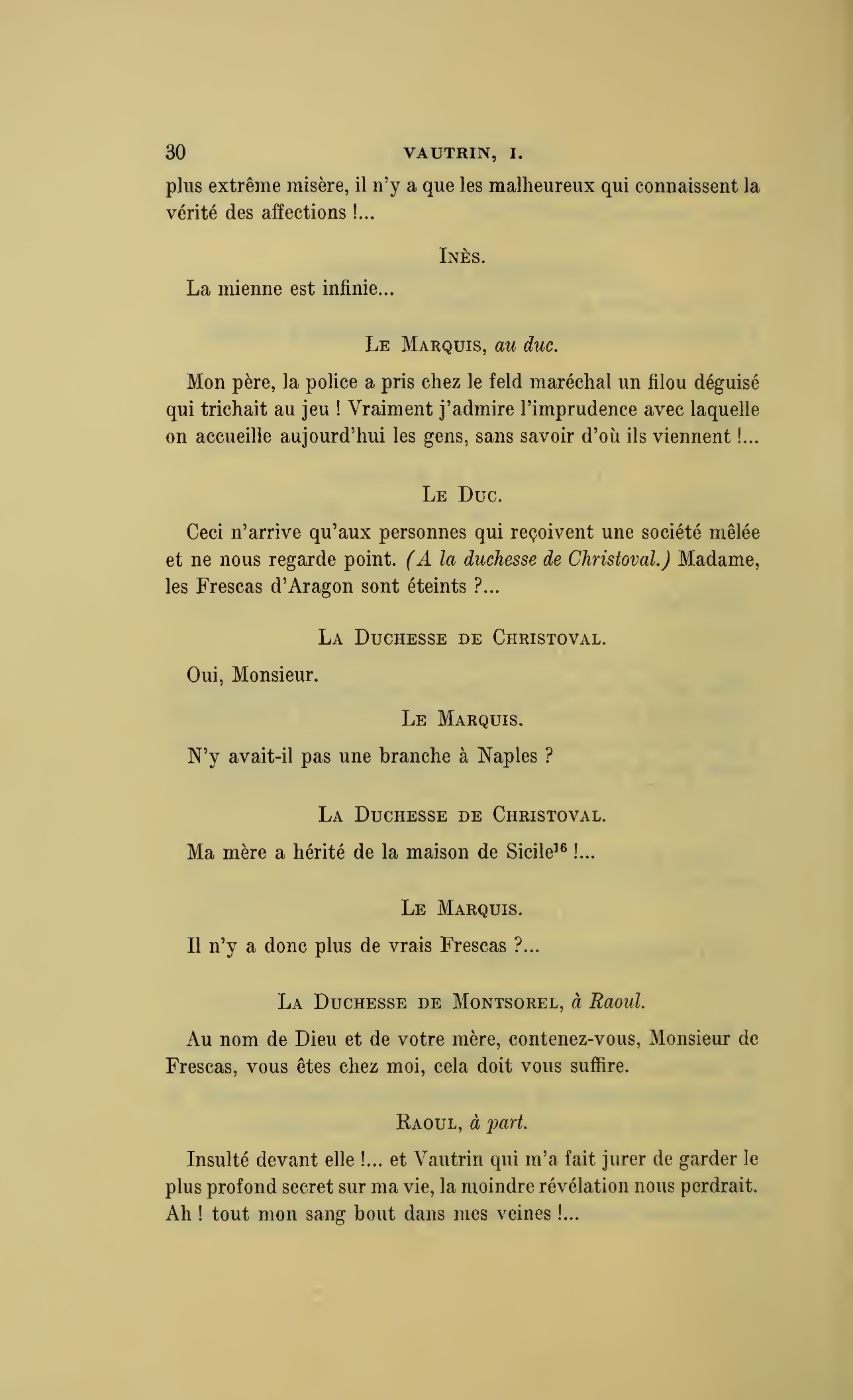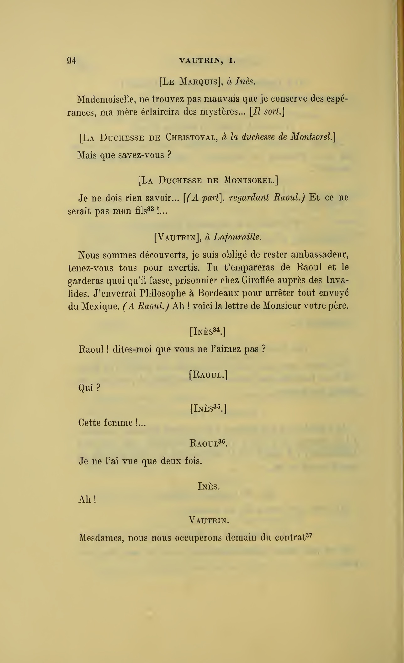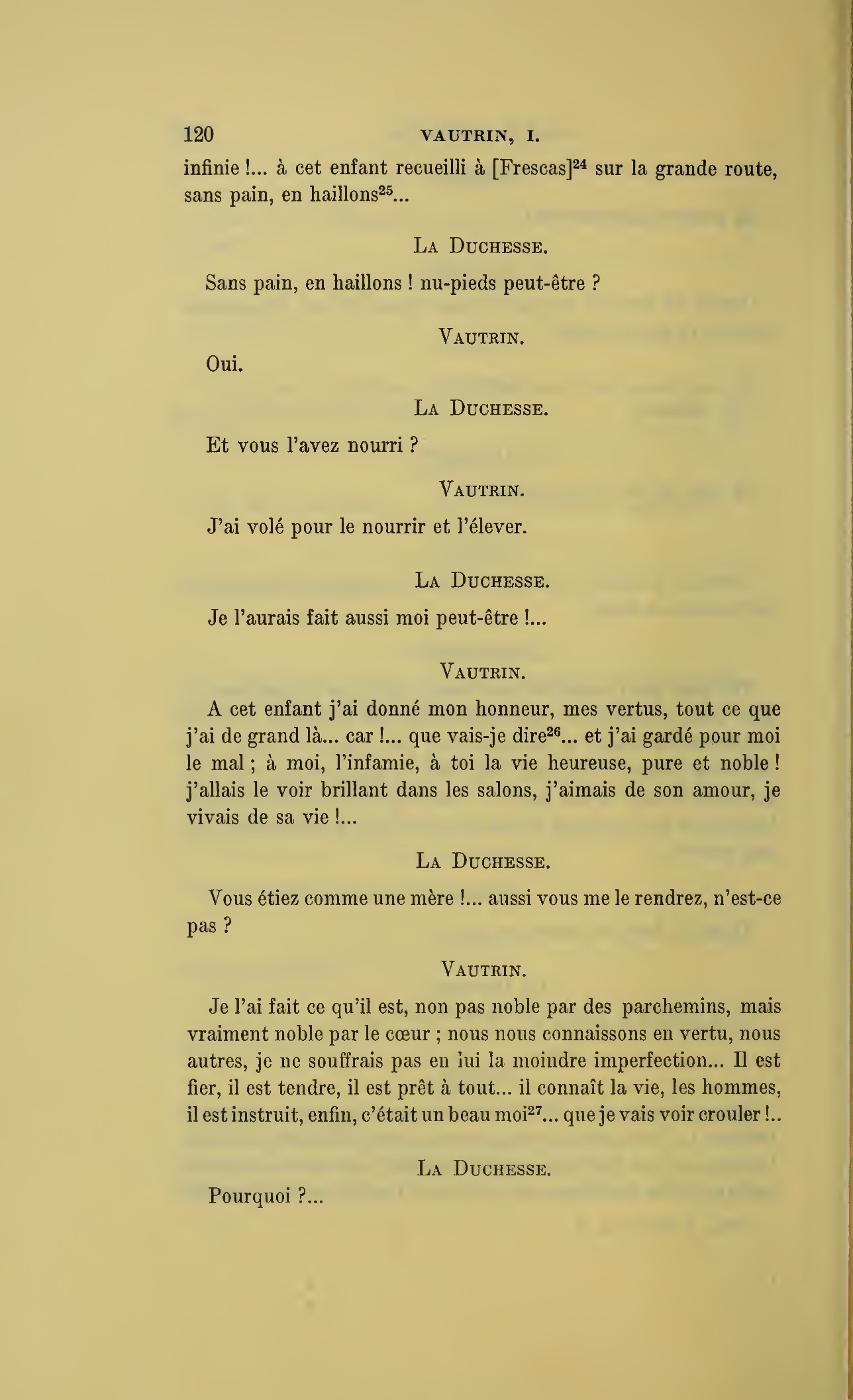 Que vous disais-je ?… (À Raoul.) monsieur le marquis, je vous ai, souvenez-vous-en, absous d’avance de toute ingratitude ; mais dans le monde où vous entrez pour n’en plus sortir vous ne rencontrerez jamais, excepté chez votre mère, un cœur aussi entièrement {p. 127}dévoué que celui de Vautrin… Et moi ? ne parlons pas de moi, voilà ta mère, adieu… (À la duchesse.) L’enfant m’oubliera, la mère saura-t-elle tendre parfois une main secourable à celui qui l’a su remplacer pendant dix ans ?