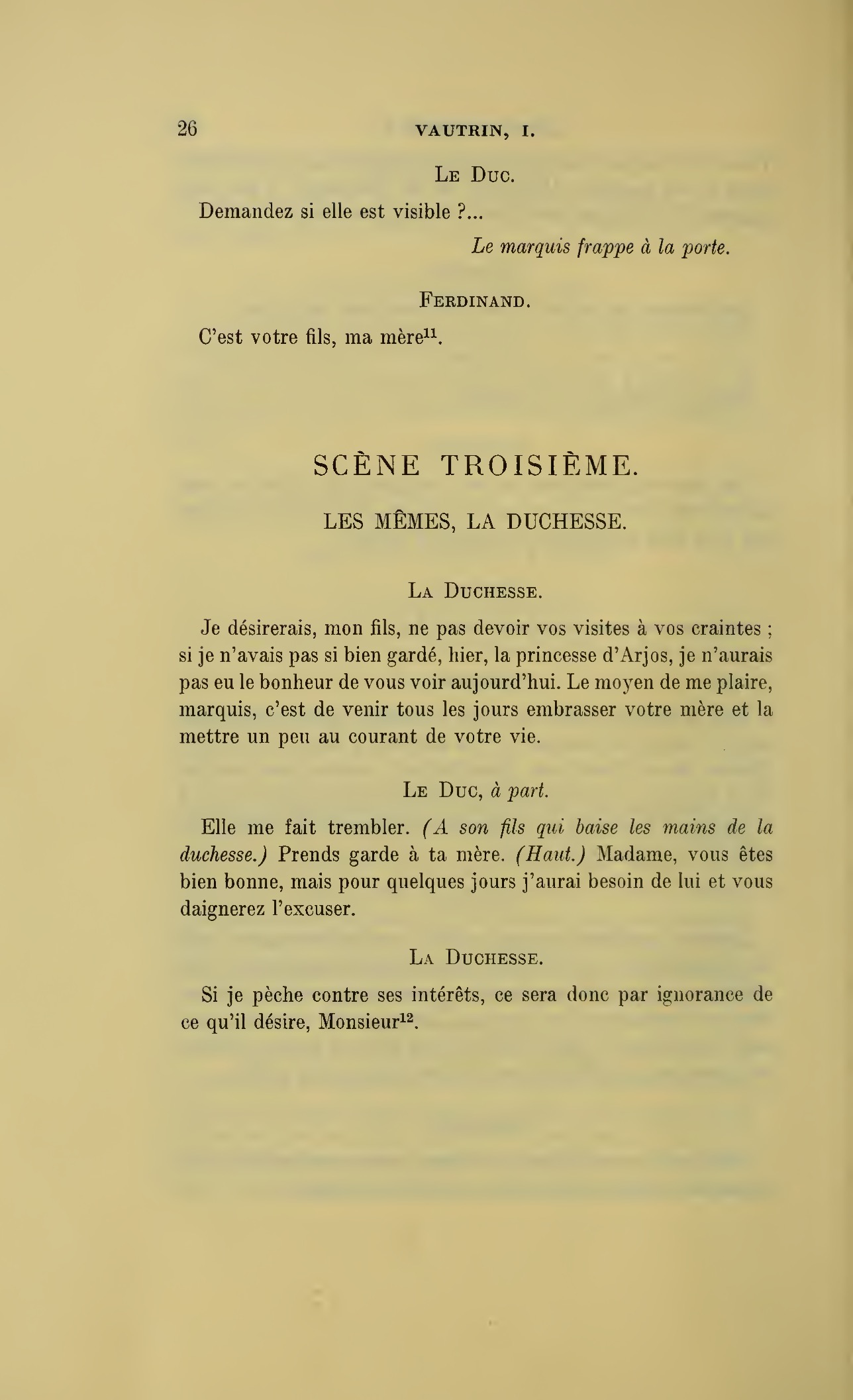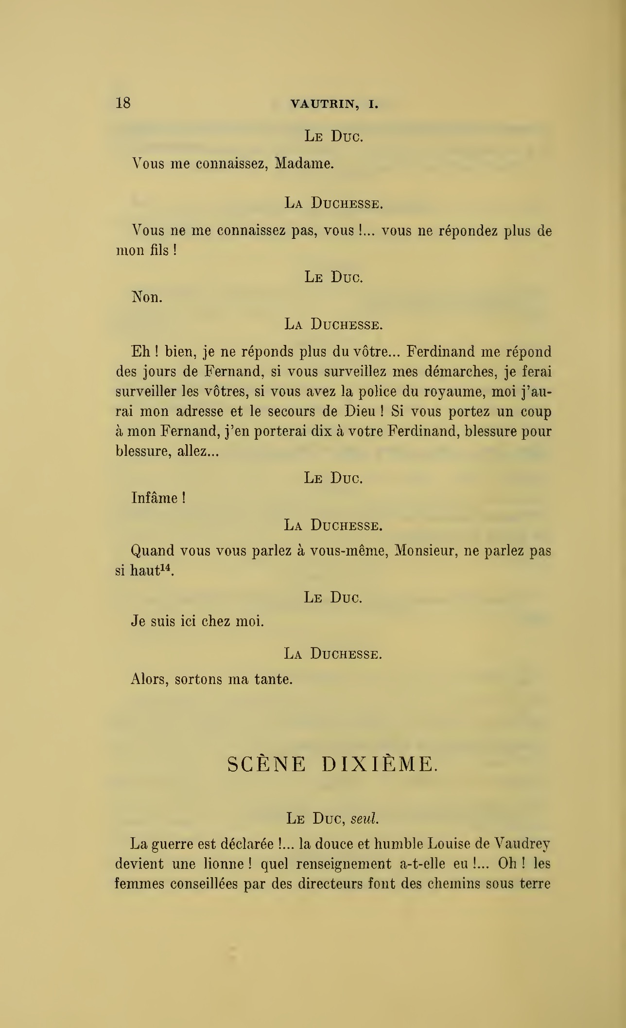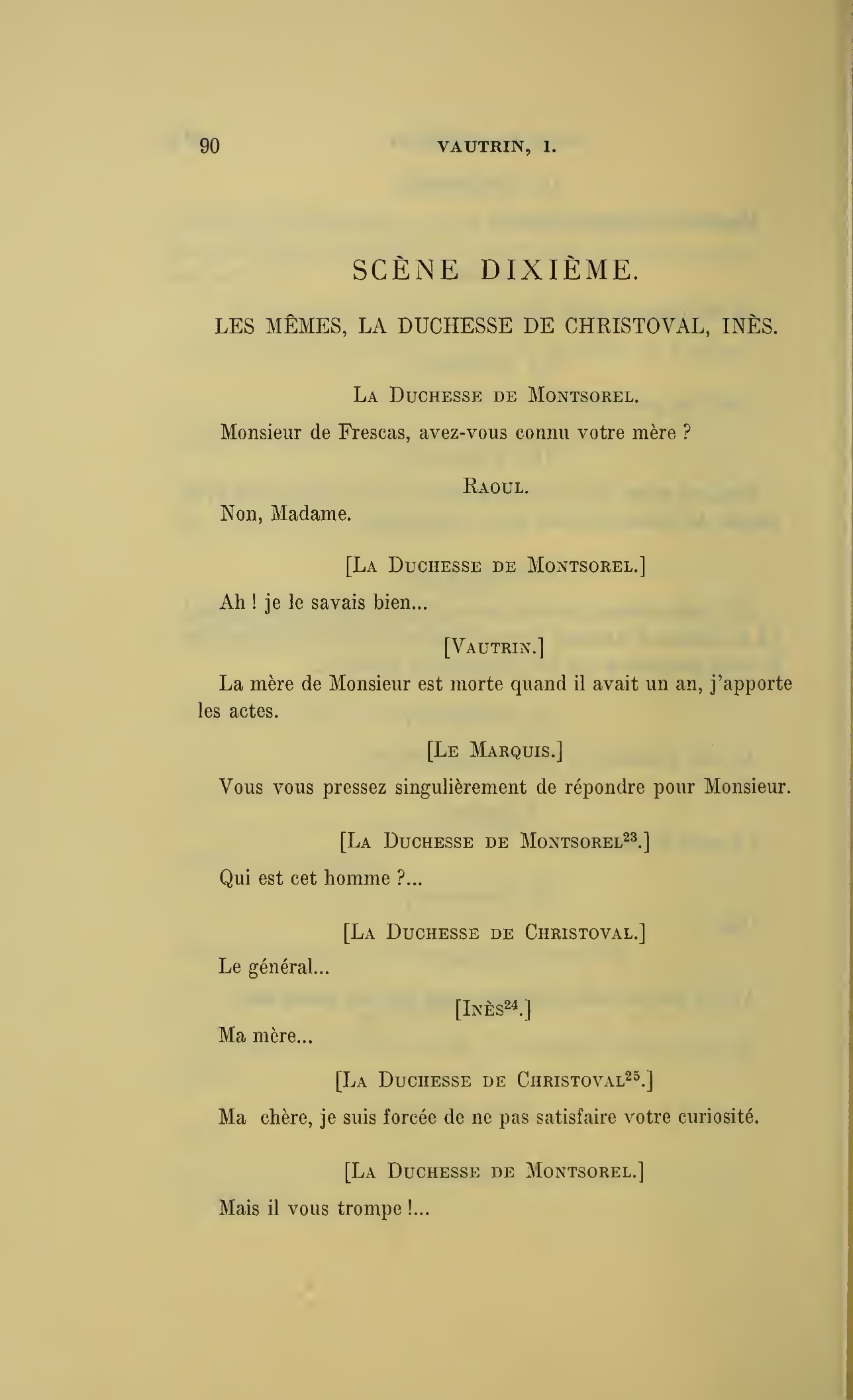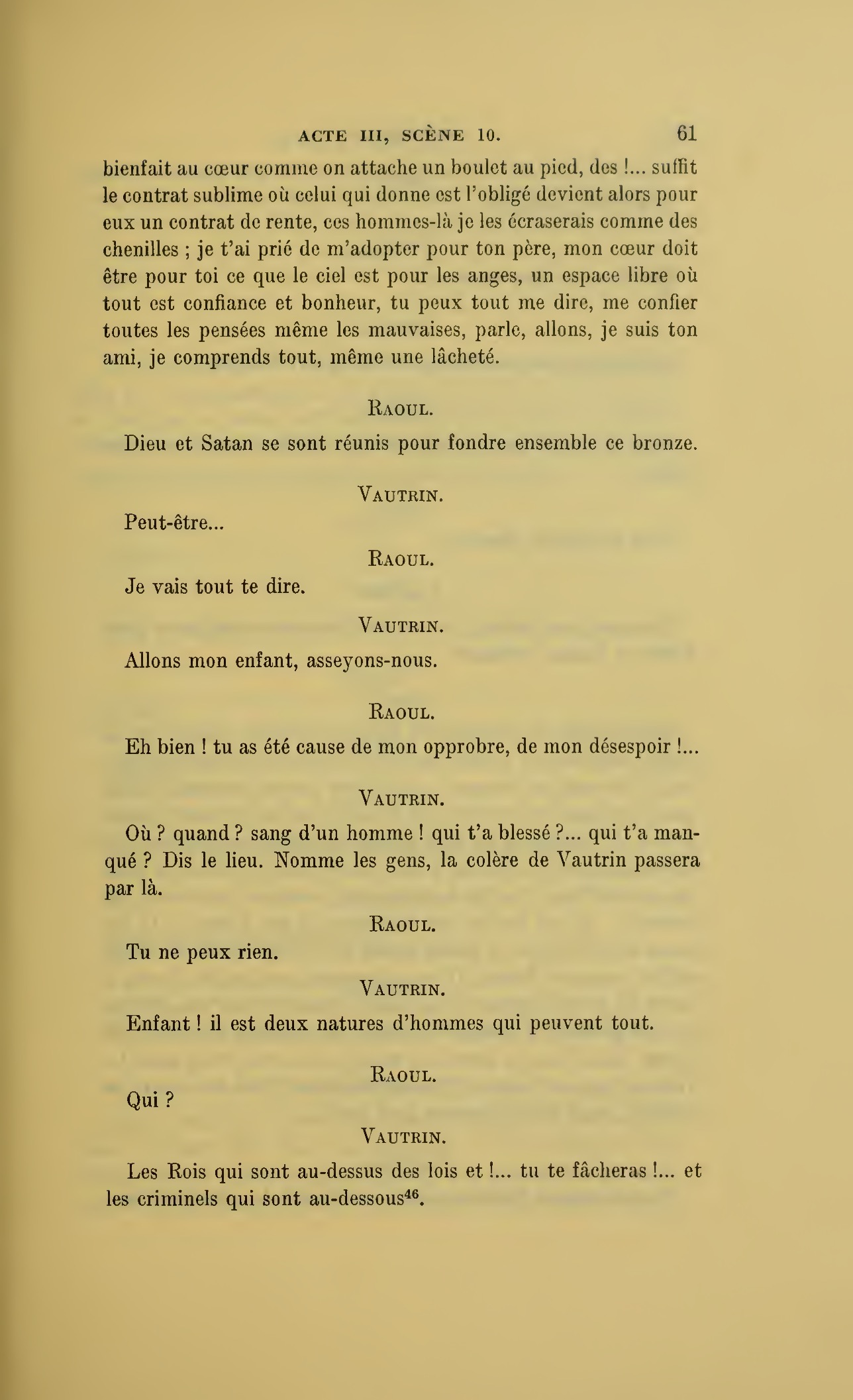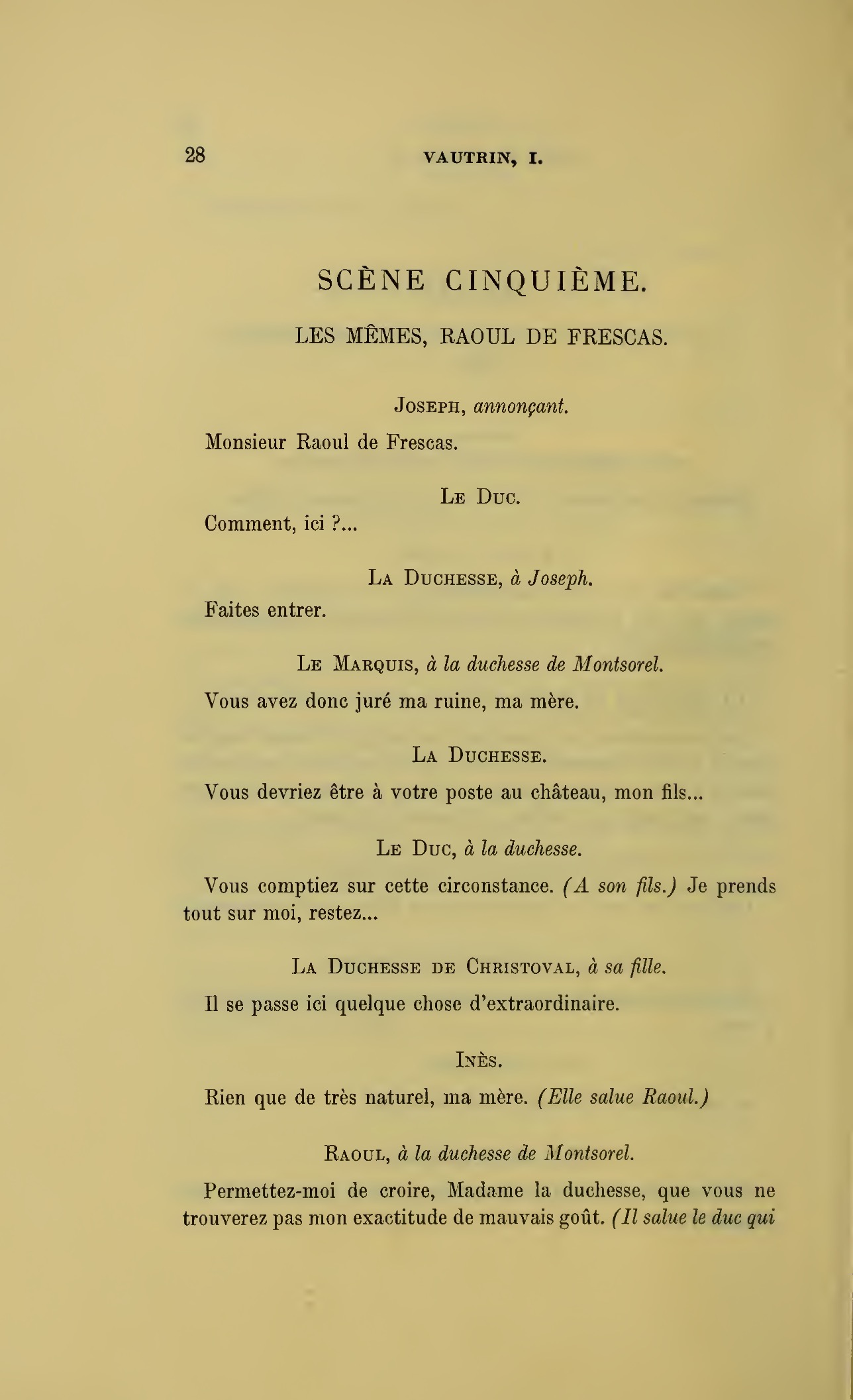 Que vous disais-je ?… (À Raoul.) monsieur le marquis, je vous ai, souvenez-vous-en, absous d’avance de toute ingratitude ; mais dans le monde où vous entrez pour n’en plus sortir vous ne rencontrerez jamais, excepté chez votre mère, un cœur aussi entièrement {p. 127}dévoué que celui de Vautrin… Et moi ? ne parlons pas de moi, voilà ta mère, adieu… (À la duchesse.) L’enfant m’oubliera, la mère saura-t-elle tendre parfois une main secourable à celui qui l’a su remplacer pendant dix ans ?