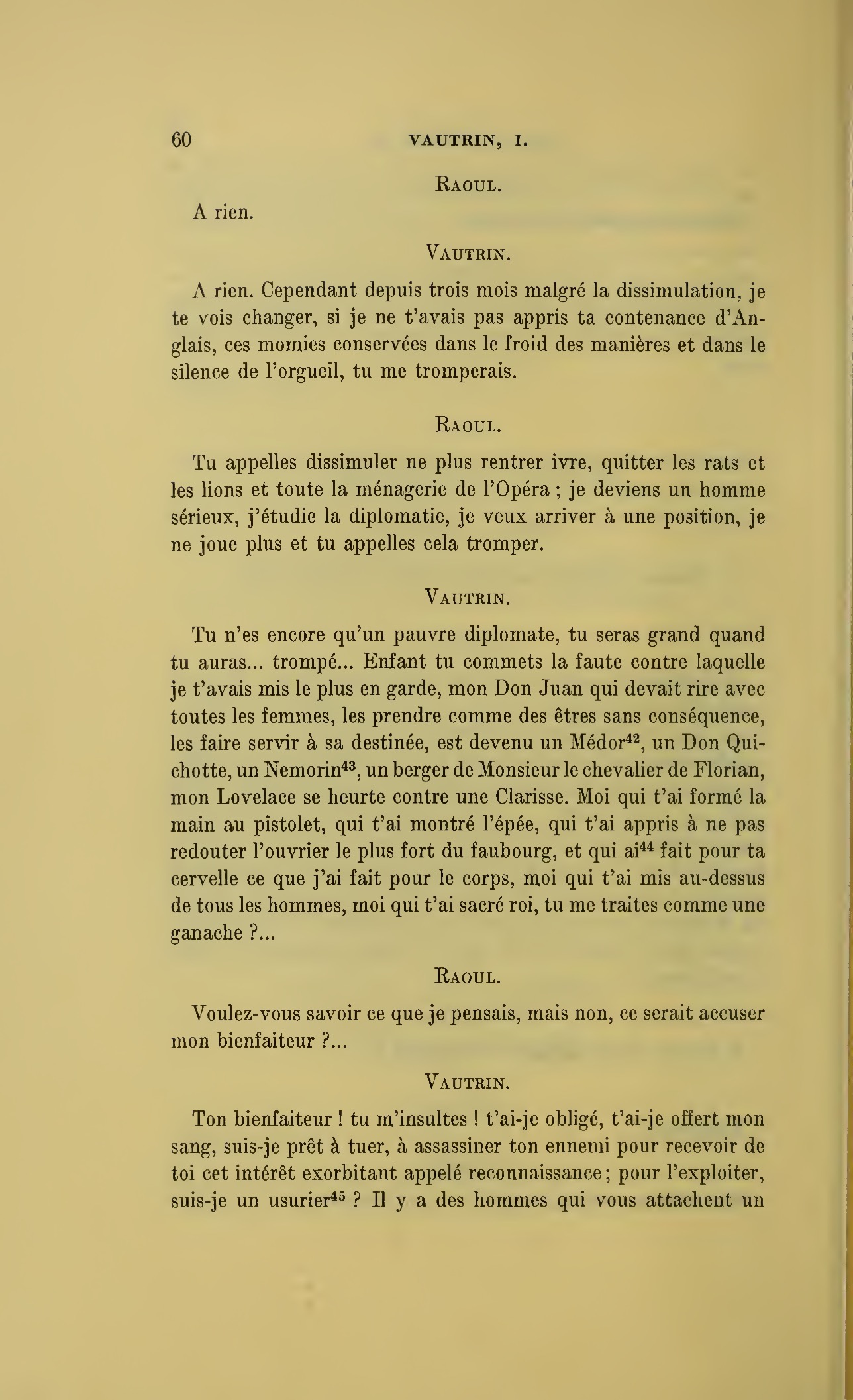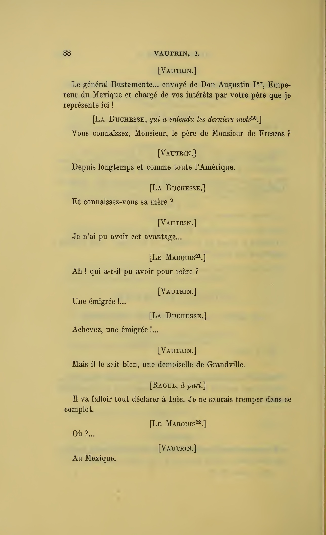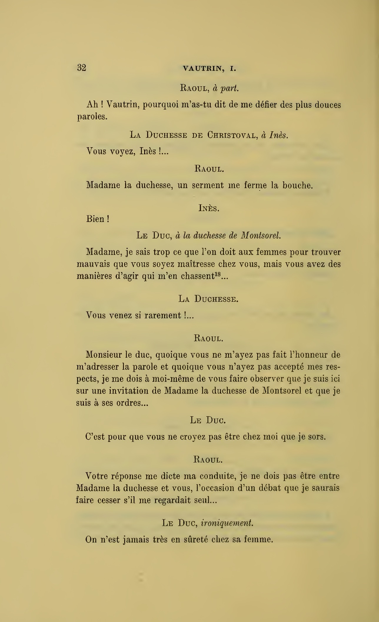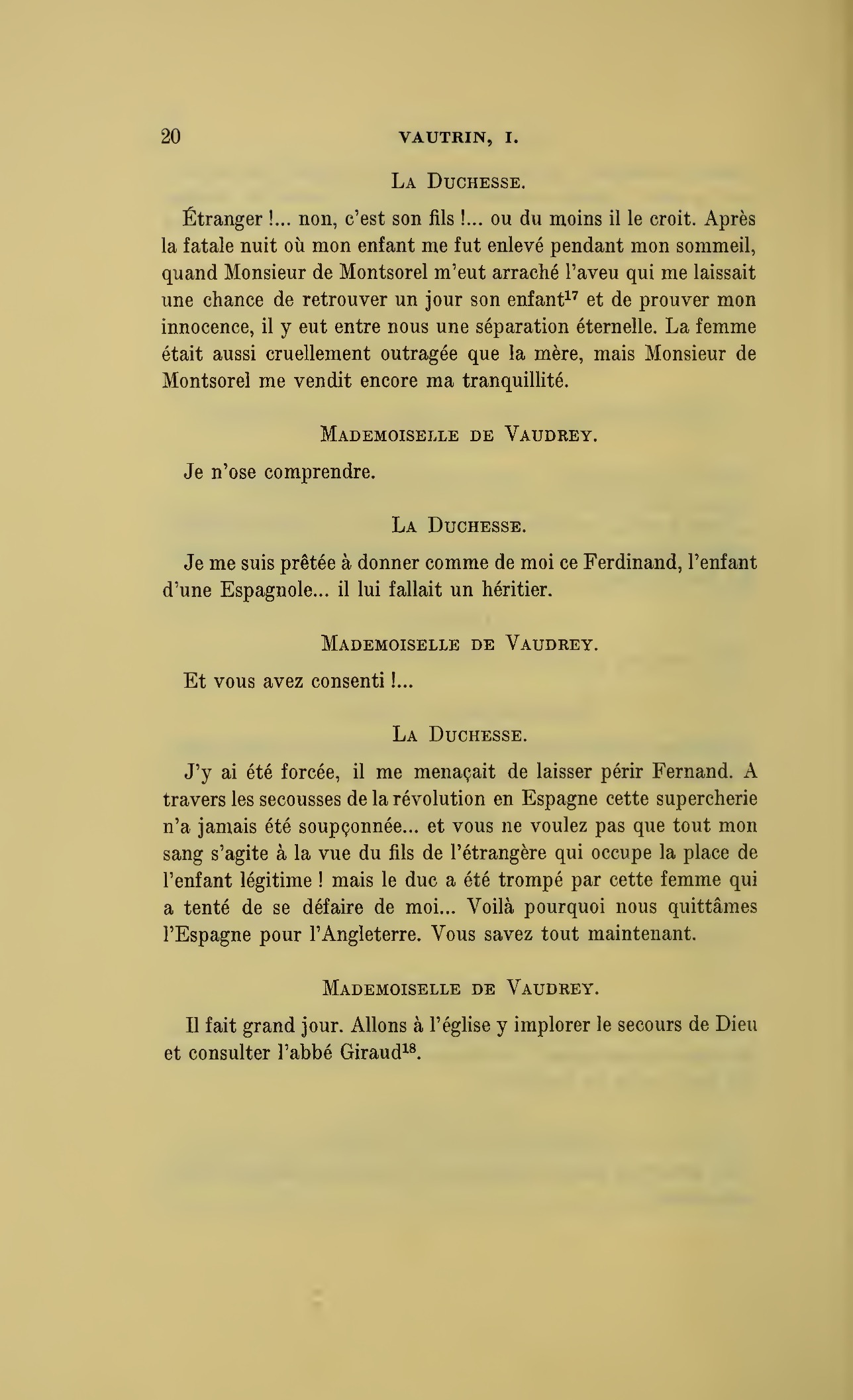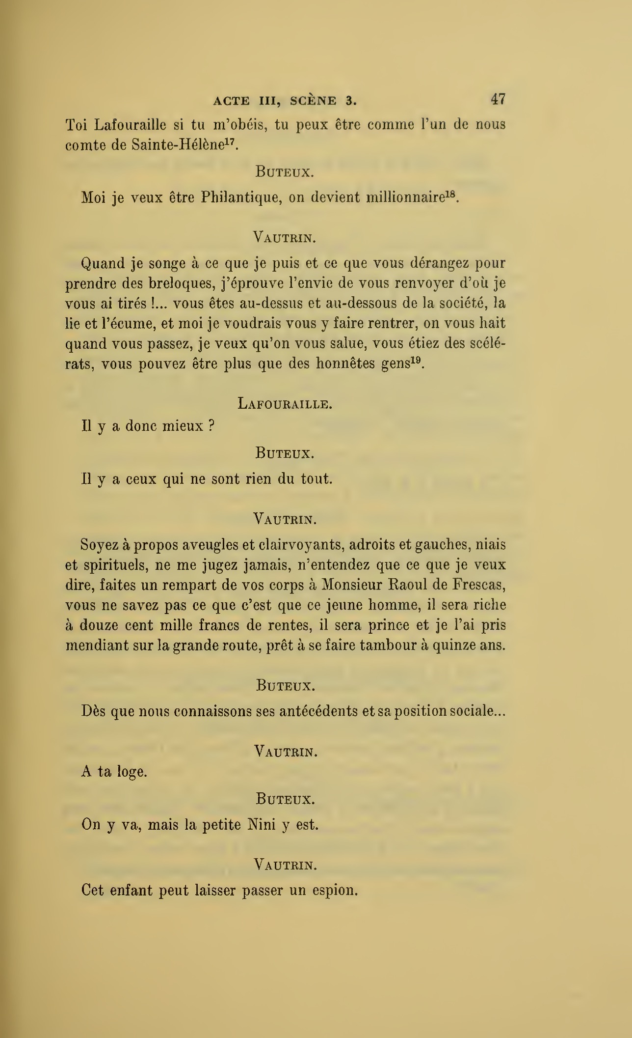 Que vous disais-je ?… (À Raoul.) monsieur le marquis, je vous ai, souvenez-vous-en, absous d’avance de toute ingratitude ; mais dans le monde où vous entrez pour n’en plus sortir vous ne rencontrerez jamais, excepté chez votre mère, un cœur aussi entièrement {p. 127}dévoué que celui de Vautrin… Et moi ? ne parlons pas de moi, voilà ta mère, adieu… (À la duchesse.) L’enfant m’oubliera, la mère saura-t-elle tendre parfois une main secourable à celui qui l’a su remplacer pendant dix ans ?
