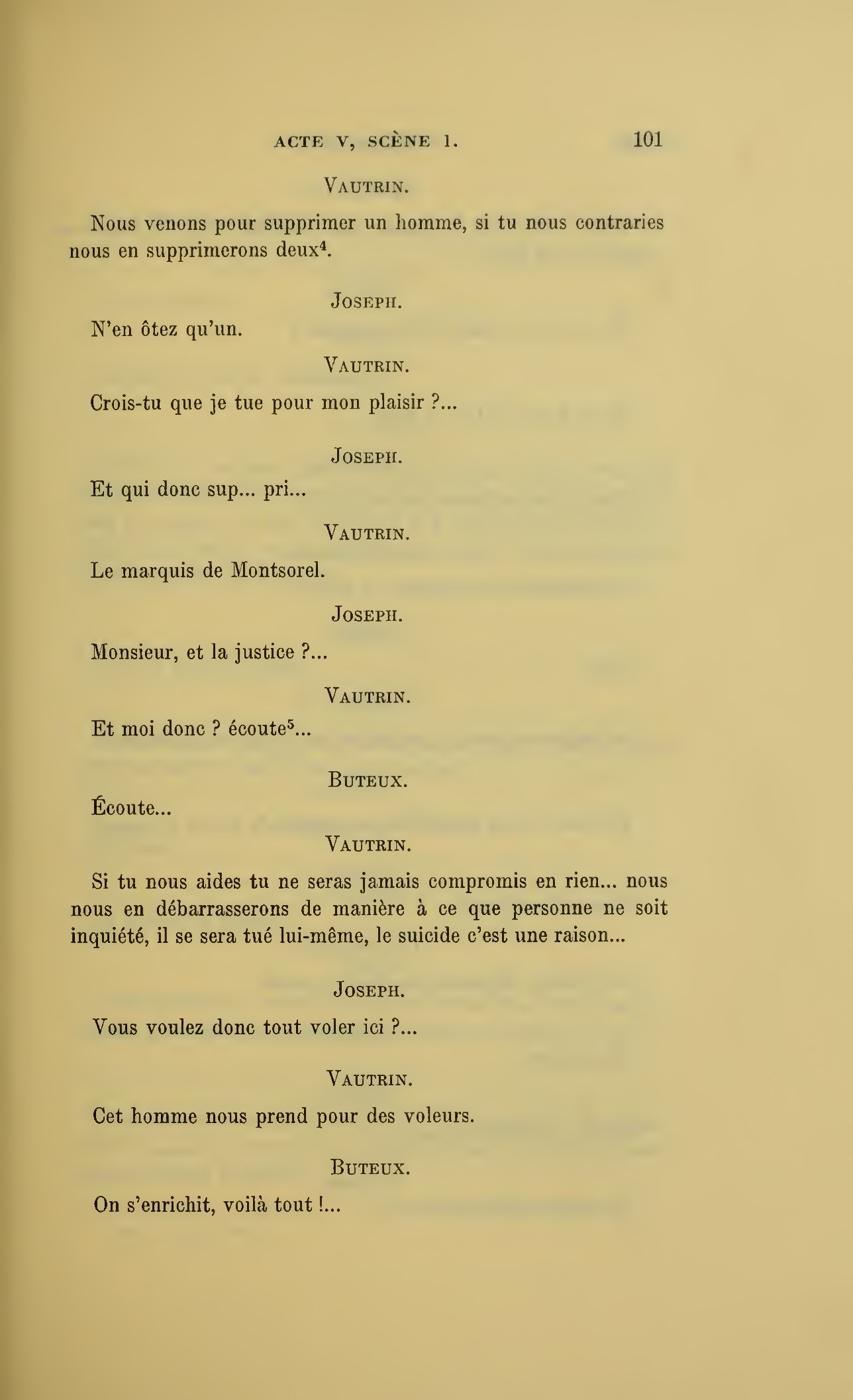Vous voyez bien qu’il y a trop de monde ici, ce n’est pas moi, c’est la nécessité qui commande… voici mes armes… (Il s’adresse à Buteux et à Lafouraille.) En avez-vous, vous autres ?