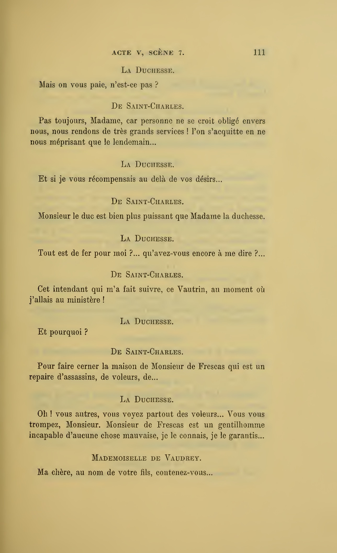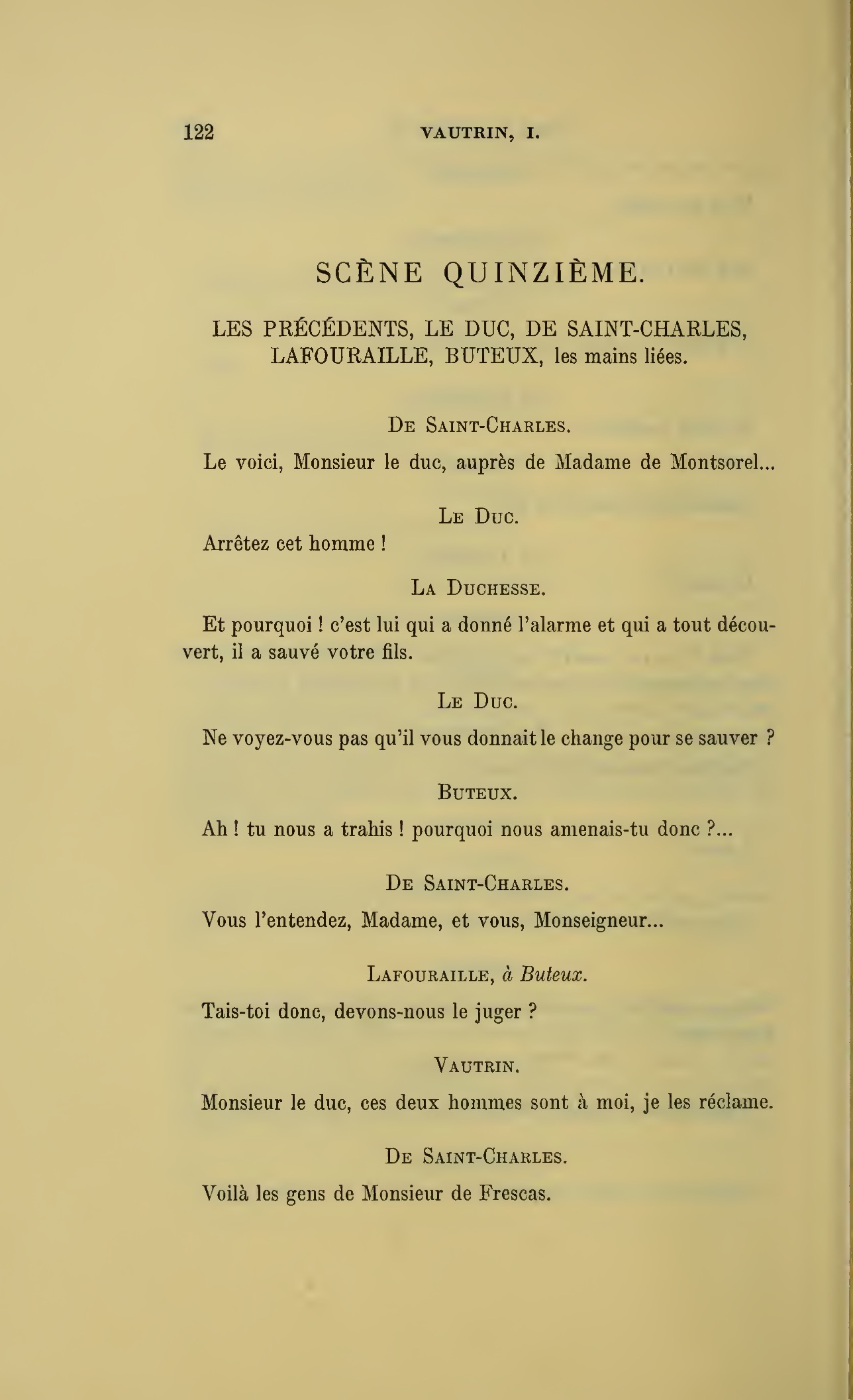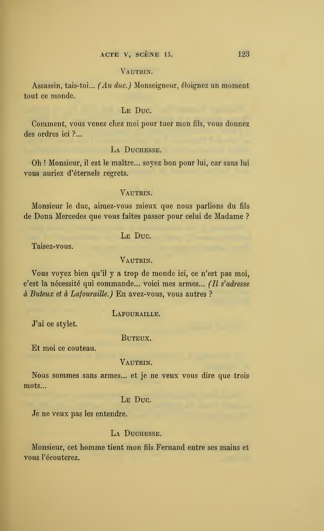 {p. 123} Assassin, tais-toi… (Au duc.) Monseigneur, éloignez un moment tout ce monde.