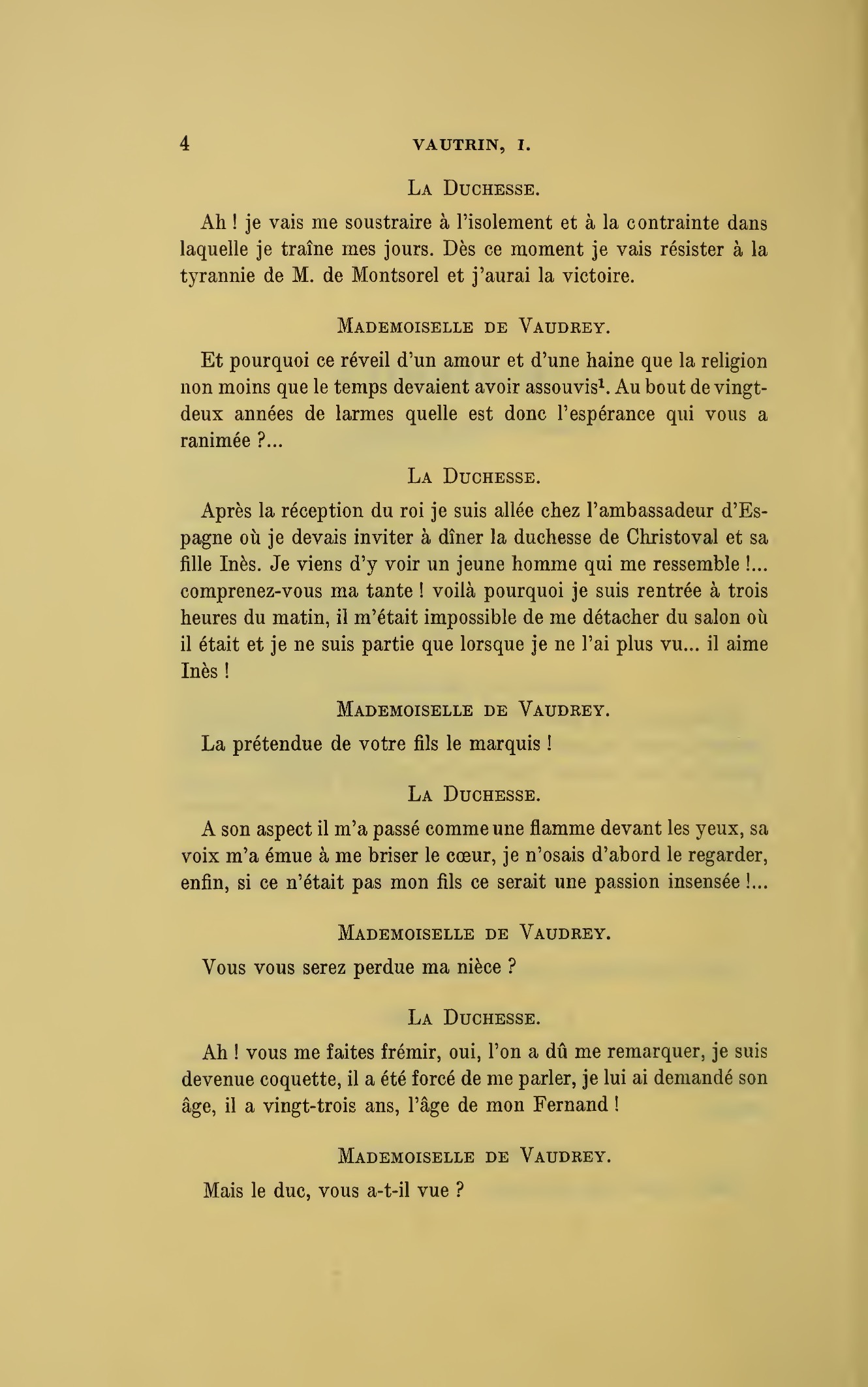 {p. 4} Ah ! je vais me soustraire à l’isolement et à la contrainte dans laquelle je traîne mes jours. Dès ce moment je vais résister à la tyrannie de monsieur de Montsorel et j’aurai la victoire.