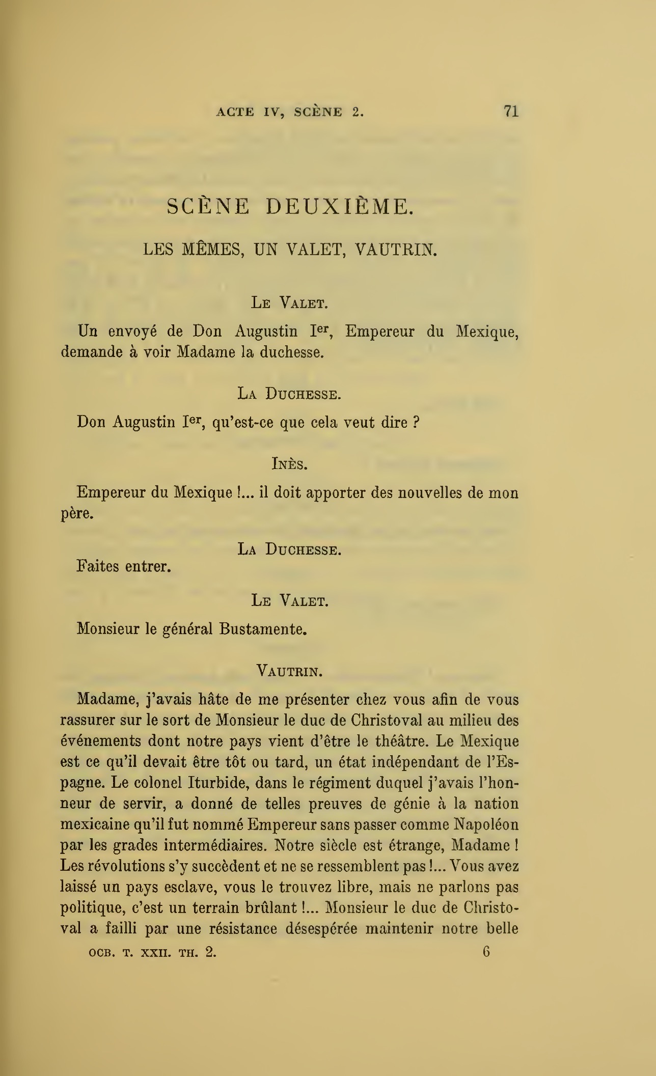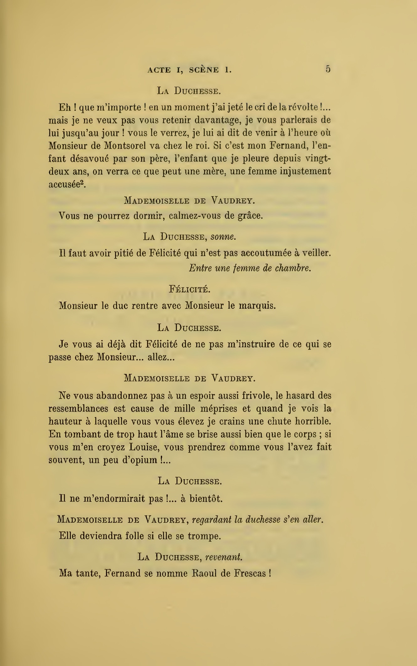{p. 7} Un jeune homme pour elle ! vieille sibylle ! elle croit que je vais donner dans ce panneau ! j’étais bien sûre que madame devait avoir un sentiment à Paris ! Ah ! Madame la duchesse ! si elle voulait, elle est riche, je la protégerais et le duc n’y verrait que du feu ! la vieille va tout prendre sur son compte ! comme tout est changé ! ma mère disait que les femmes de chambre autrefois étaient une puissance dans les grandes maisons, et je ne suis rien ici, je déroge ! mais nous verrons ! (La porte s’ouvre, on voit deux hommes, elle se referme aussitôt.) Nous verrons ce jeune homme.