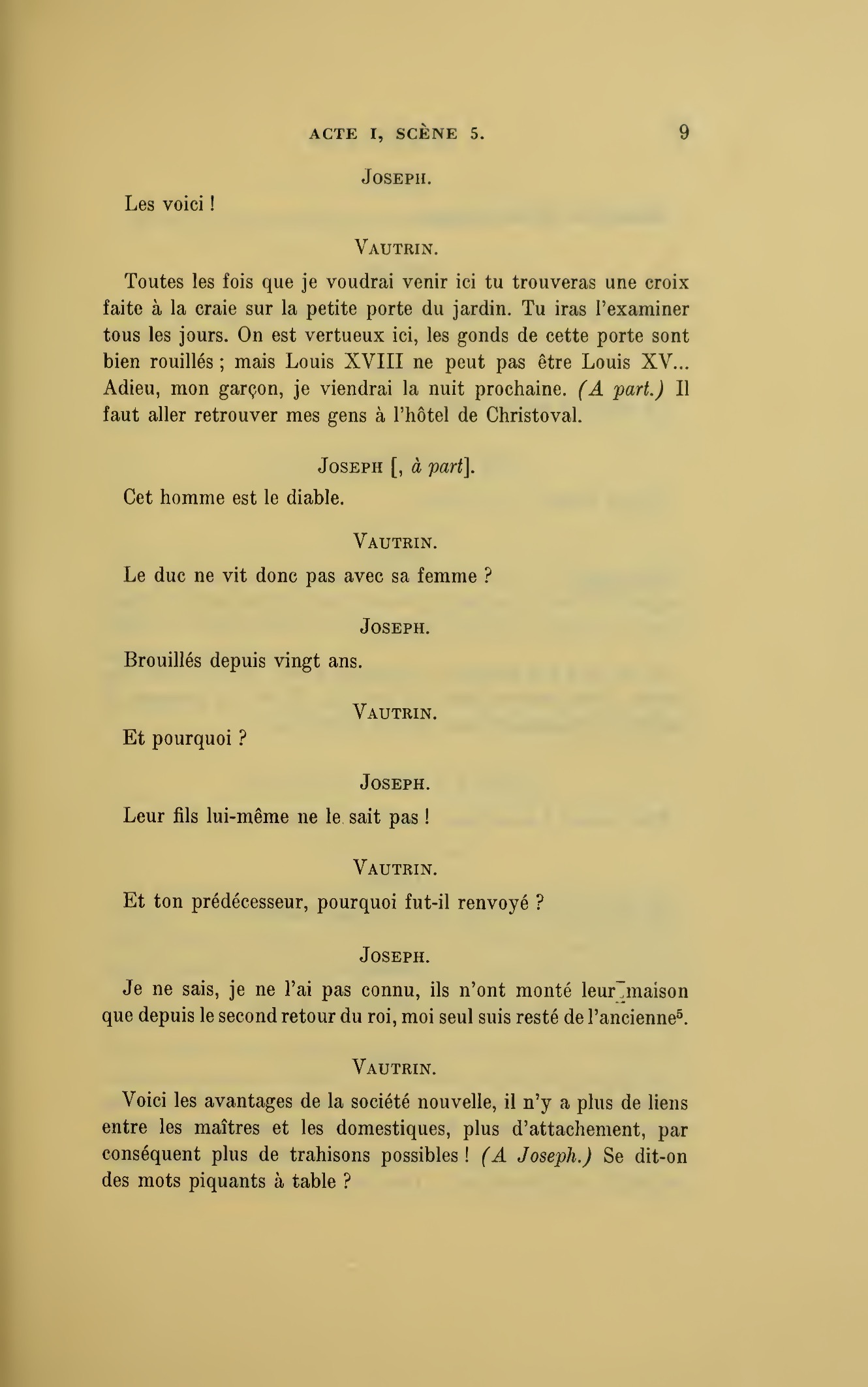 Toutes les fois que je voudrai venir ici tu trouveras une croix faite à la craie sur la petite porte du jardin. Tu iras l’examiner tous les jours. On est vertueux ici, les gonds de cette porte sont bien rouilles ; mais Louis XVIII ne peut pas être Louis XV… Adieu, mon garçon, je viendrai la nuit prochaine. (À part.) Il faut aller retrouver mes gens à l’hôtel de Christoval.