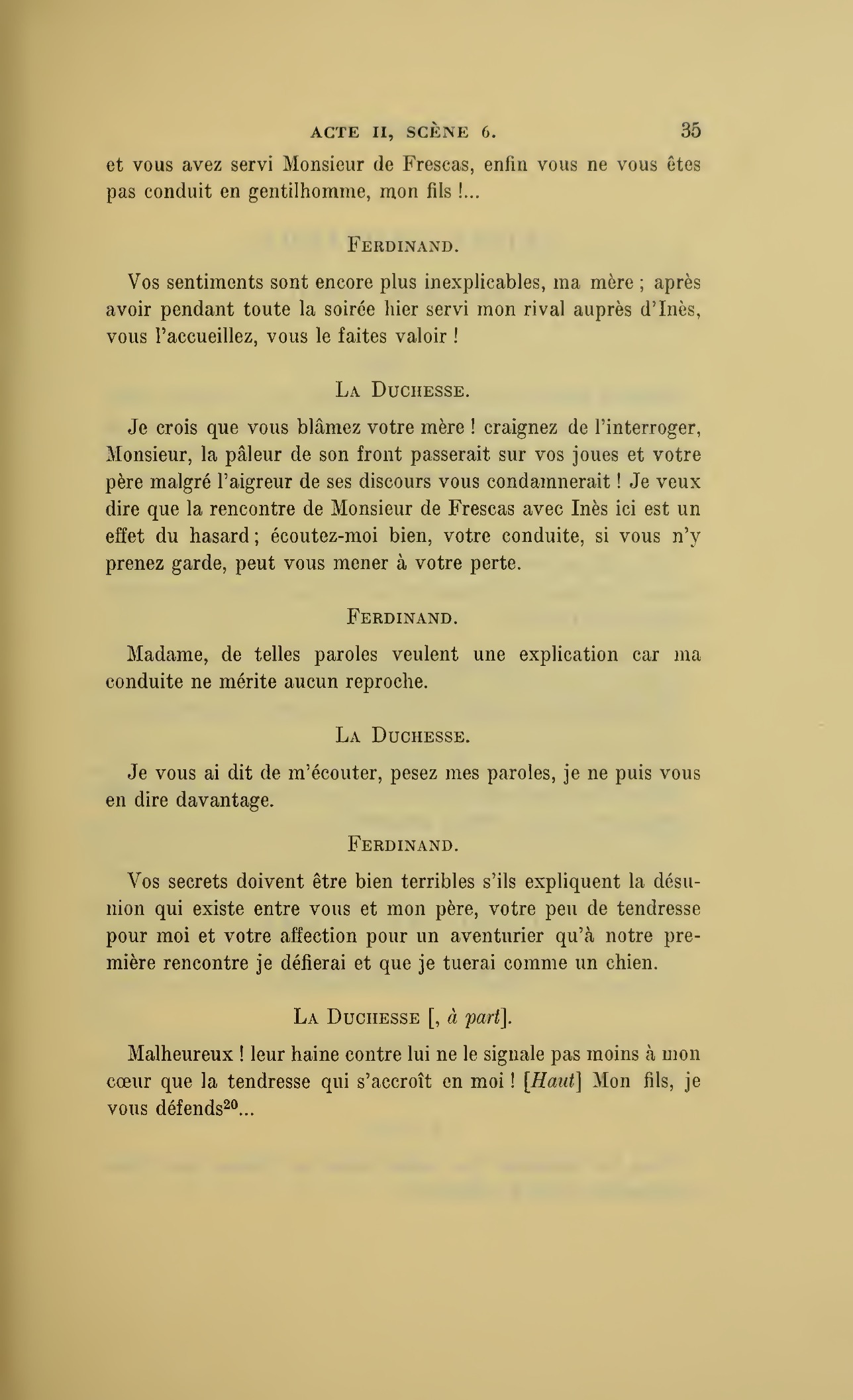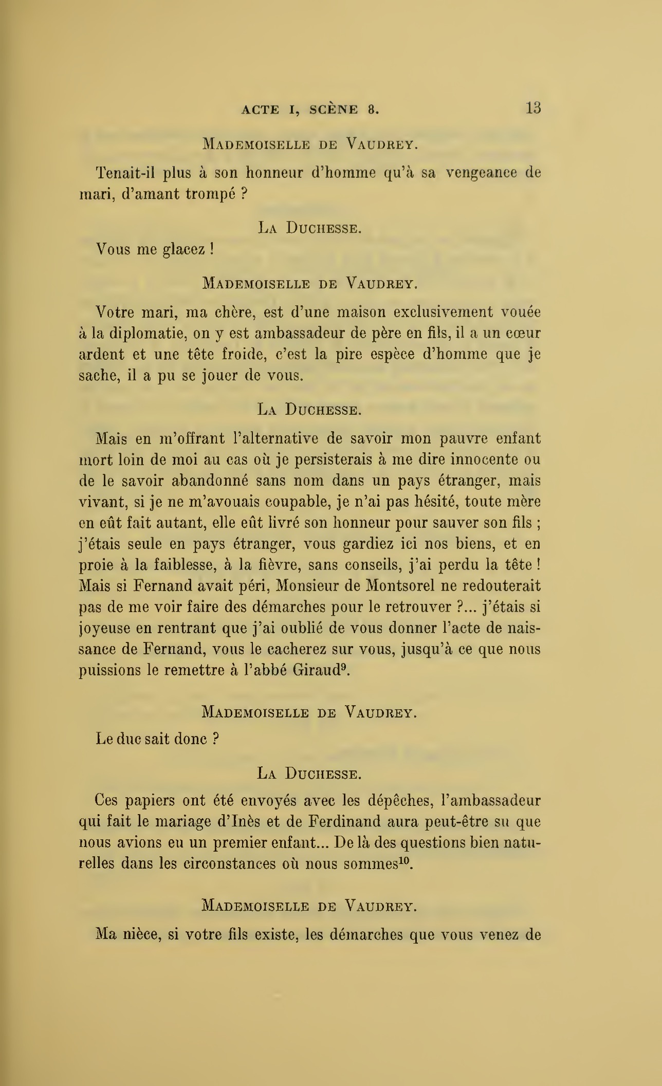 Vous vous expliquerez mon amour pour vous quand vous saurez que vous êtes mon fils ; oh ! laissez-moi vous voir, non, je ne te rêvais pas plus beau, mon Fernand… ni plus noble, ni plus généreux. Inès, voici le marquis de Montsorel ; l’enfant que monsieur le duc et moi nous cherchions et qui nous fut bien malheureusement enlevé…