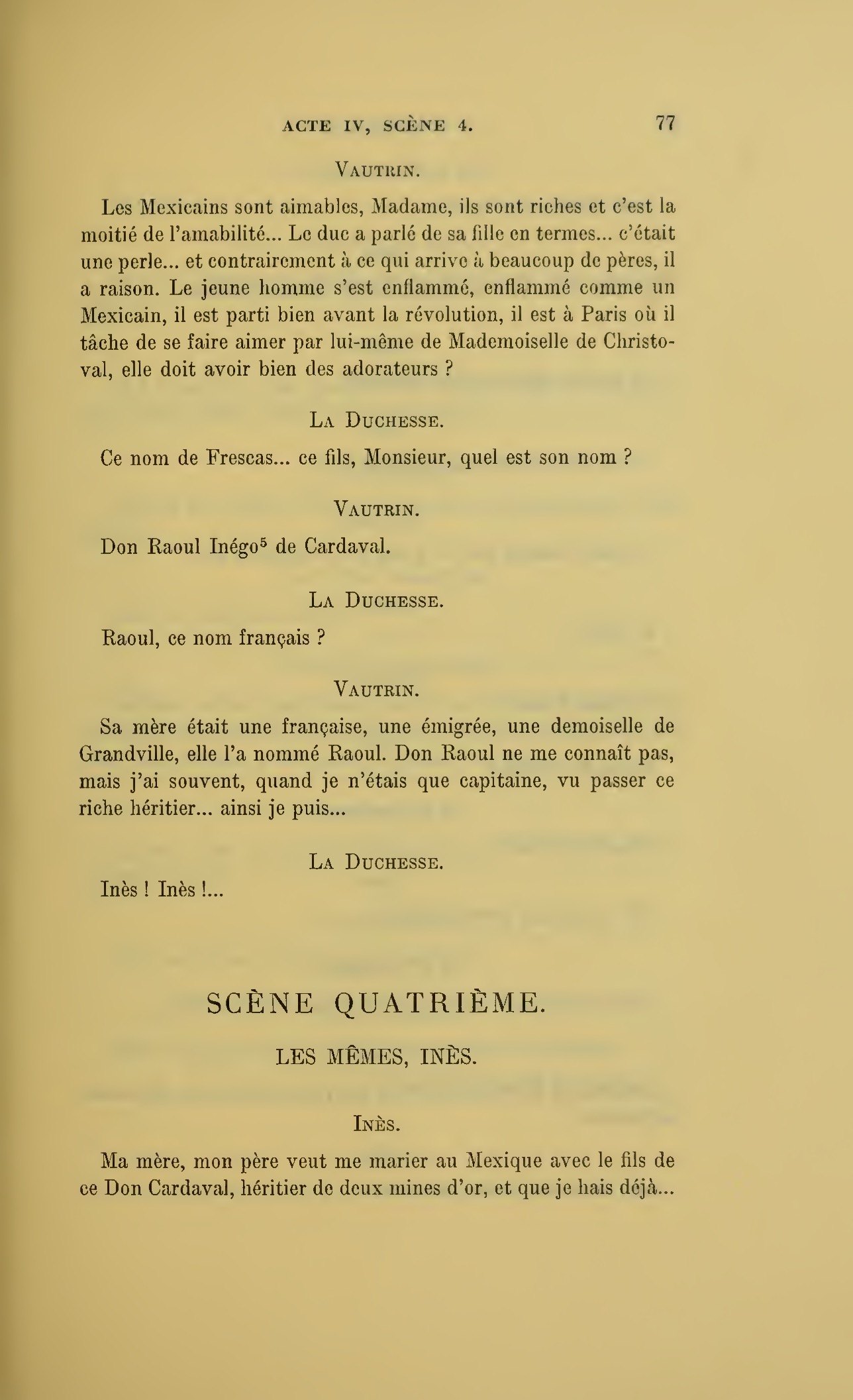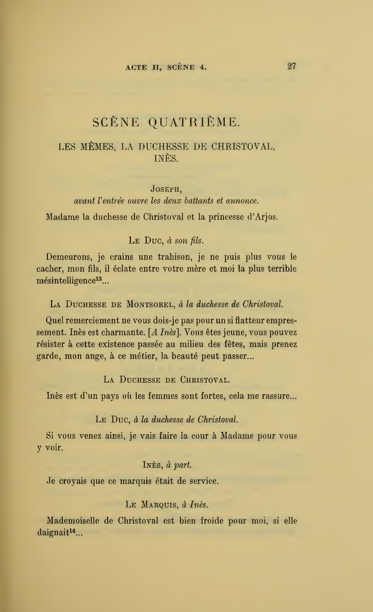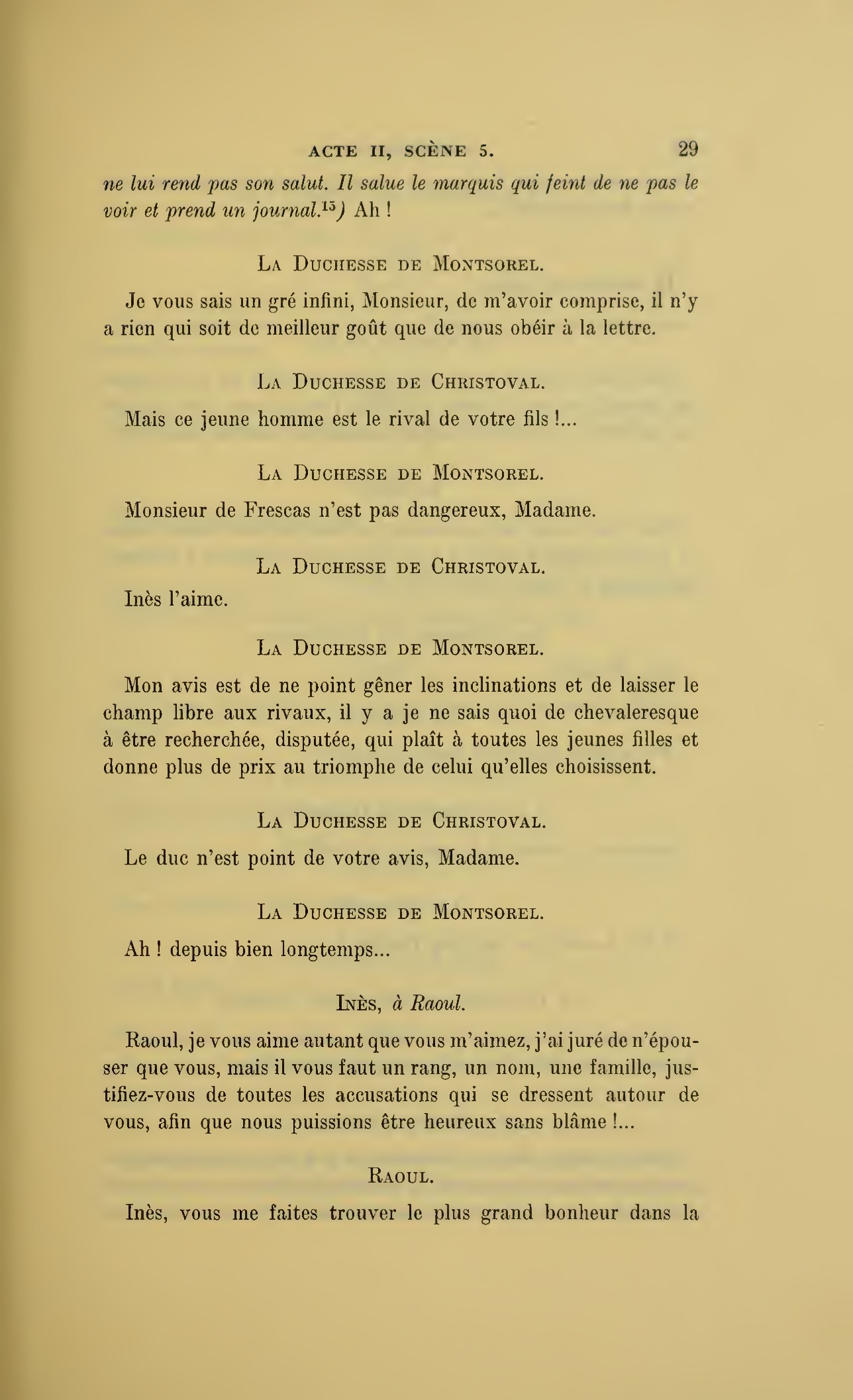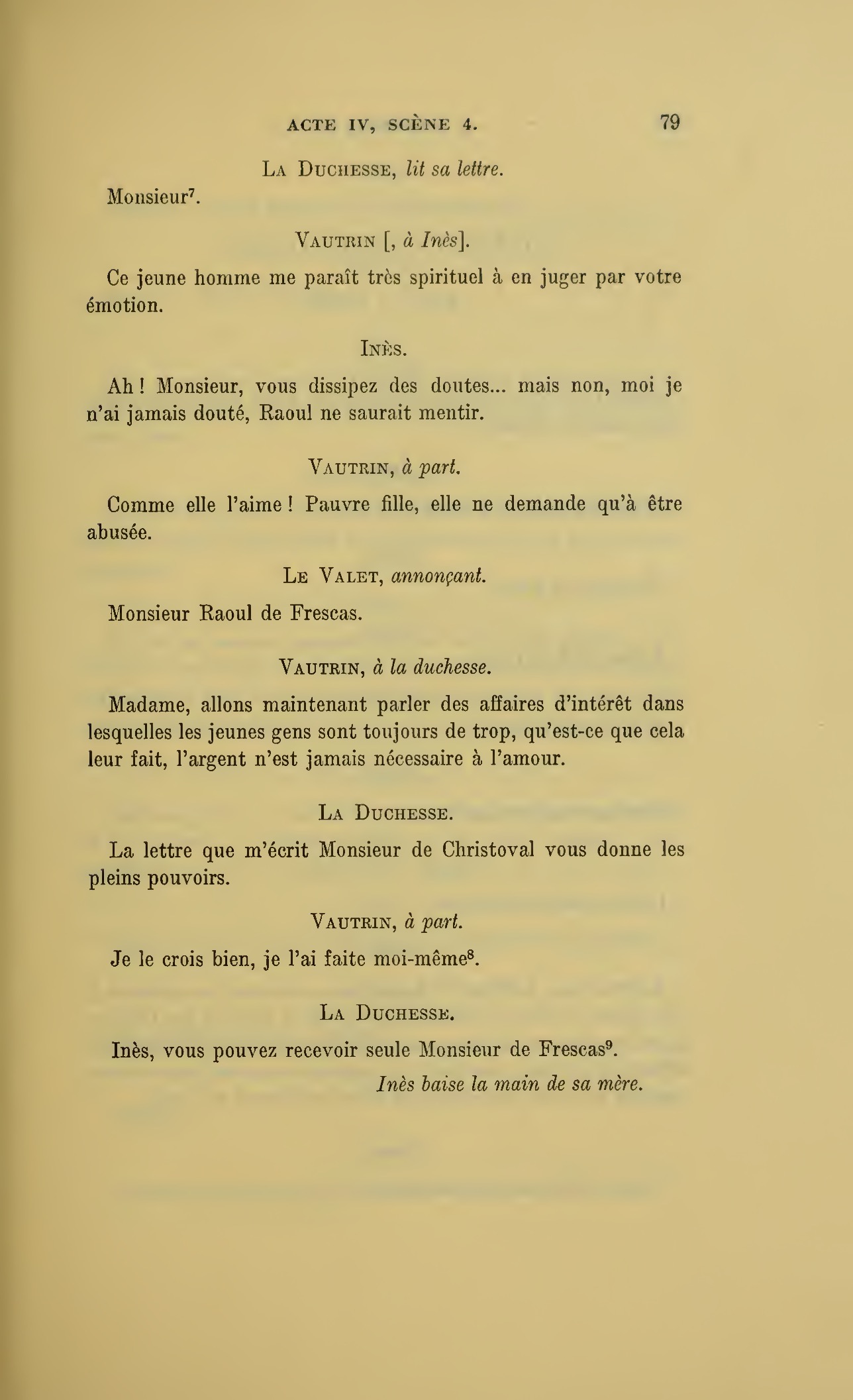 Ma fille a reçu, madame, la lettre de monsieur de Frescas où ce noble jeune homme aime mieux renoncer à Inès que de nous tromper ; il nous a raconté toute sa vie, mais il doit se battre demain avec monsieur le marquis et nous venons vous prier d’empêcher un duel qui n’a plus aucun motif.