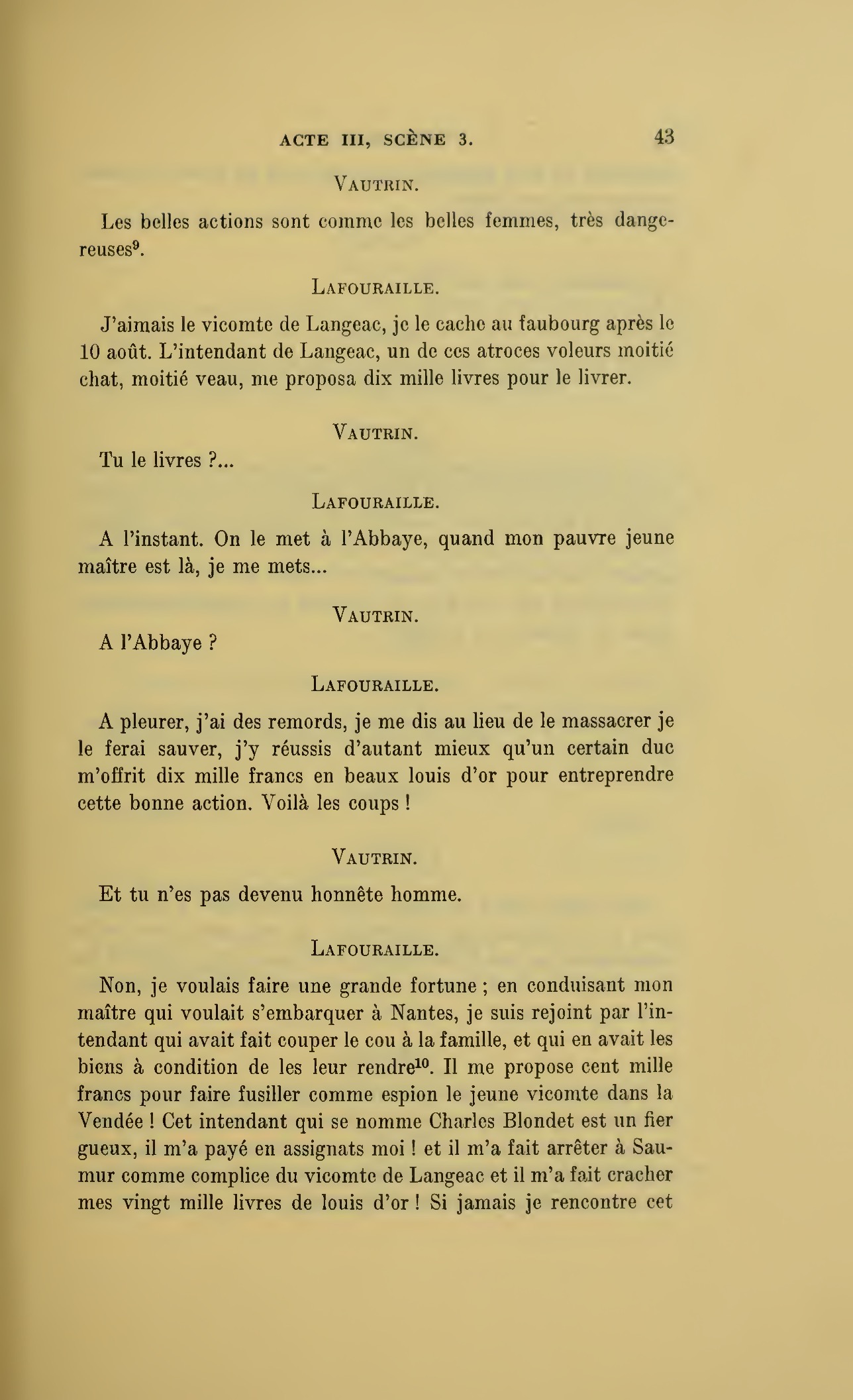Monsieur, l’homme dont vous vous êtes servi là… se nomme Charles Blondet, il a dévoré la maison de Langeac tout entière, il a trahi votre ami le vicomte de Langeac et au lieu de protéger sa fuite de l’Abbaye où il est resté prisonnier trois mois, il l’a fait fusiller à Saumur trois mois avant votre mariage ; saisissez-vous le sens de ces dates !… J’ai sur moi les actes et j’ai des témoins, car voici Philippe Boulard, le domestique de monsieur de Langeac.