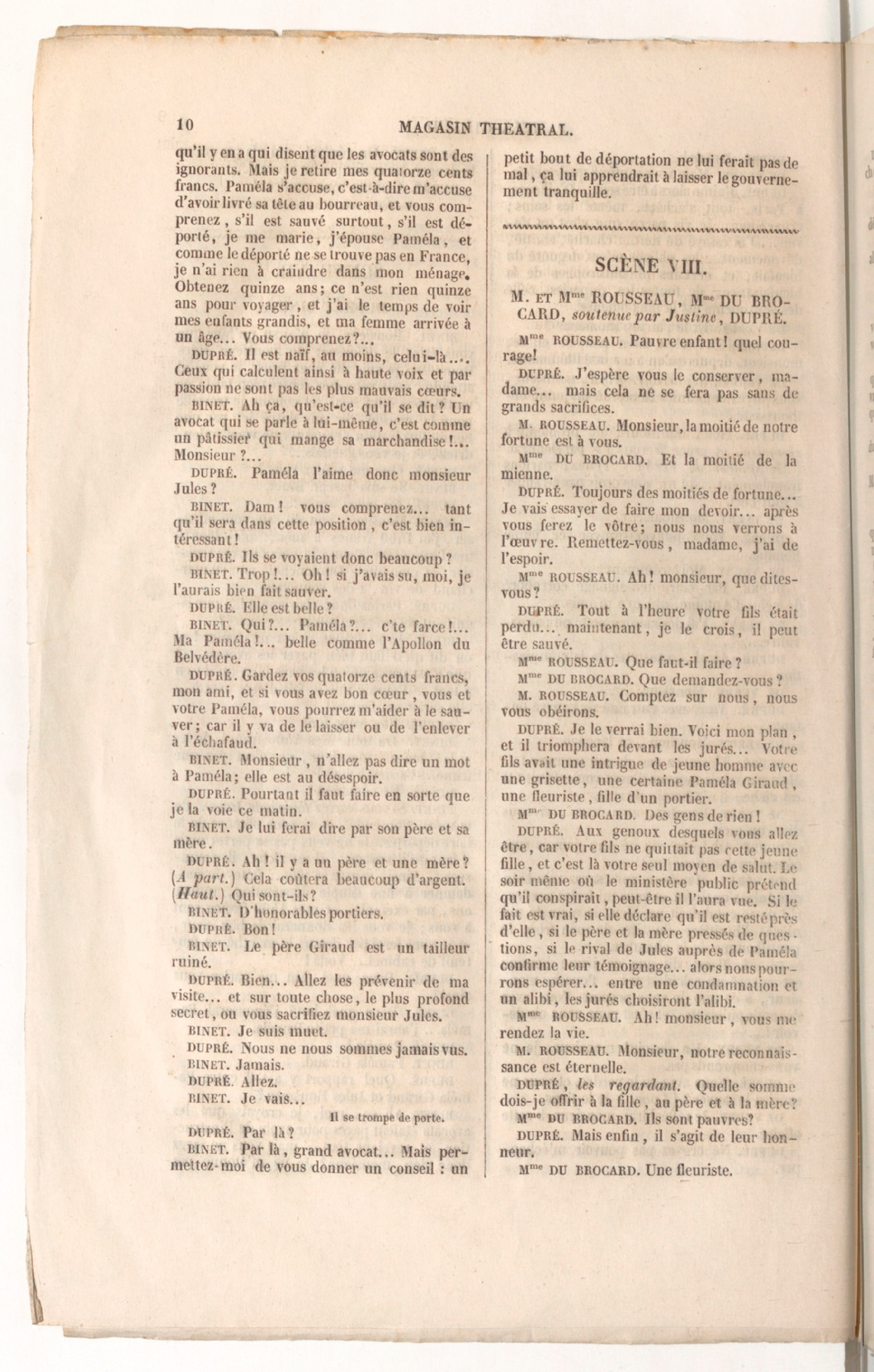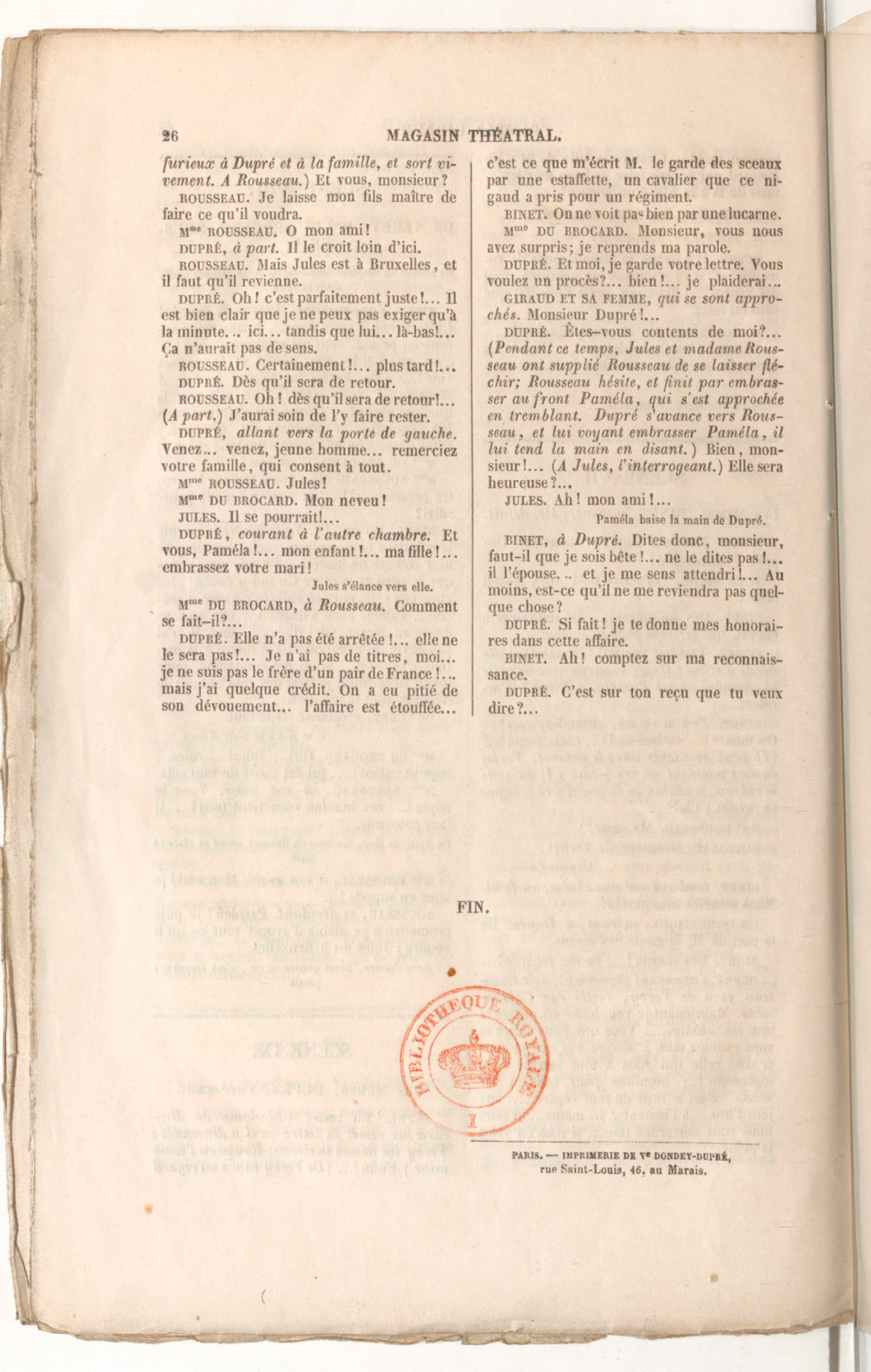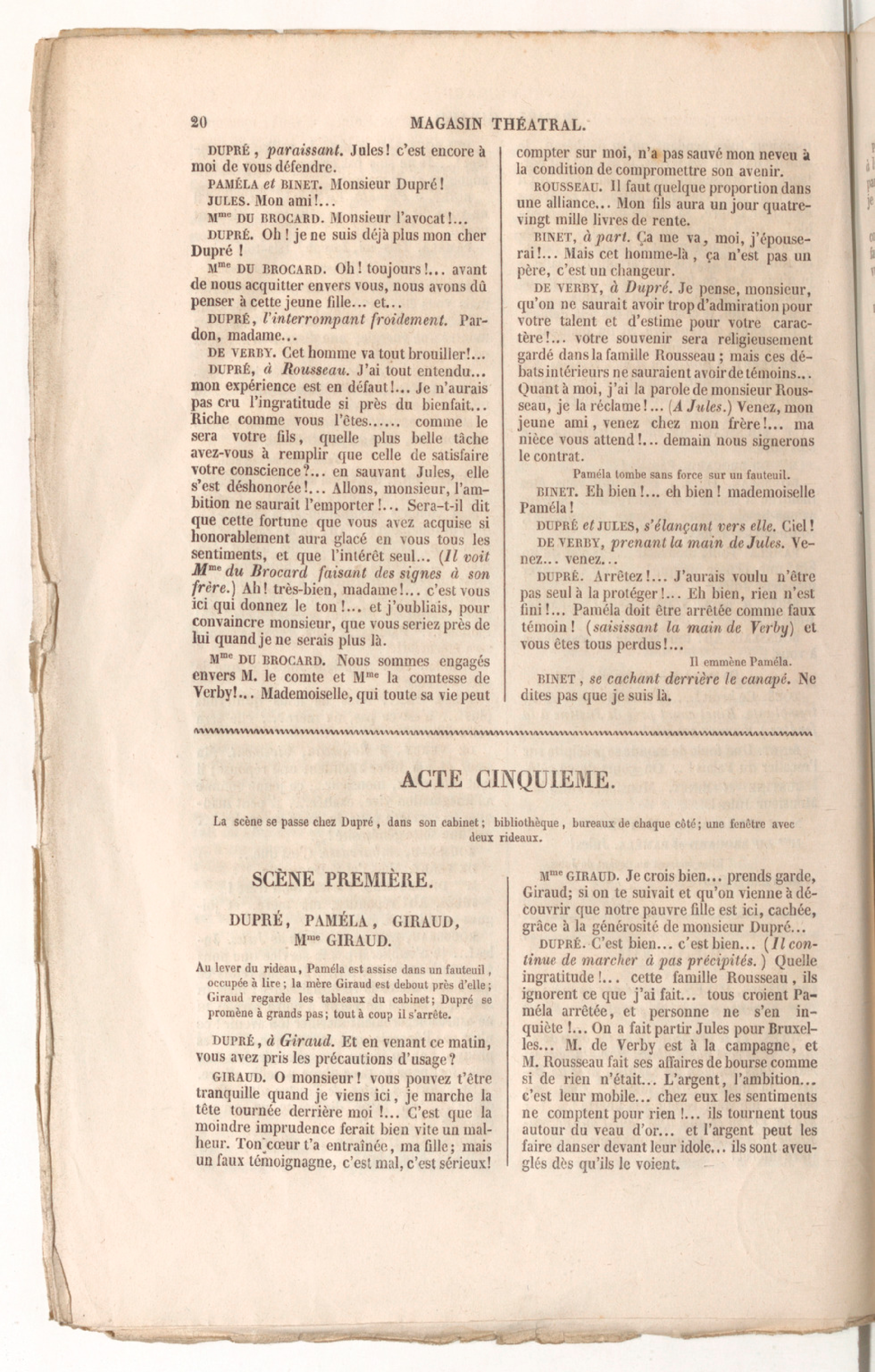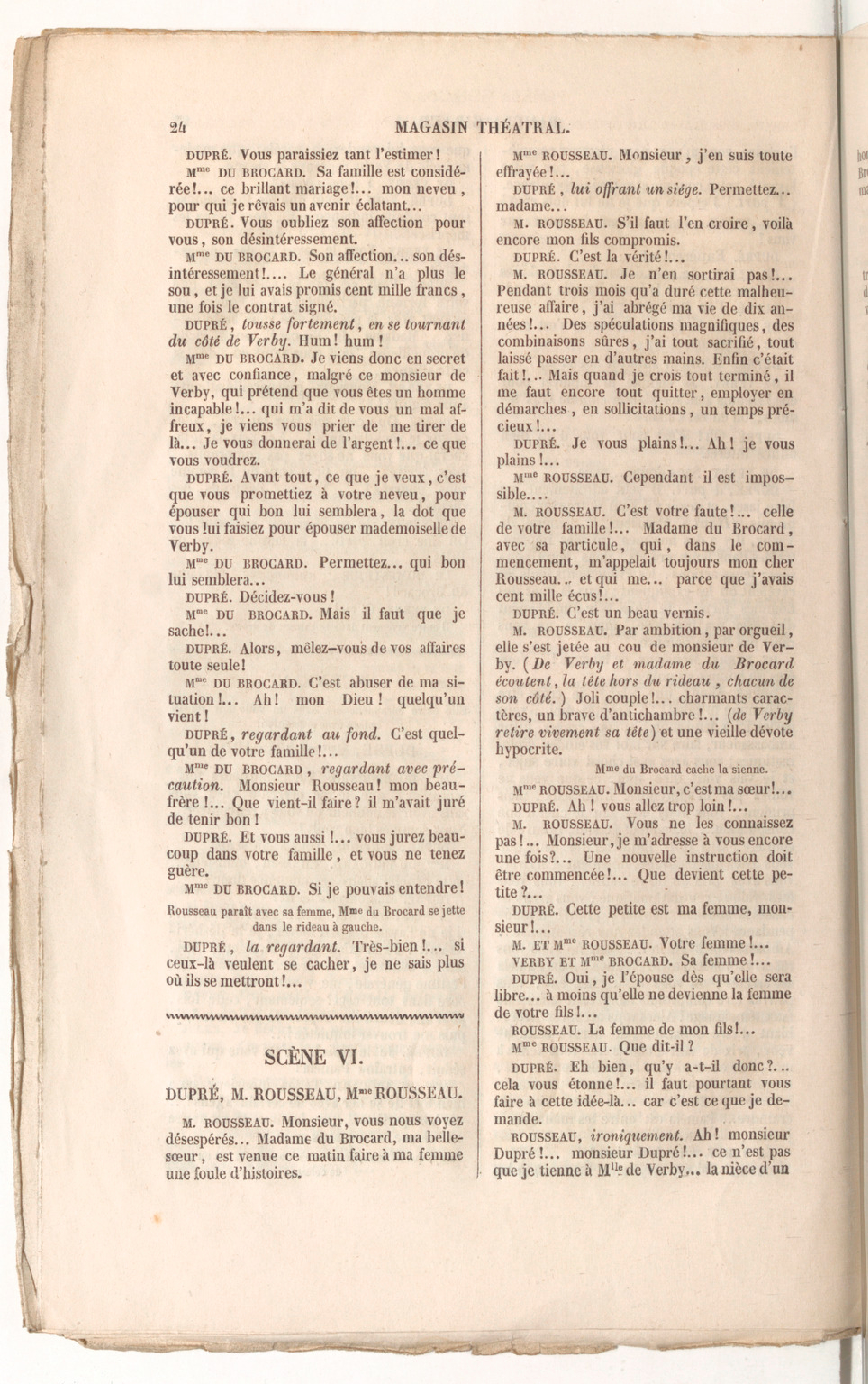 Eh bien ! (Madame du Brocard lui remet la lettre qu ’ il a demandée ; Verby lui donne la sienne ; Rousseau l’examine.) Enfin !… (De Verby lance un regard {p. 26} furieux à Dupré et à la famille, et sort vivement. À Rousseau) Et vous, monsieur ?