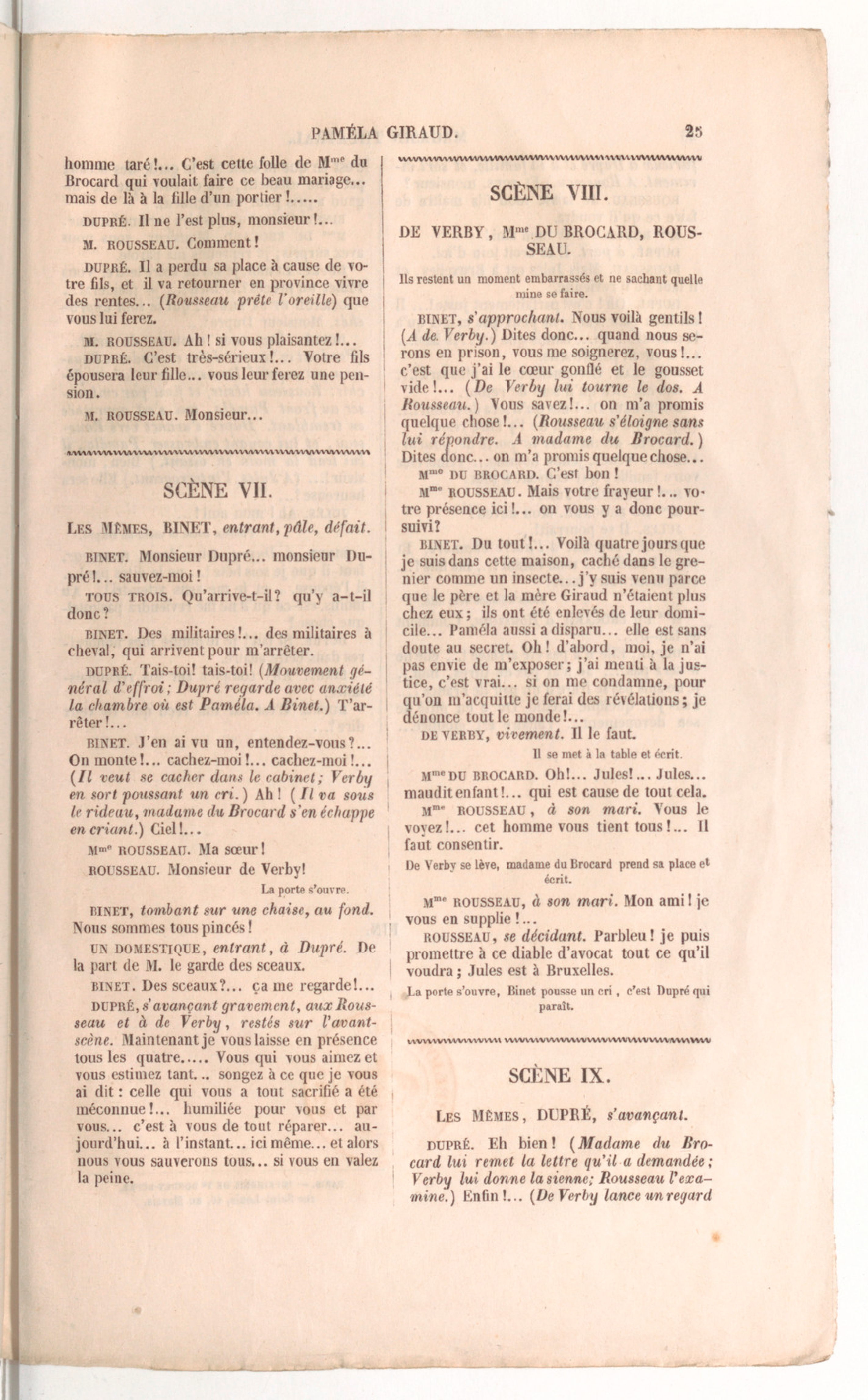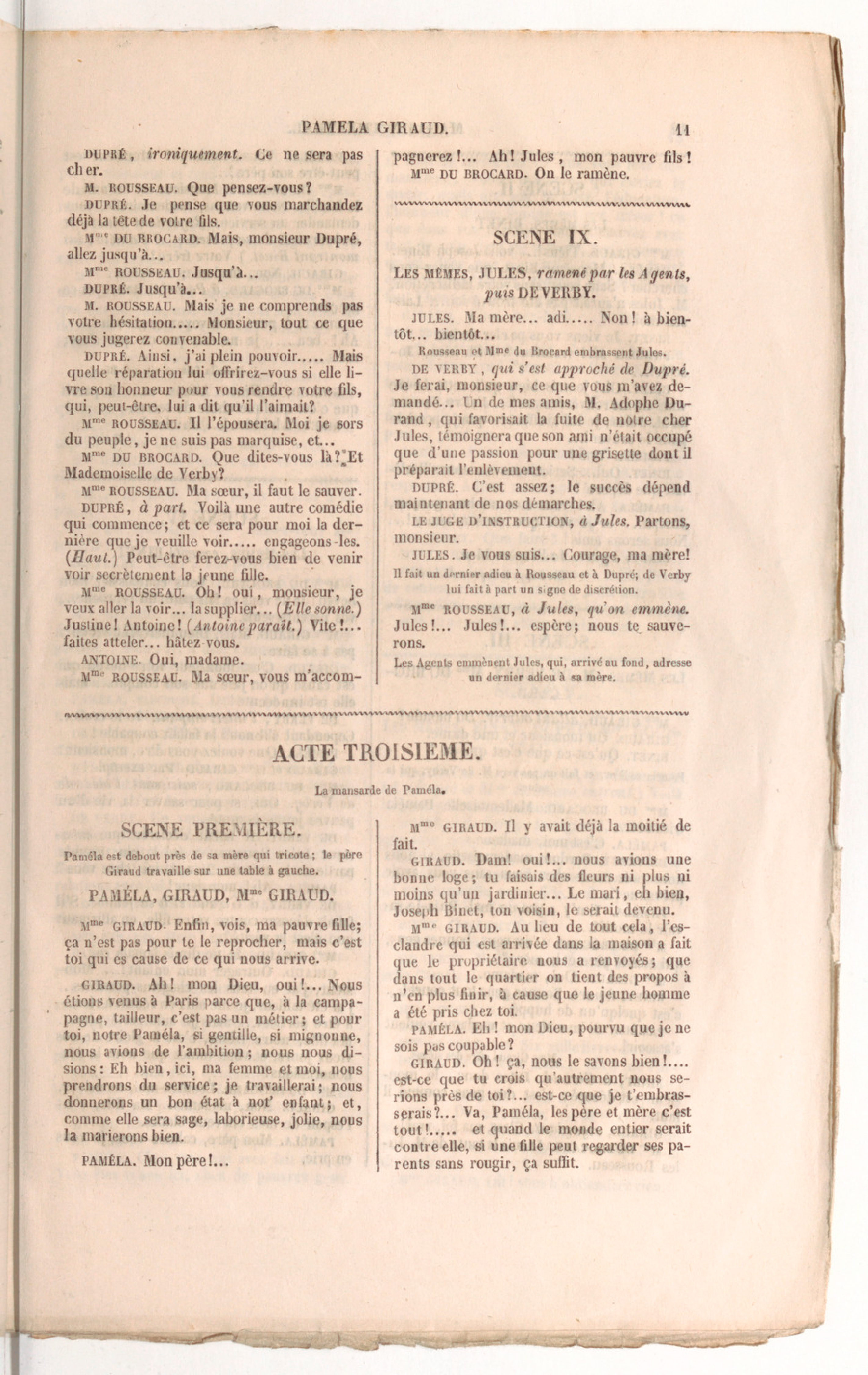 Êtes-vous contents de moi ?… (Pendant ce temps, Jules et madame Rousseau ont supplié Rousseau de se laisser fléchir ; Rousseau hésite, et finit par embrasser au front Paméla, qui s ’ est approchée en tremblant. Dupré s ’ avance vers Rousseau, et lui voyant embrasser Paméla, il lui tend la main en disant.) Bien, monsieur !… (À Jules, l’interrogeant.) Elle sera heureuse ?…