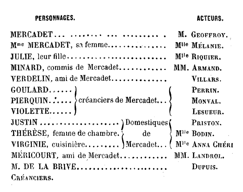 - Madame Mercadet, sa femme …… M.lle Mélanie