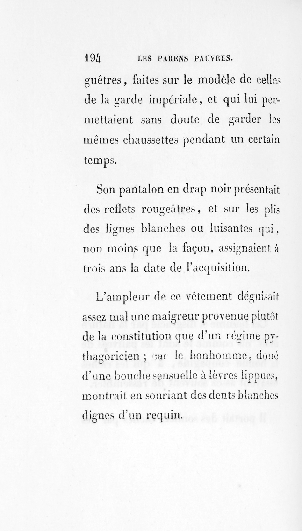 Cet homme si disgracié par la nature était mis comme le sont les pauvres de la bonne compagnie , à qui les riches essayent assez souvent de ressembler. Il portait des souliers cachés par des guêtres, faites sur le modèle de celles de la garde impériale, et qui lui permettaient sans doute de garder les mêmes chaussettes pendant un certain temps. Son pantalon en drap noir présentait des reflets rougeâtres, et sur les plis des lignes blanches ou luisantes qui, non moins que la façon, assignaient à trois ans la date de l’acquisition. L’ampleur de ce vêtement déguisait assez mal une maigreur provenue plutôt de la constitution que d’un régime pythagoricien ; car le bonhomme, doué d’une bouche sensuelle à lèvres lippues, montrait en souriant des dents blanches dignes d’un requin. Le gilet à châle, également en drap noir, mais doublé d’un gilet blanc sous lequel brillait en troisième ligne le bord d’un tricot rouge, vous remettait en mémoire les cinq gilets de Garat. Une énorme cravate en mousseline blanche dont le nœud prétentieux avait été cherché par un Beau pour charmer lesfemmes charmantesde 1809, dépassait si bien le menton que la figure semblait s’y plonger comme dans un abîme. Un cordon de soie tressée, jouant les cheveux, traversait la chemise et protégeait la montre contre un vol improbable. L’habit verdâtre, d’une propreté remarquable, comptait quelque trois ans de plus que le pantalon ; mais le collet en velours noir et les boutons en métal blanc récemment renouvelés trahissaient les soins domestiques poussés jusqu’à la minutie.
