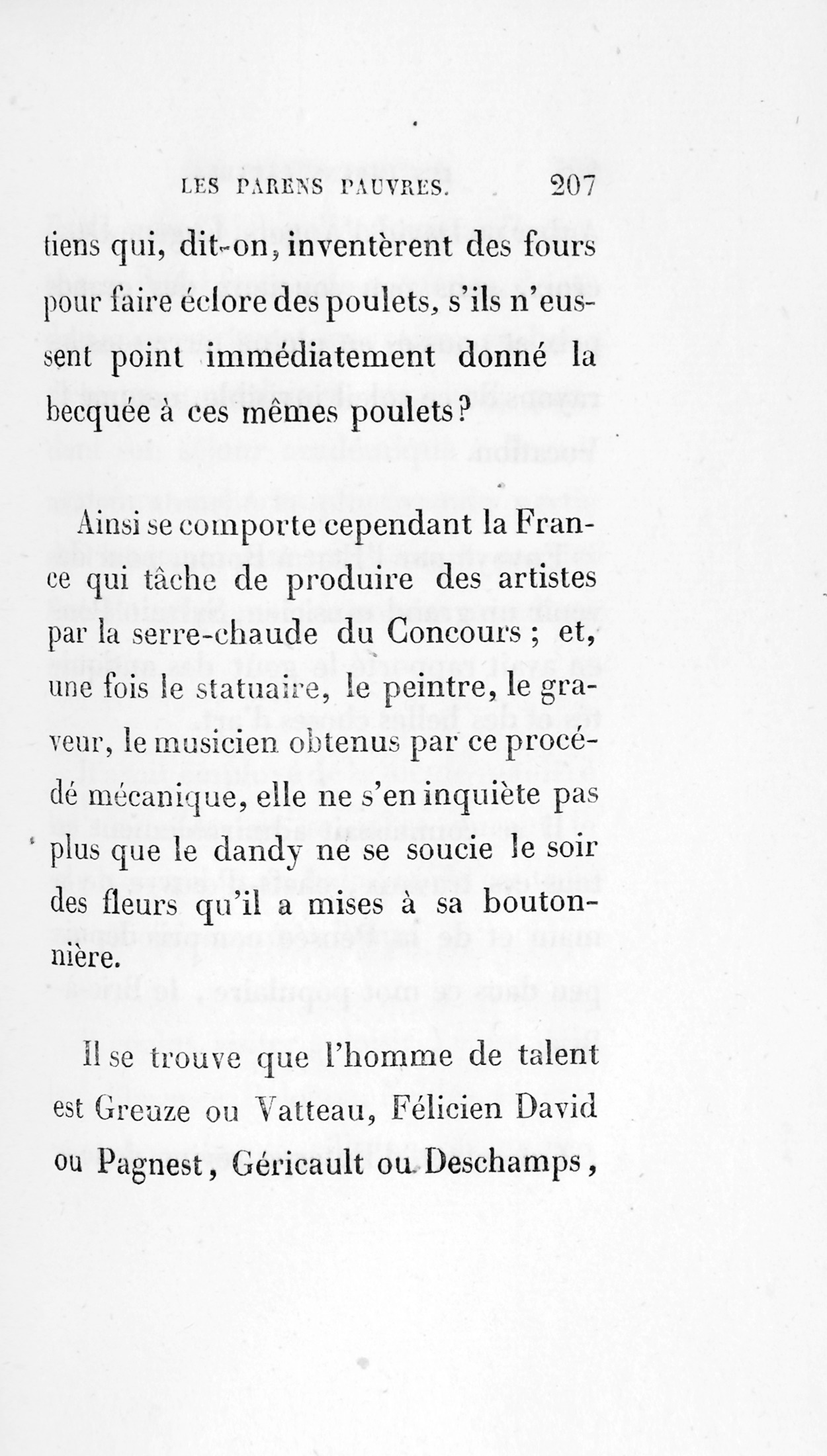 Puis, que penseriez-vous des Égyptiens qui, dit-on, inventèrent des fours pour faire éclore des poulets, s’ils n’eussent point immédiatement donné la becquée à ces mêmes poulets ? Ainsi se comporte cependant la France qui tâche de produire des artistes par la serre-chaude du Concours ; et, une fois le statuaire, le peintre, le graveur, le musicien obtenus par ce procédé mécanique, elle ne s’en inquiète pas plus que le dandy ne se soucie le soir des fleurs qu’il a mises à sa boutonnière.