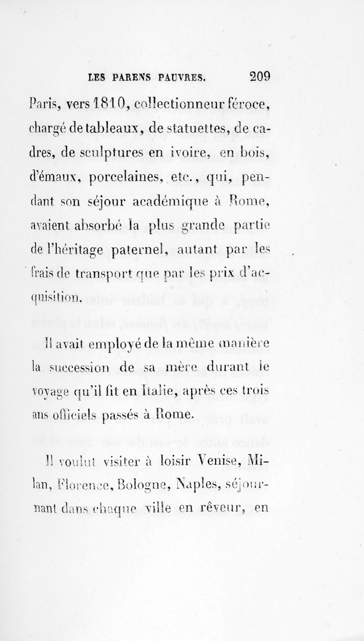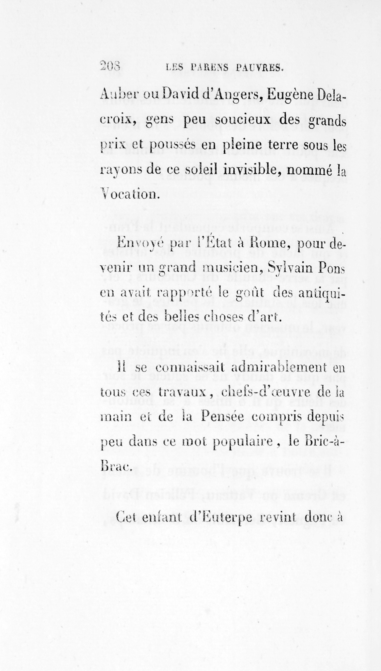 Envoyé par l’État à Rome, pour devenir un grand musicien, Sylvain Pons en avait rapporté le goût des antiquités et des belles choses d’art. Il se connaissait admirablement en tous ces travaux, chefs-d’œuvre de la Main et de la Pensée, compris depuis peu dans ce mot populaire, le Bric-à-Brac. Cet enfant d’Euterpe revint donc à Paris, vers 1810, collectionneur féroce, chargé de tableaux, de statuettes, de cadres, de sculptures en ivoire, en bois, d’émaux, de porcelaines, etc., qui, pendant son séjour académique à Rome, avaient absorbé la plus grande partie de l’héritage paternel, autant par les frais de transport que par les prix d’acquisition. Il avait employé de la même manière la succession de sa mère durant le voyage qu’il fit en Italie, après ces trois ans officiels passés à Rome. Il voulut visiter à loisir Venise, Milan, Florence, Bologne, Naples, séjournant dans chaque ville en rêveur, en philosophe, avec l’insouciance de l’artiste qui, pour vivre, compte sur son talent, comme les filles de joie comptent sur leur beauté.