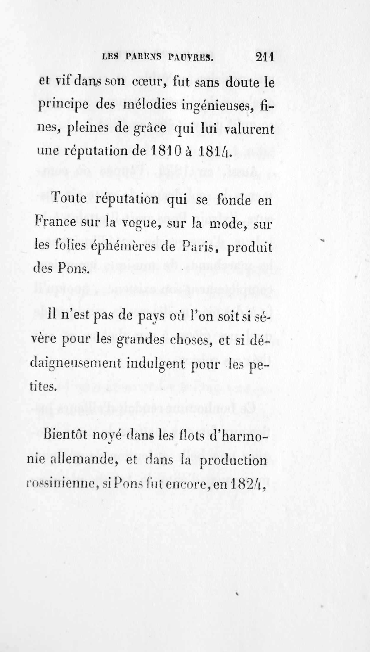 Ce sentiment du beau, conservé pur et vif dans son cœur, fut sans doute le principe des mélodies ingénieuses, fines, pleines de grâce qui lui valurent une réputation de 1810 à 1814. Toute réputation qui se fonde en France sur la vogue, sur la mode, sur les folies éphémères de Paris, produit des Pons. Il n’est pas de pays où l’on soit si sévère pour les grandes choses, et si dédaigneusement indulgent pour les petites.