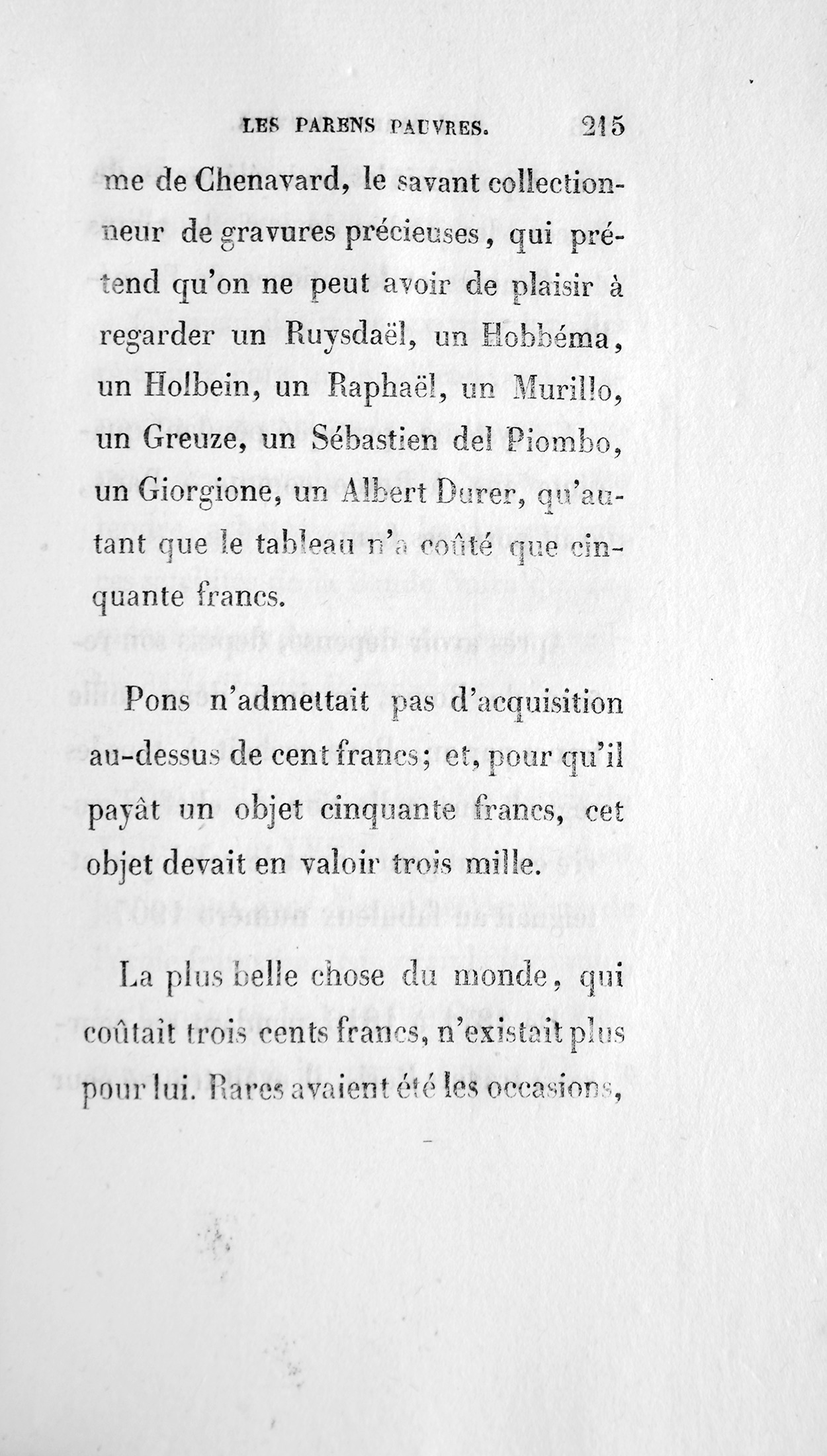 Le vieux musicien pratiquait l’axiôme de Chenavard, le savant collectionneur de gravures précieuses, qui prétend qu’on ne peut avoir de plaisir à regarder un Ruysdaël, un Hobbéma, un Holbein, un Raphaël, un Murillo, un Greuze, un Sébastien del Piombo, un Giorgione, un Albert Durer, qu’autant que le tableau n’a coûté que cinquante francs. Pons n’admettait pas d’acquisition au-dessus de cent francs ; et, pour qu’il payât un objet cinquante francs, cet objet devait en valoir trois mille. La plus belle chose du monde, qui coûtait trois cents francs, n’existait plus pour lui. Rares avaient été les occasions, mais il possédait les trois éléments du succès : les jambes du cerf, le temps des flâneurs et la patience de l’Israélite.
