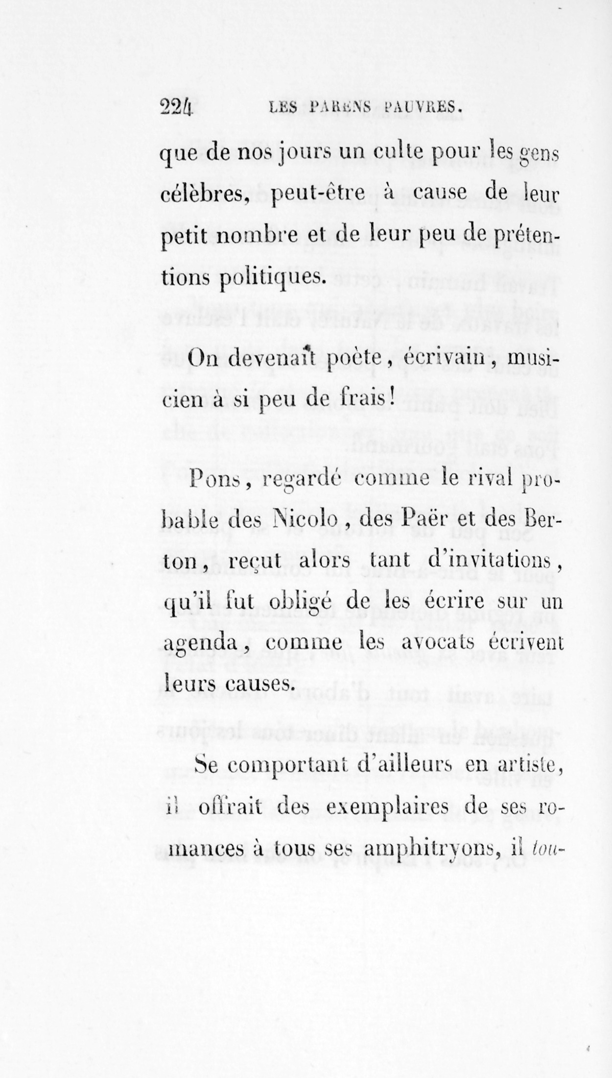 Or, sous l’Empire, on eut bien plus que de nos jours un culte pour les gens célèbres, peut-être à cause de leur petit nombre et de leur peu de prétentions politiques. On devenait poète, écrivain, musicien à si peu de frais ! Pons, regardé comme le rival probable des Nicolo, des Paër et des Berton, reçut alors tant d’invitations, qu’il fut obligé de les écrire sur un agenda, comme les avocats écrivent leurs causes. Se comportant d’ailleurs en artiste, il offrait des exemplaires de ses romances à tous ses amphitryons, iltouchait le fortéchez eux, il leur apportait des loges pour Feydeau, théâtre pour lequel il travaillait ; il y organisait les concerts, il jouait même quelquefois du violon chez ses parents en improvisant un petit bal.
