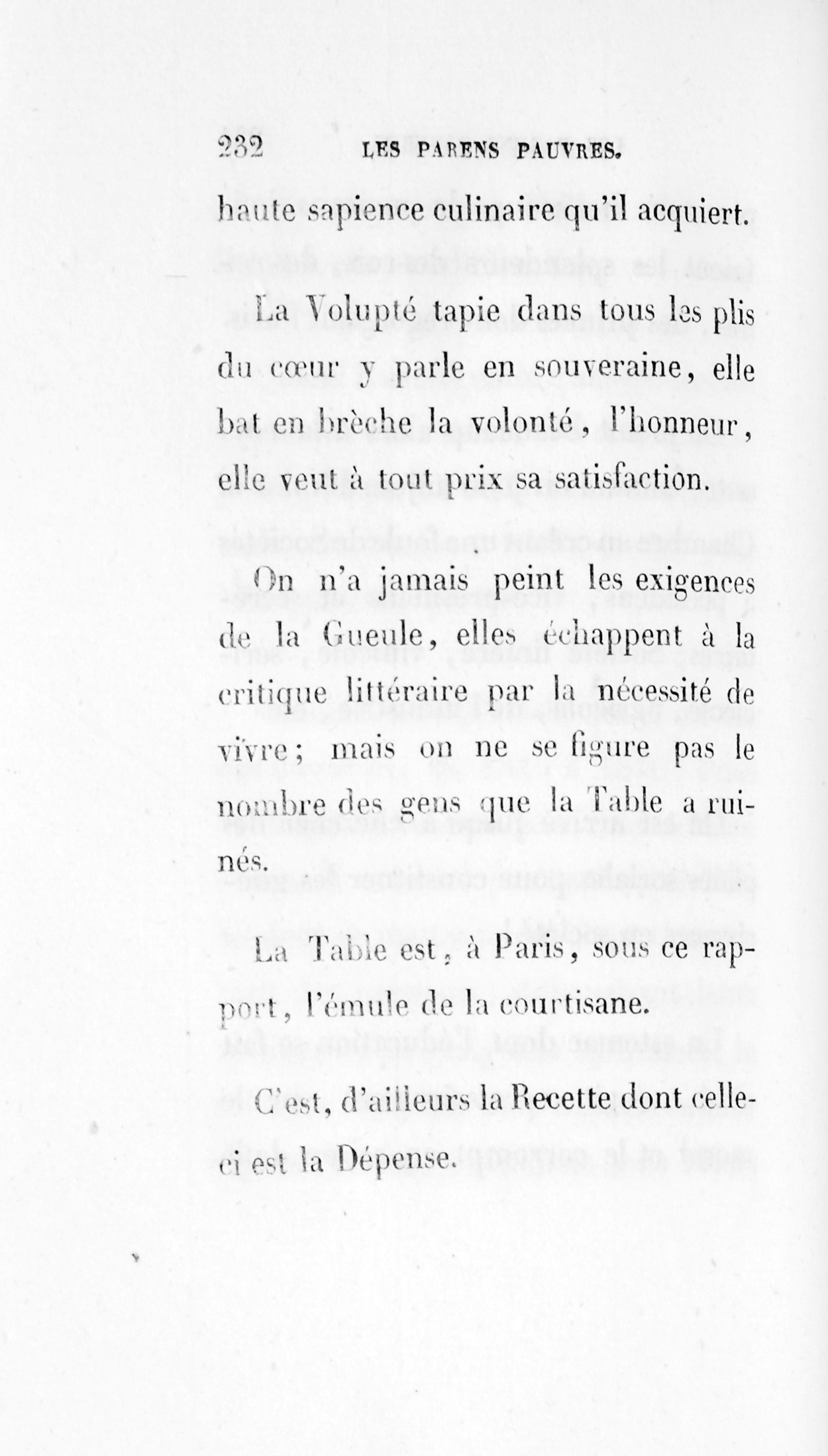 Un estomac dont l’éducation se fait ainsi, réagit nécessairement sur le moral et le corrompt en raison de la haute sapience culinaire qu’il acquiert. La Volupté tapie dans tous les plis du cœur y parle en souveraine, elle bat en brèche la volonté, l’honneur, elle veut à tout prix sa satisfaction. On n’a jamais peint les exigences de la Gueule, elles échappent à la critique littéraire par la nécessité de vivre ; mais on ne se figure pas le nombre des gens que la Table a ruinés. La Table est, à Paris, sous ce rapport, l’émule de la Courtisane. C’est, d’ailleurs la Recette dont celle-ci est la Dépense.