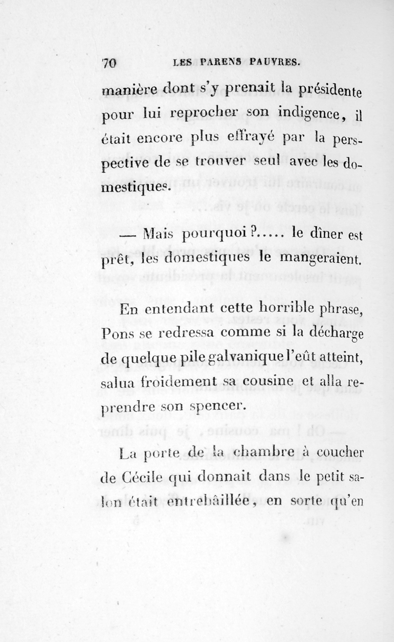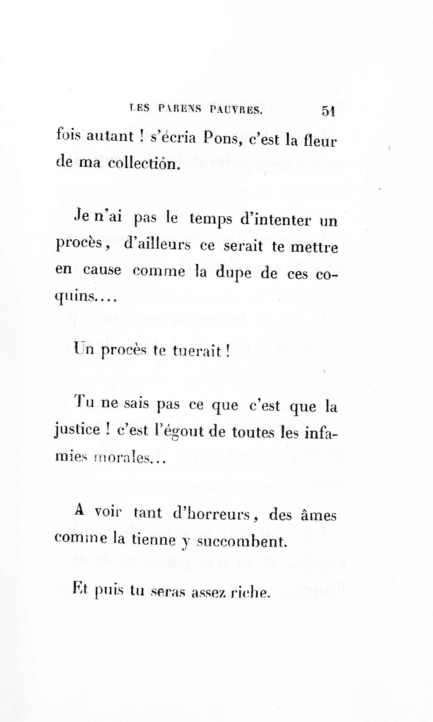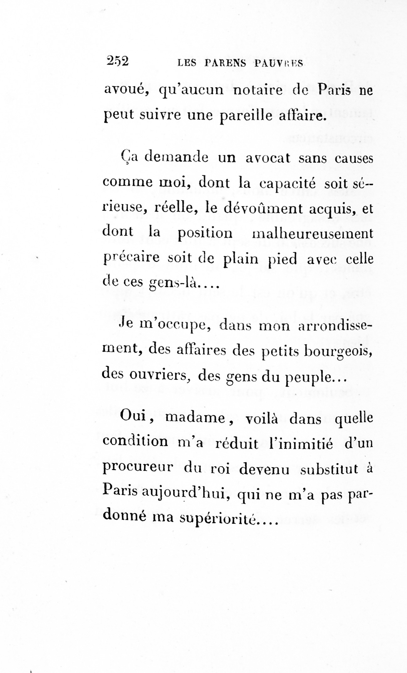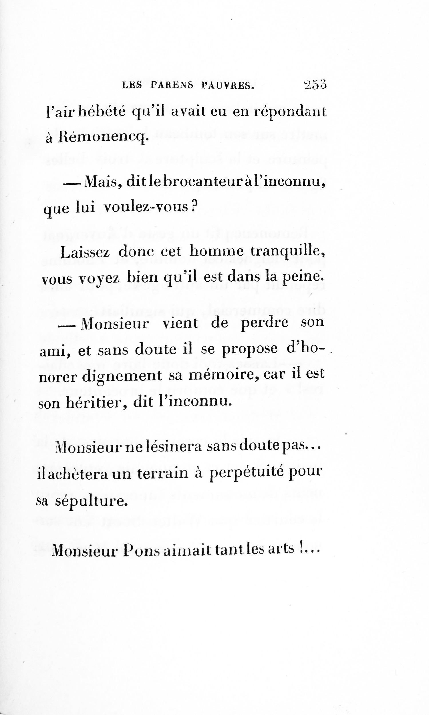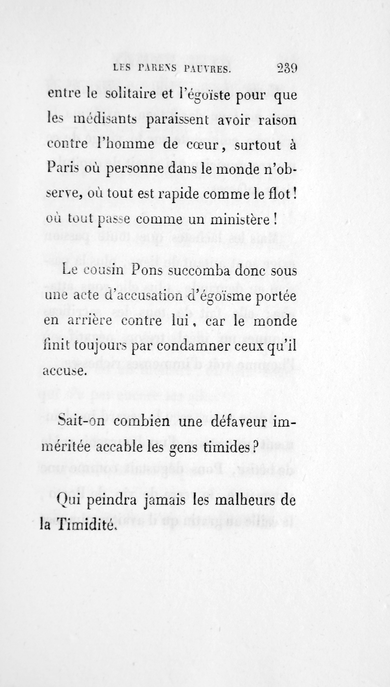 Le cousin Pons succomba donc sous une d’accusation d’égoïsme [p. 252] porté en arrière contre lui, car le monde finit toujours par condamner ceux qu’il accuse. Sait-on combien une défaveur imméritée accable les gens timides ? Qui peindra jamais les malheurs de la Timidité !