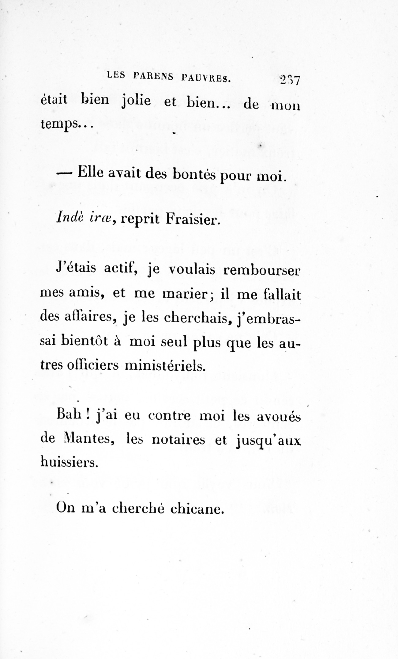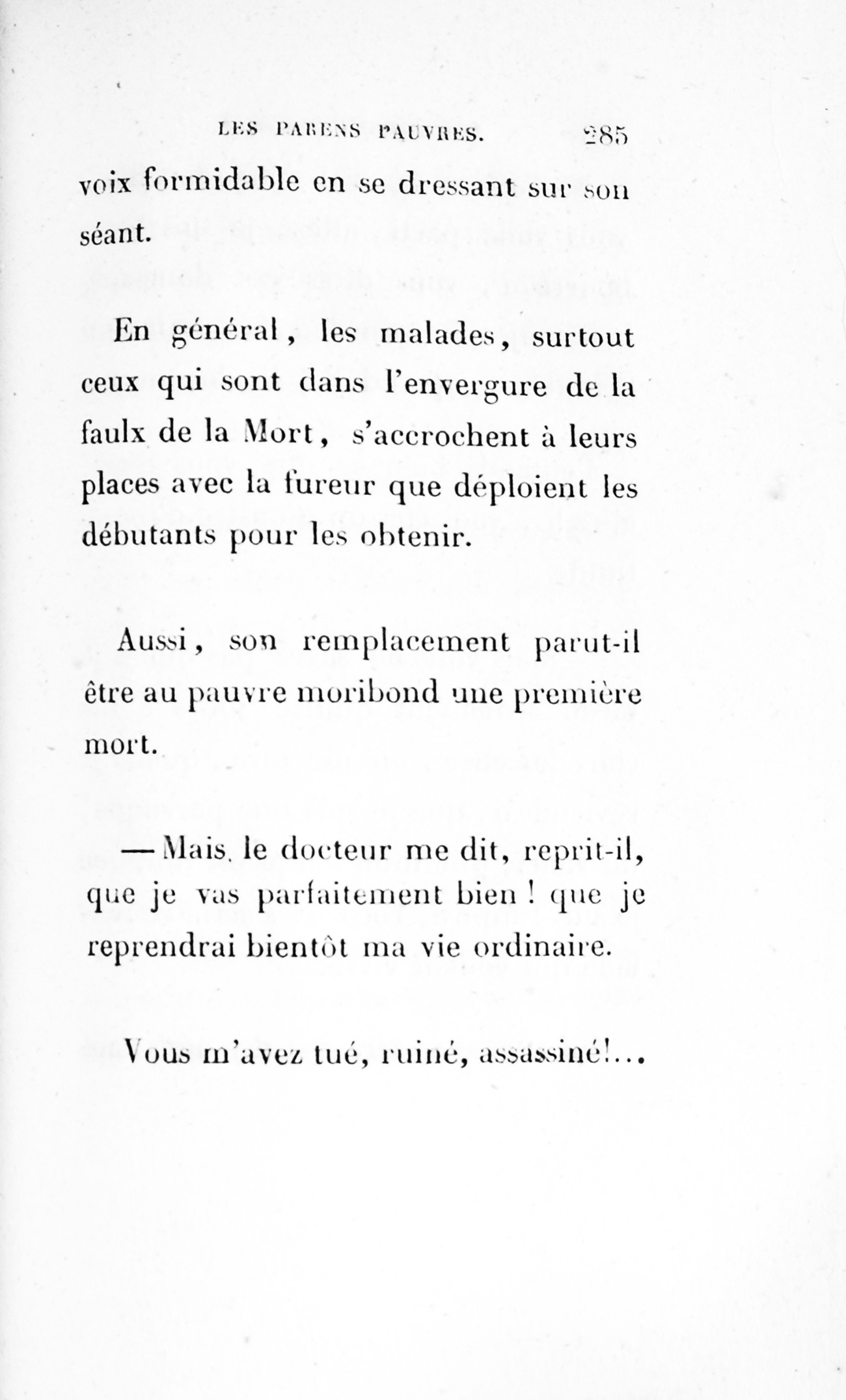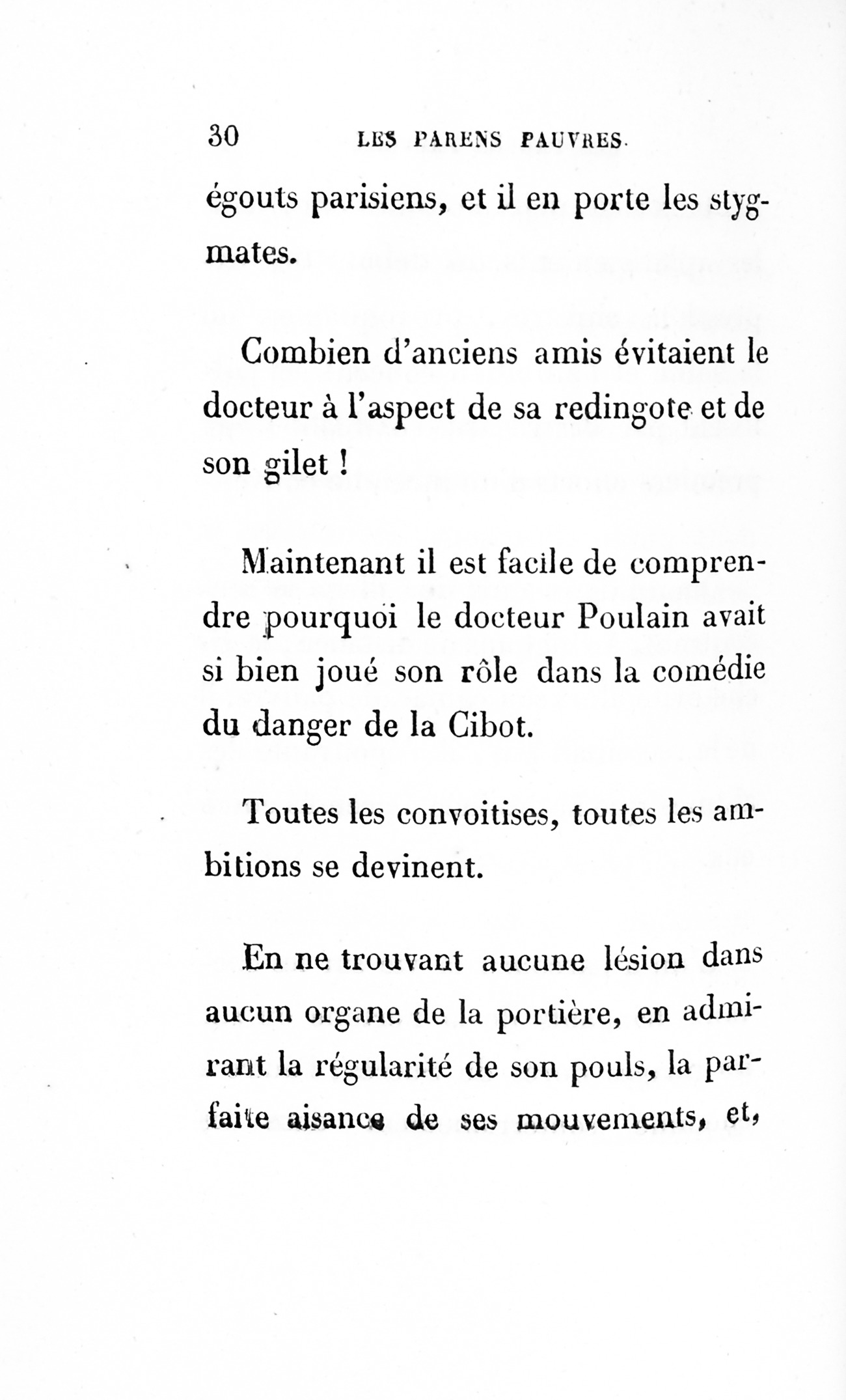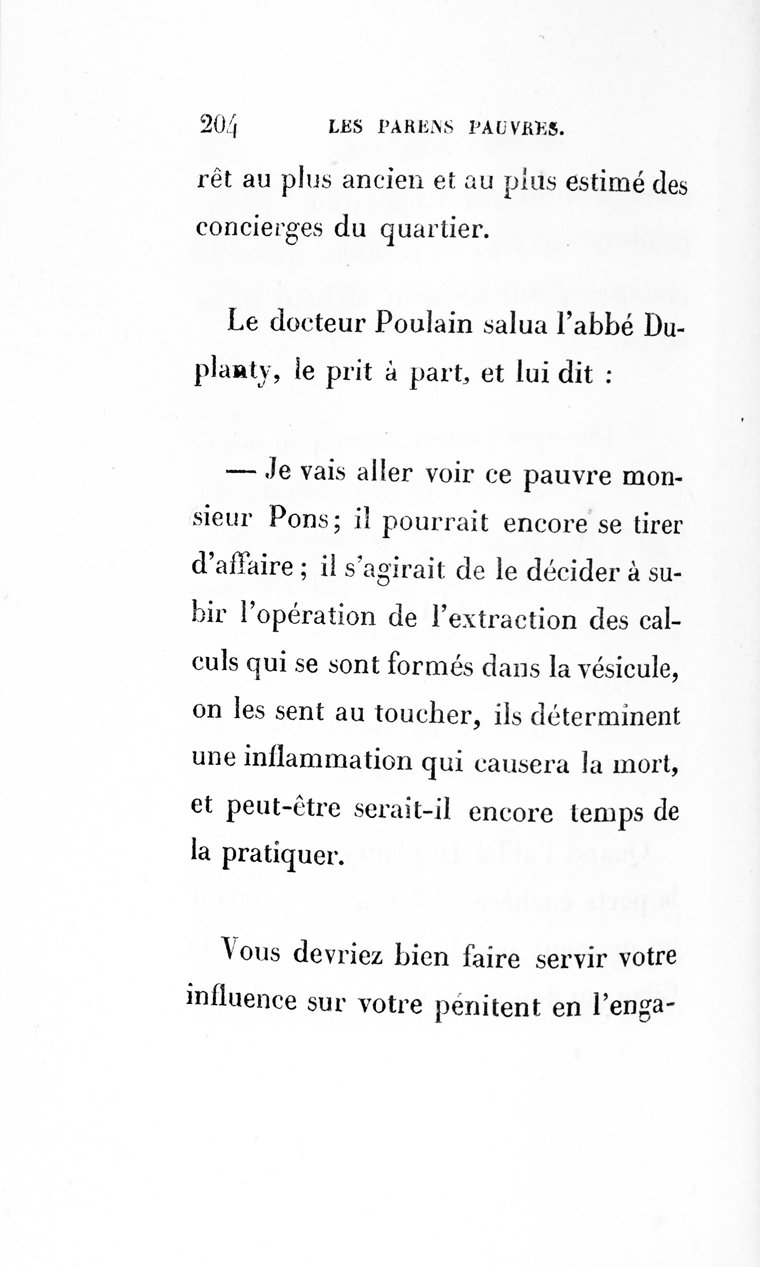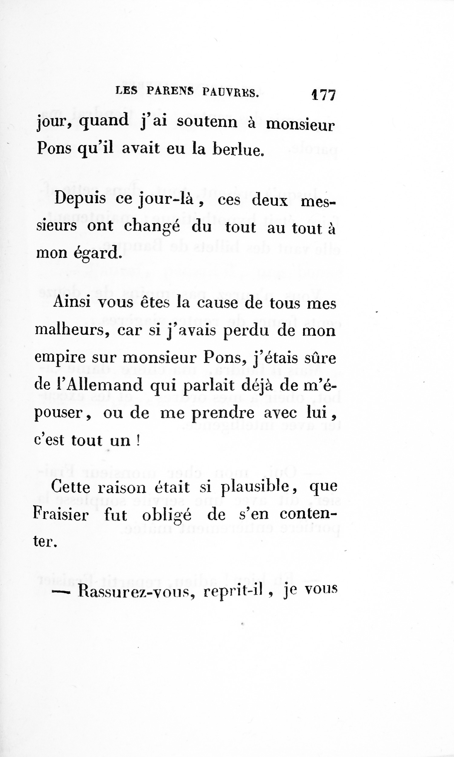 Le cousin Pons succomba donc sous une d’accusation d’égoïsme [p. 252] porté en arrière contre lui, car le monde finit toujours par condamner ceux qu’il accuse. Sait-on combien une défaveur imméritée accable les gens timides ? Qui peindra jamais les malheurs de la Timidité !