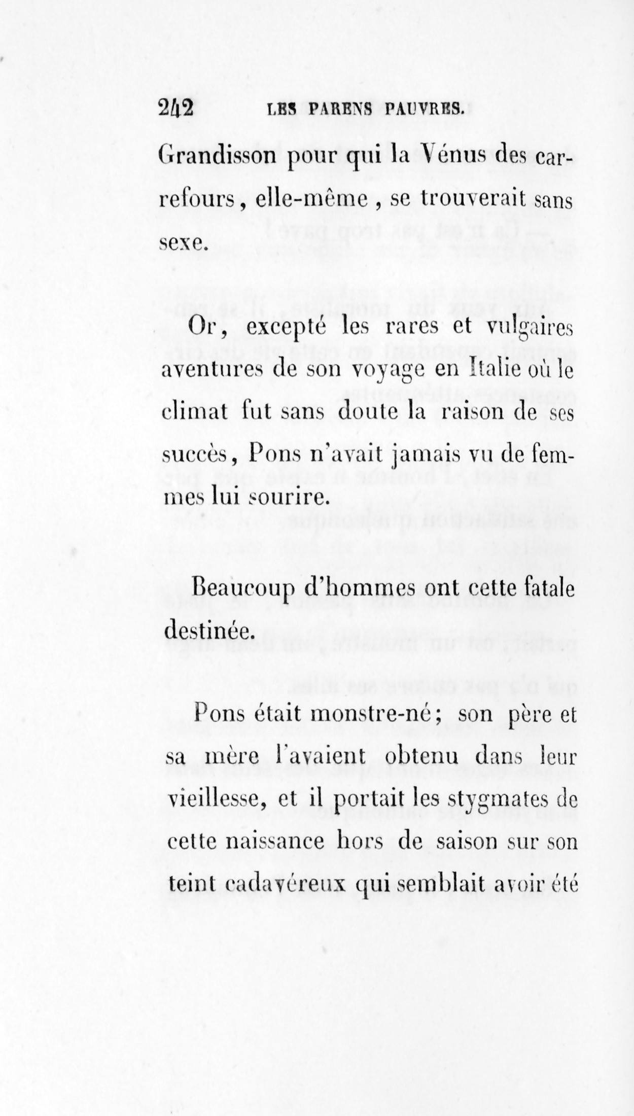 En effet, l’homme n’existe que par une satisfaction quelconque. Un homme sans passion, le juste parfait, est un monstre, un demi-ange qui n’a pas encore ses ailes. Les anges n’ont que des têtes dans la mythologie catholique. Sur terre, le juste, c’est l’ennuyeux Grandisson, pour qui la Vénus des carrefours, elle-même, se trouverait sans sexe. Or, excepté les rares et vulgaires aventures de son voyage en Italie où le climat fut sans doute la raison de ses succès, Pons n’avait jamais vu de femmes lui sourire. Beaucoup d’hommes ont cette fatale destinée. Pons était monstre-né ; son père et sa mère l’avaient obtenu dans leur vieillesse, et il portait les stigmates de cette naissance hors de saison sur son teint cadavéreux qui semblait avoir été contracté dans le bocal d’esprit-de-vin où la science conserve certains fœtus extraordinaires.