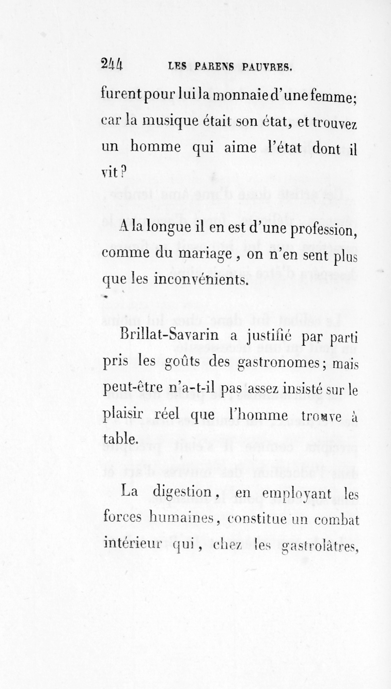 Cet artiste, doué d’une âme tendre, rêveuse, délicate, forcé d’accepter le caractère que lui imposait sa figure, désespéra d’être jamais aimé. Le célibat fut donc chez lui moins un goût qu’une nécessité.. La gourmandise, le péché des moines vertueux, lui tendit les bras ; il s’y précipita comme il s’était précipité dans l’adoration des œuvres d’art et dans son culte pour la musique. La bonne chère et le Bric-à-Brac furent pour lui la monnaie d’une femme ; car la musique était son état, et trouvez un homme qui aime l’état dont il vit ? À la longue, il en est d’une profession, comme du mariage, on n’en sent plus que les inconvéniens.