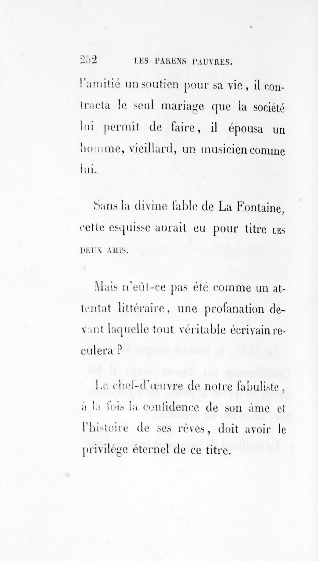 Sans la divine fable de La Fontaine, cette esquisse aurait eu pour titreLes deux amis. Mais n’eût-ce pas été comme un attentat littéraire, une profanation devant laquelle tout véritable écrivain reculera ? Le chef-d’œuvre de notre fabuliste, à la fois la confidence de son âme et l’histoire de ses rêves, doit avoir le privilége éternel de ce titre. Cette page, au fronton de laquelle le poète a gravé ces trois mots :Les deux amis, est une de ces propriétés sacrées, un temple où chaque génération entrera respectueusement et que l’univers visitera, tant que durera la typographie.
