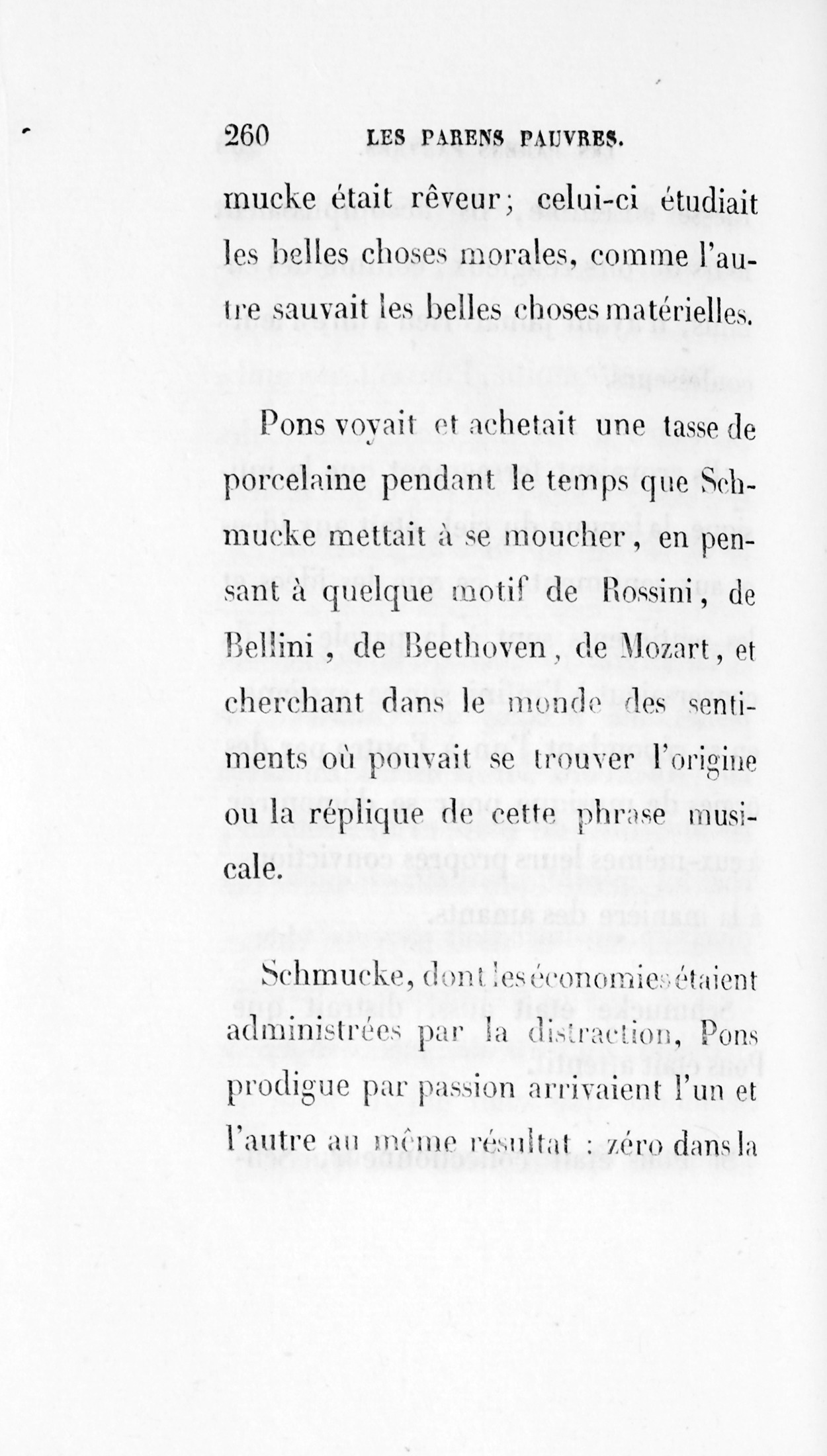 Schmucke était aussi distrait que Pons était attentif. Si Pons était collectionneur, Schmucke était rêveur ; celui-ci étudiait les belles choses morales, comme l’autre sauvait les belles choses matérielles. Pons voyait et achetait une tasse de porcelaine pendant le temps que Schmucke mettait à se moucher, en pensant à quelque motif de Rossini, de Bellini, de Beethoven, [p. 254] de Mozart, et cherchant dans le monde des sentimens où pouvait se trouver l’origine ou la réplique de cette phrase musicale. Schmucke, dont les économies étaient administrées par la distraction, Pons prodigue par passion arrivaient l’un et l’autre au même résultat : zéro dans la bourse, à la Saint-Sylvestre de chaque année.