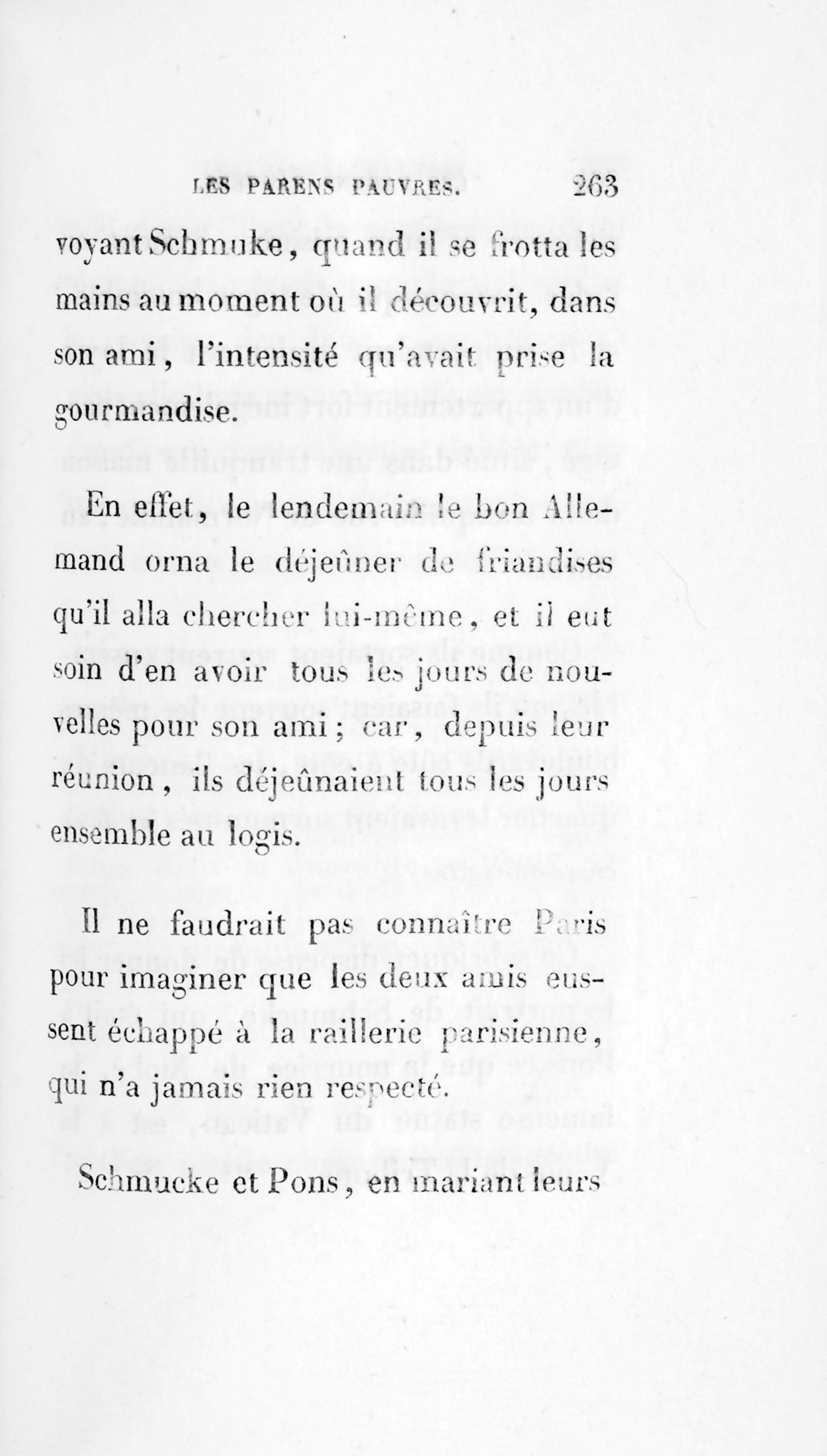 Jamais peut-être deux âmes ne se trouvèrent si pareilles dans l’océan humain qui prit sa source au Paradis terrestre contre la volonté de Dieu. Ces deux musiciens devinrent en peu de temps l’un pour l’autre une nécessité. Réciproquement confidents l’un de l’autre, ils furent en huit jours comme deux frères. Enfin Schmucke ne croyait pas plus qu’il pût exister un Pons, que Pons ne se doutait qu’il existât un Schmucke. Déjà, ceci suffirait à peindre ces deux braves gens ; mais toutes les intelligences ne goûtent pas les brièvetés de la synthèse. Une légère démonstration est nécessaire pour les incrédules.