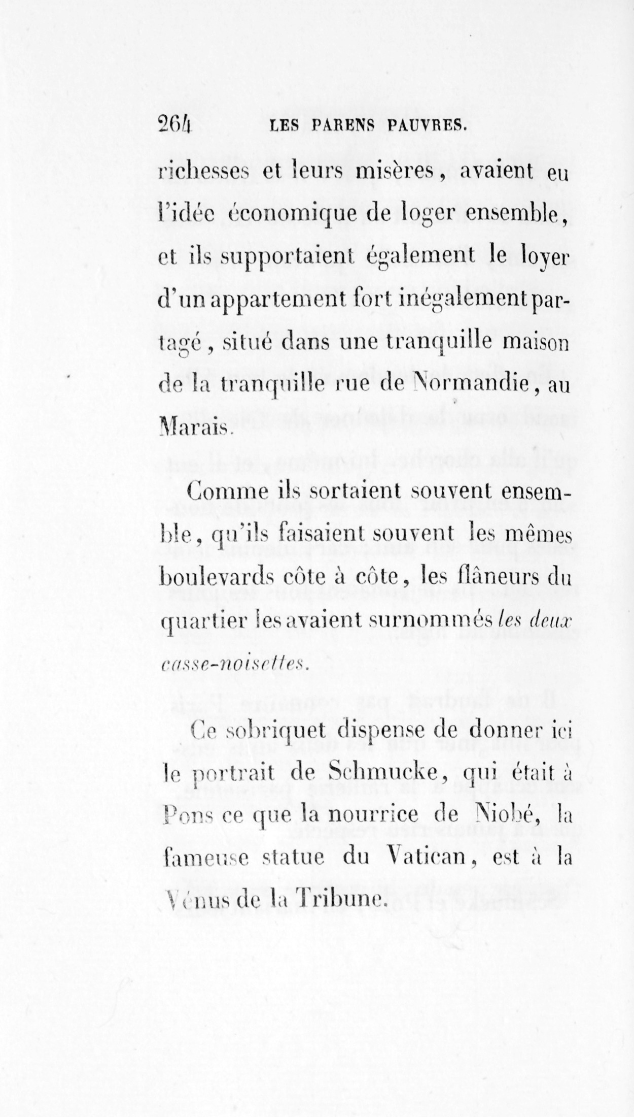 Il faudrait ne pas connaître Paris pour imaginer que les deux amis eussent échappé à la raillerie parisienne, qui n’a jamais rien respecté. Schmucke et Pons, en mariant leurs richesses et leurs misères, avaient eu l’idée économique de loger ensemble, et ils supportaient également le loyer d’un appartement fort inégalement partagé, situé dans une tranquille maison de la tranquille rue de Normandie, au Marais. Comme ils sortaient souvent ensemble, qu’ils faisaient souvent les mêmes boulevards côte à côte, les flâneurs du quartier les avaient surnommésles deux casse-noisettes.