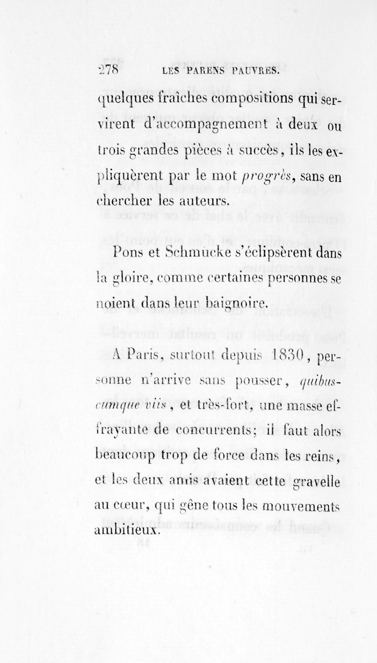 L’association de Schmucke et de Pons produisit un résultat merveilleux. Schmucke, très fort comme tous les Allemands sur l’harmonie, soigna l’instrumentation dans les partitions dont le chant fut fait par Pons. Quand les connaisseurs admirèrent quelques fraîches compositions qui servirent d’accompagnement à deux ou trois grandes pièces à succès, ils les expliquèrent par le motprogrès, sans en chercher les auteurs. Pons et Schmucke s’éclipsèrent dans la gloire, comme certaines personnes se noient dans leur baignoire. À Paris, surtout depuis 1830, personne n’arrive sans pousser,quibuscumque viis, et très fort, une masse effrayante de concurrens ; il faut alors beaucoup trop de force dans les reins, et les deux amis avaient cette gravelle au cœur, qui gêne tous les mouvements ambitieux.