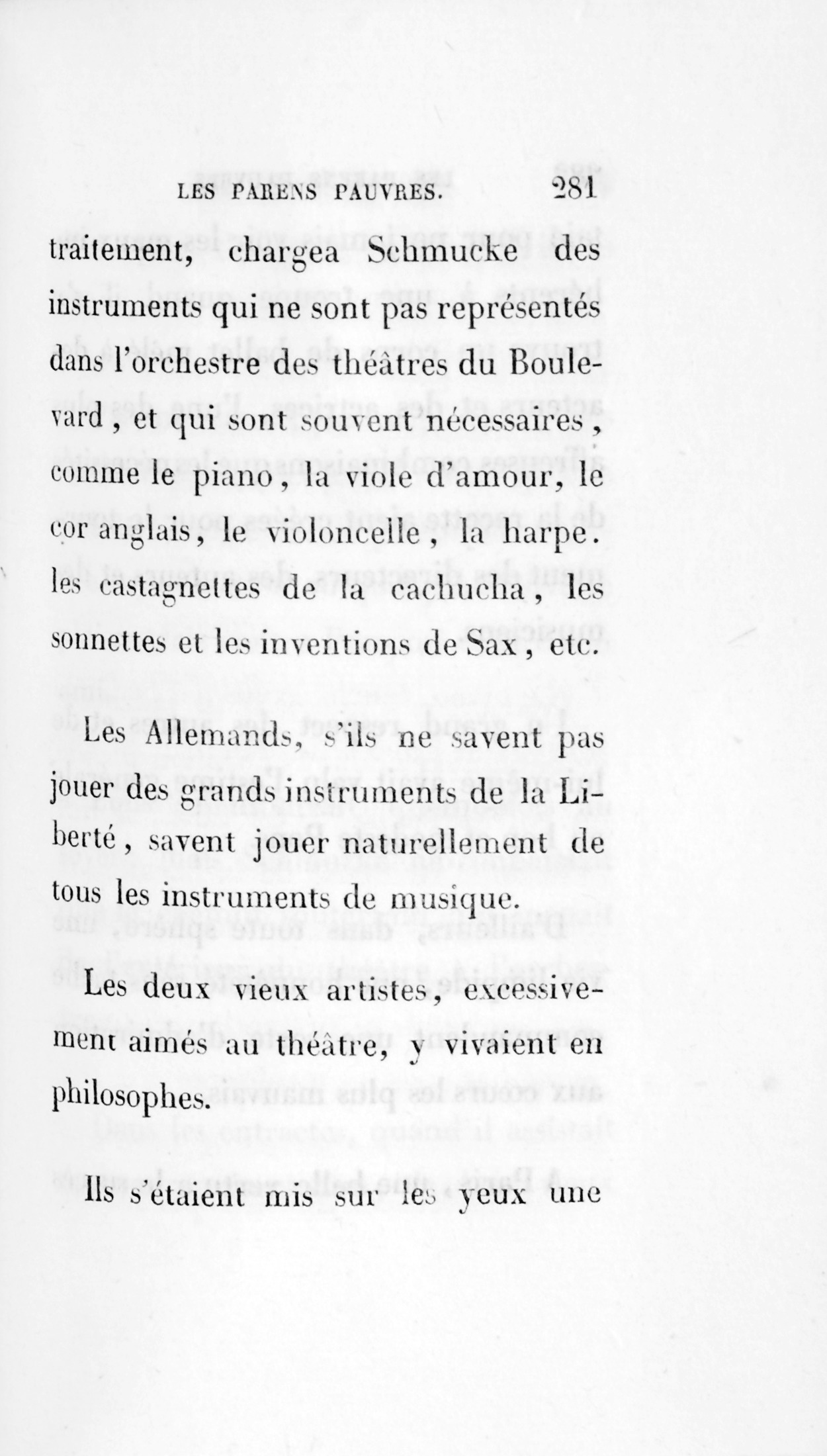 Avec le temps, la position de Schmucke à l’orchestre s’était consolidée.L’Illustre Gaudissard avait reconnu, sans en rien dire, et la valeur et l’utilité du collaborateur de Pons. On avait été obligé d’introduire à l’orchestre un piano comme aux grands théâtres. Le piano, touché gratis par Schmucke, fut établi auprès du pupitre du chef d’orchestre, où se plaçait le surnuméraire volontaire. Quand on connut ce bon Allemand, sans ambition ni prétention, il fut accepté par tous les musiciens. L’administration pour un modique traitement, chargea Schmucke des instrumens qui ne sont pas représentés dans l’orchestre des théâtres du Boulevard, et qui sont souvent nécessaires, comme le piano, la viole d’amour, le cor anglais, le violoncelle, la harpe, les castagnettes de la cachucha, les sonnettes et les inventions de Sax, etc. Les Allemands, s’ils ne savent pas jouer des grands instrumens de la Liberté, savent jouer naturellement de tous les instrumens de musique.