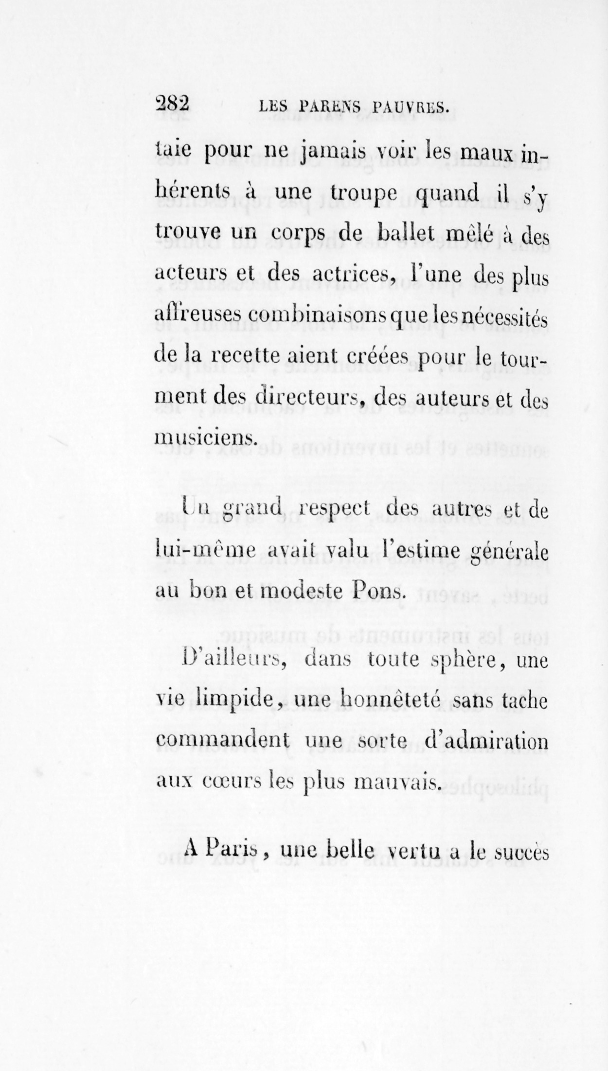 Un grand respect des autres et de lui-même avait valu l’estime générale au bon et modeste Pons. D’ailleurs, dans toute sphère, une vie limpide, une honnêteté sans tache commandent une sorte d’admiration aux cœurs les plus mauvais. À Paris, une belle vertu a le succès d’un gros diamant, d’une curiosité rare. Pas un acteur, pas un auteur, pas une danseuse, quelque effrontée qu’elle pût être, ne se serait permis la moindre mystification ou quelque mauvaise plaisanterie contre Pons ou contre son ami. Pons se montrait quelquefois au foyer ; mais Schmucke ne connaissait que le chemin souterrain qui menait de l’extérieur du théâtre à l’orchestre.