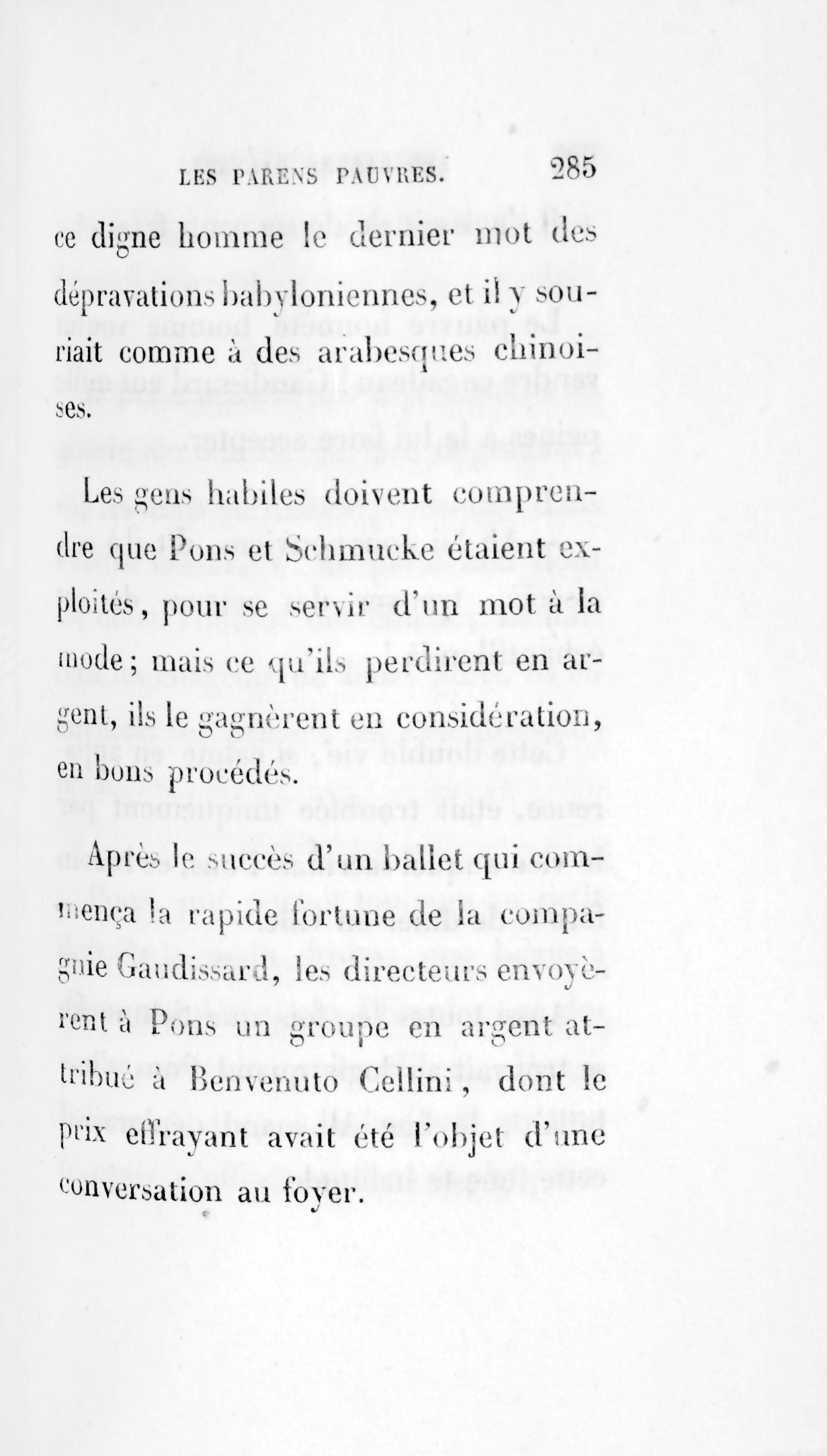 Les gens habiles doivent comprendre que Pons et Schmucke étaient exploités, pour se servir d’un mot à la mode ; mais ce qu’ils perdirent en argent, ils le gagnèrent en considération, en bons procédés. Après le succès d’un ballet qui commença la rapide fortune de la compagnie Gaudissard, les directeurs envoyèrent à Pons un groupe en argent attribué à Benvenuto Cellini, dont le prix effrayant avait été l’objet d’une conversation au foyer. Il s’agissait de douze cents francs ! Le pauvre honnête homme voulut rendre ce cadeau ! Gaudissard eut mille peines à le lui faire accepter.