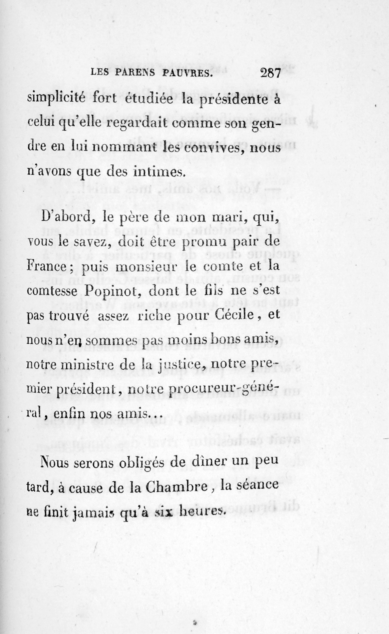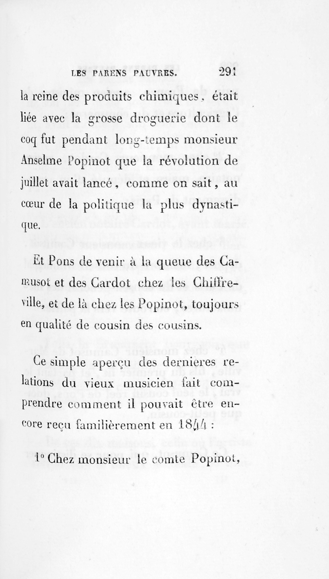 Pendant cette période, qui dura six ans environs, de 1810 à 1816, Pons contracta la funeste habitude de bien dîner, de voir les personnes qui l’invitaient se mettant en frais, se procurant des primeurs, débouchant leurs meilleurs vins, soignant le dessert, le café, les liqueurs, et le traitant de leur mieux, comme on traitait sous l’Empire, où beaucoup de maisons imitaient les splendeurs des rois, des reines, des princes dont regorgeait Paris. On jouait beaucoup alors à la royauté, comme on joue aujourd’hui à la Chambre en créant une foule de Sociétés à présidens, vice-présidens et secrétaires ; Société linière, vinicole, séricicole, agricole, de l’industrie, etc. On est arrivé jusqu’à chercher des plaies sociales pour constituer les guérisseurs en société !