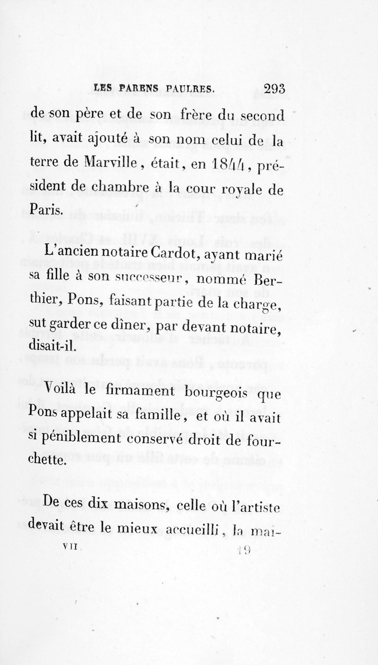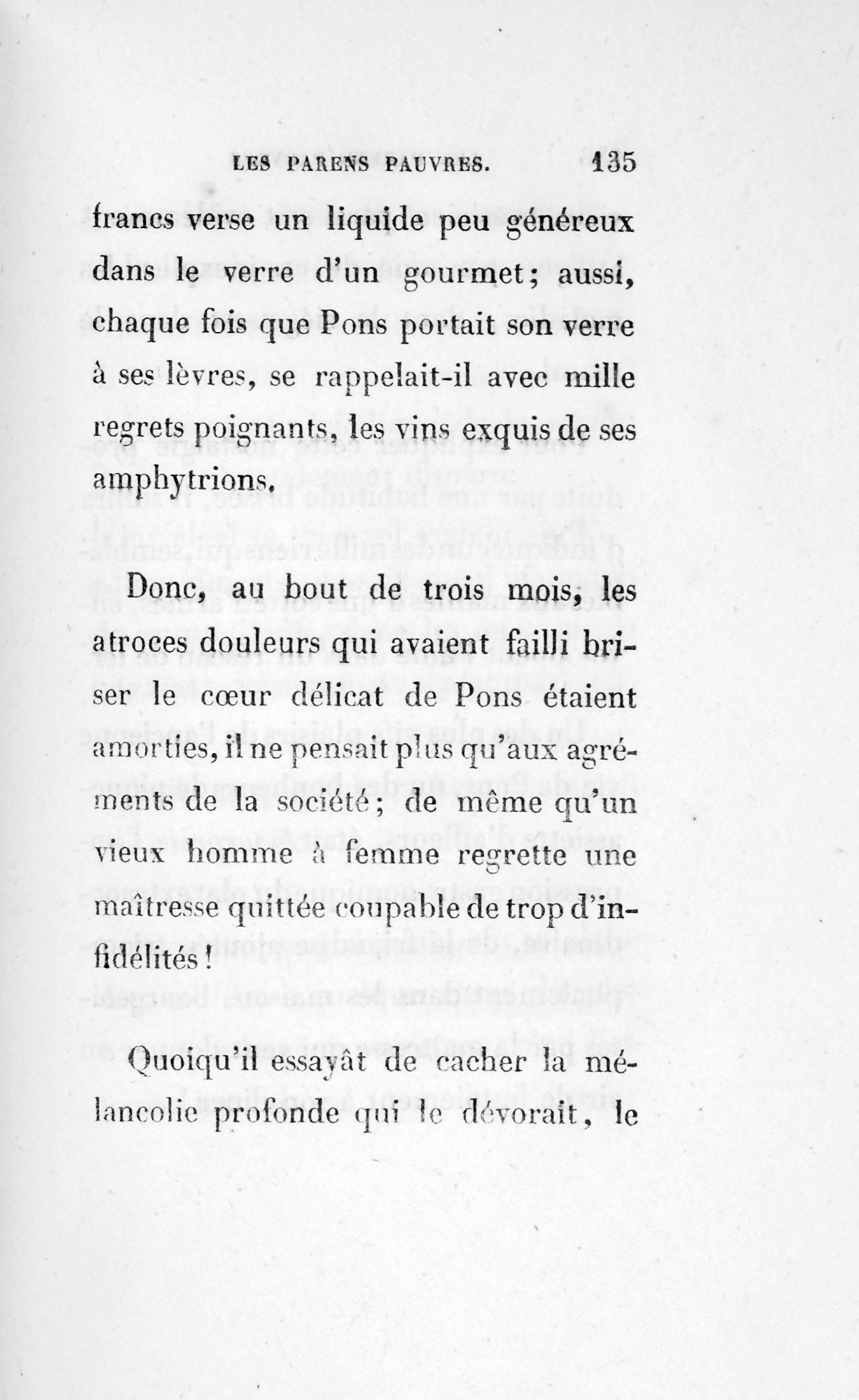 De 1836 à 1843, Pons se vit invité rarement. Loin de rechercher le parasite, chaque famille l’acceptait comme on accepte un impôt ; on ne lui tenait plus compte de rien, pas même de ses services réels.