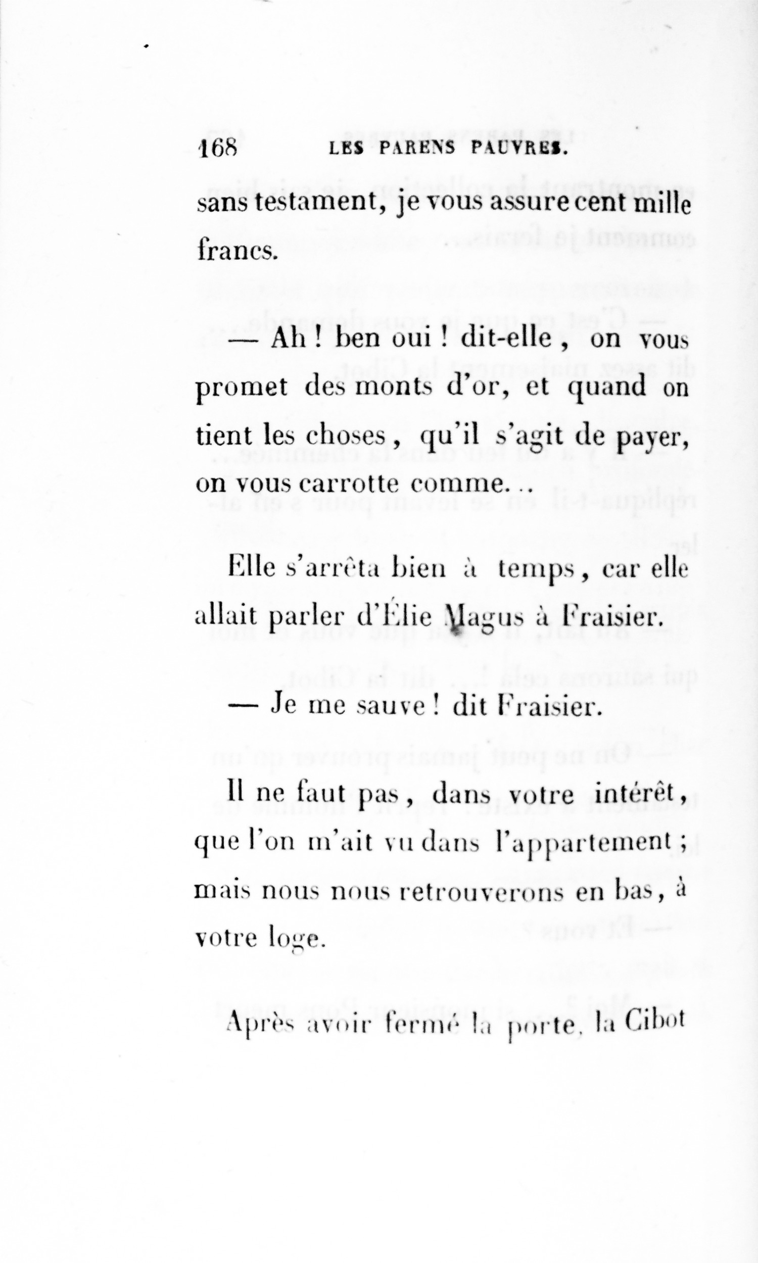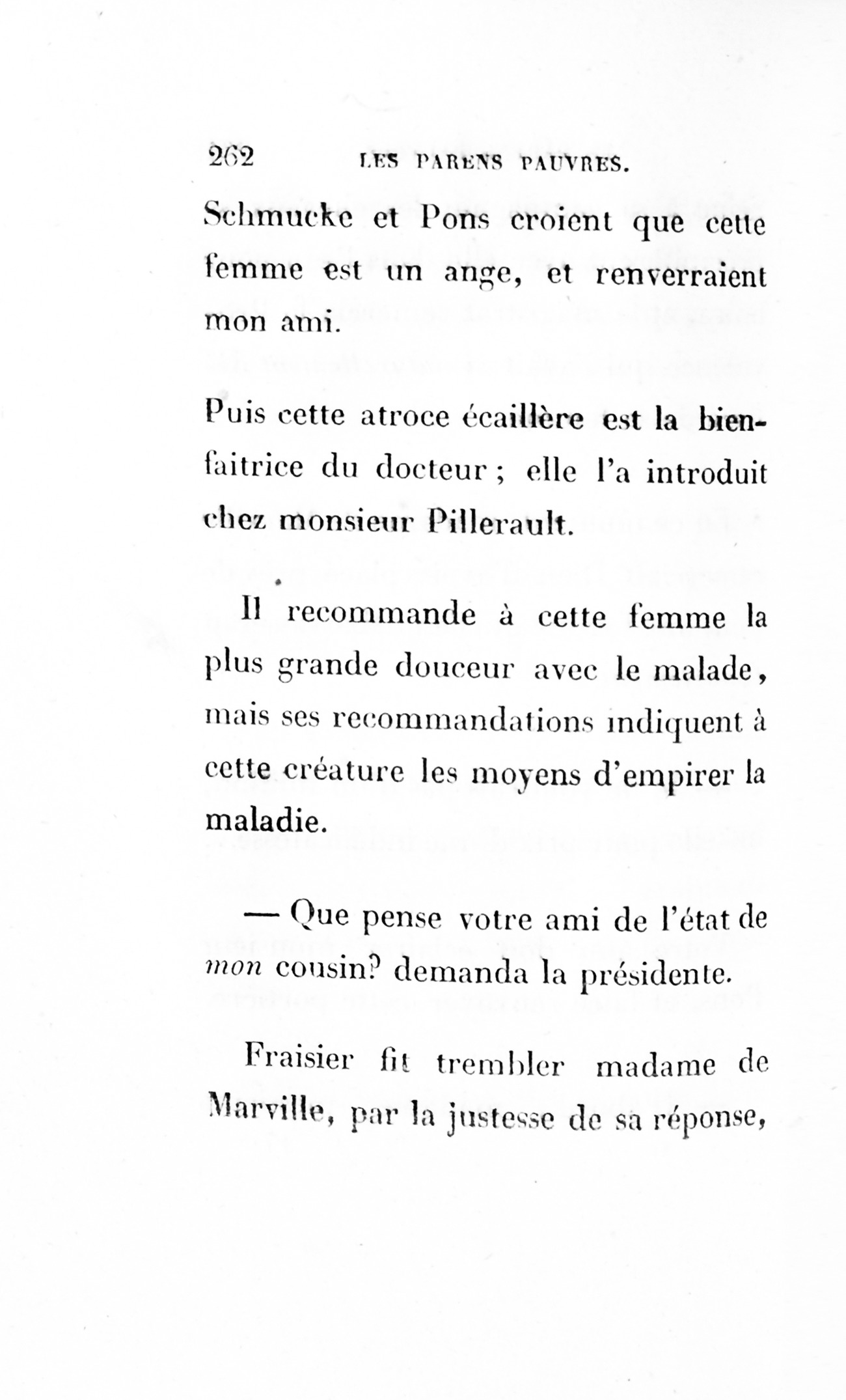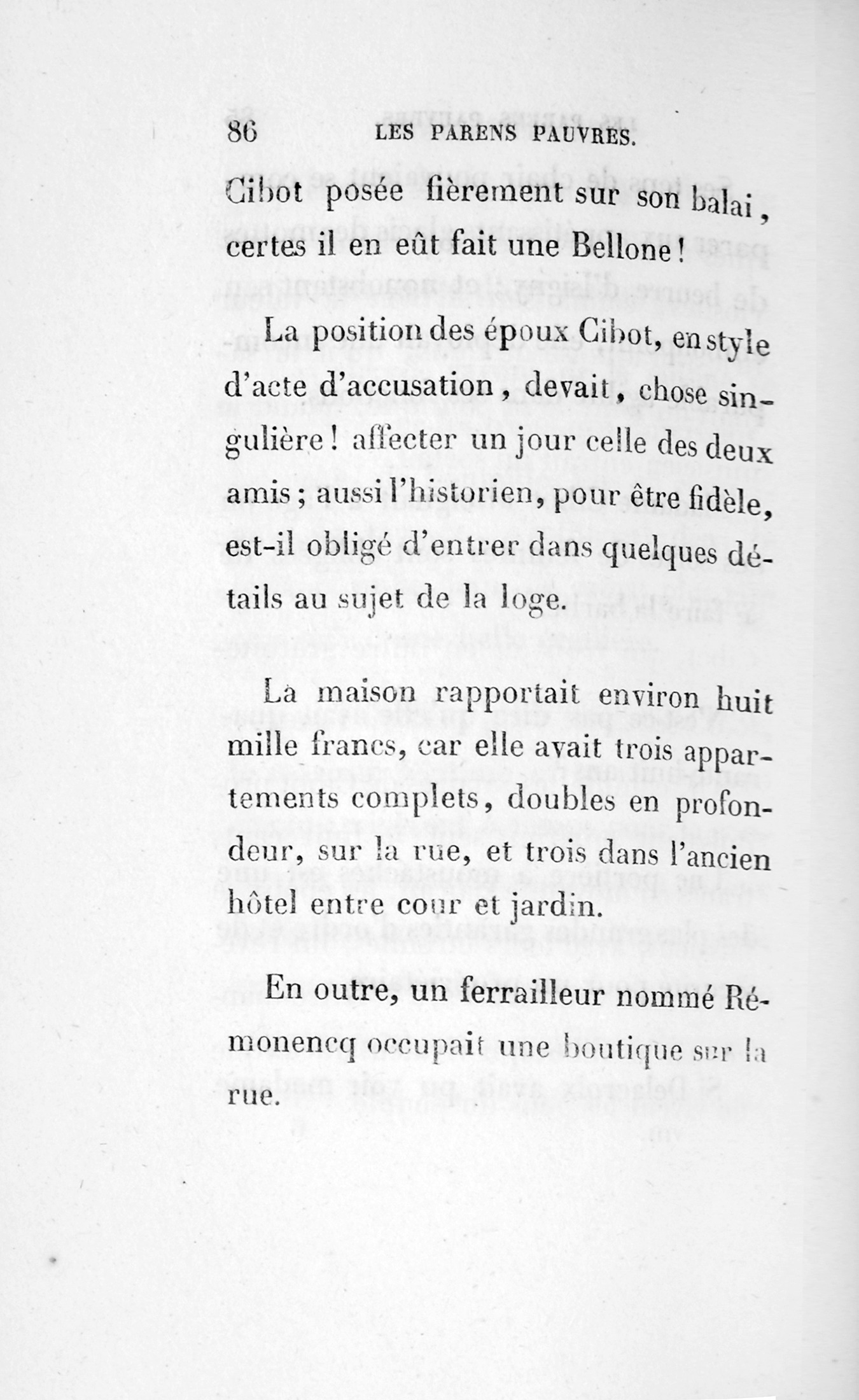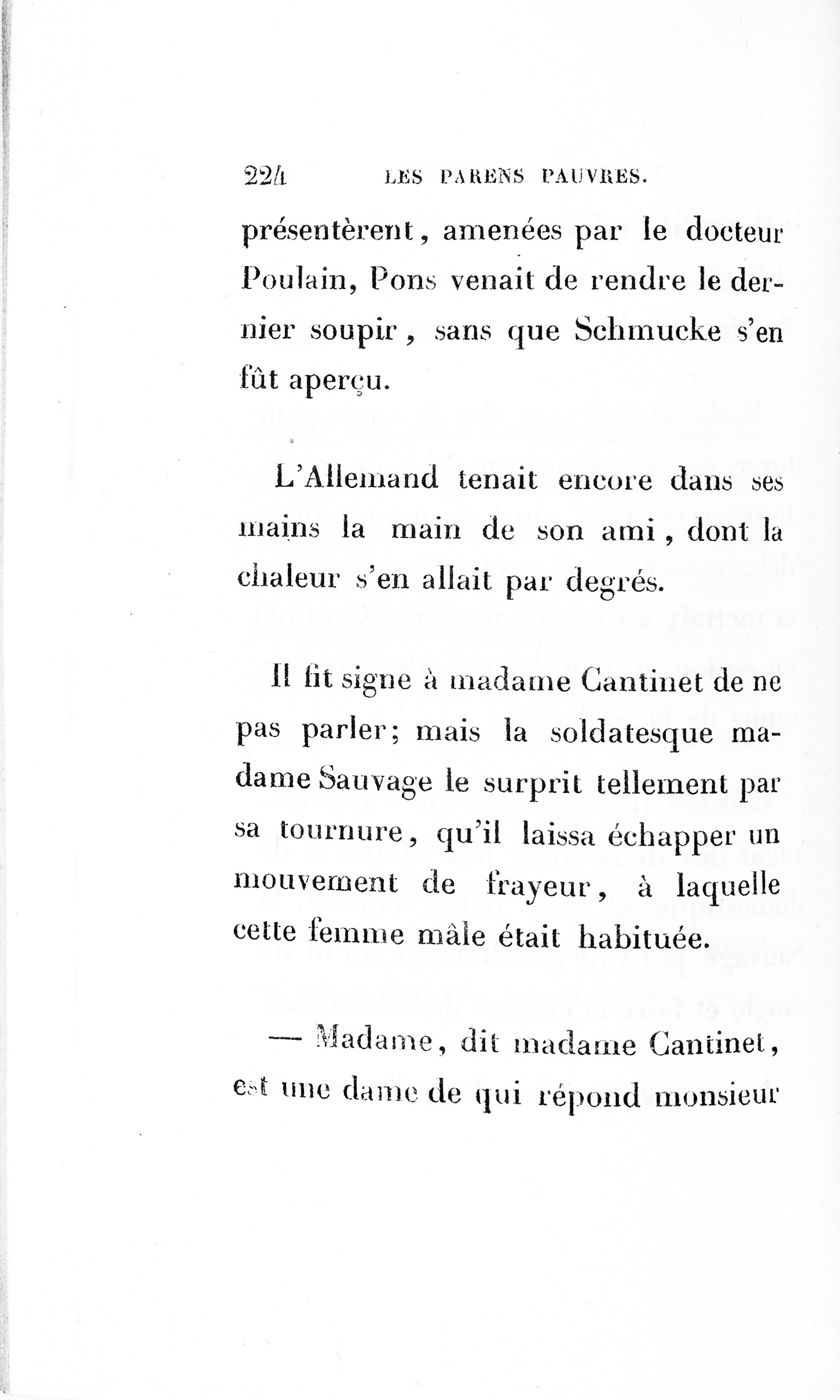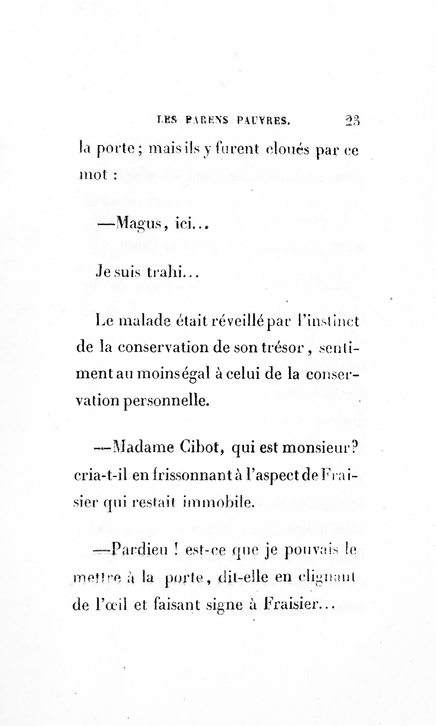 – Eh bien ! madame, je vous ai déjà débarrassée234Erreur du Pétion : « débarrassé » au lieu de « débarrassée ». des soixante mille francs que je calculais devoir être donnés à cette ignoble portière, cette madame Cibot.