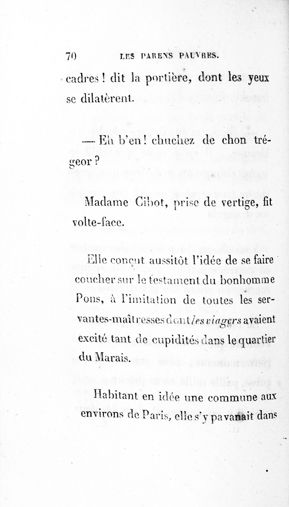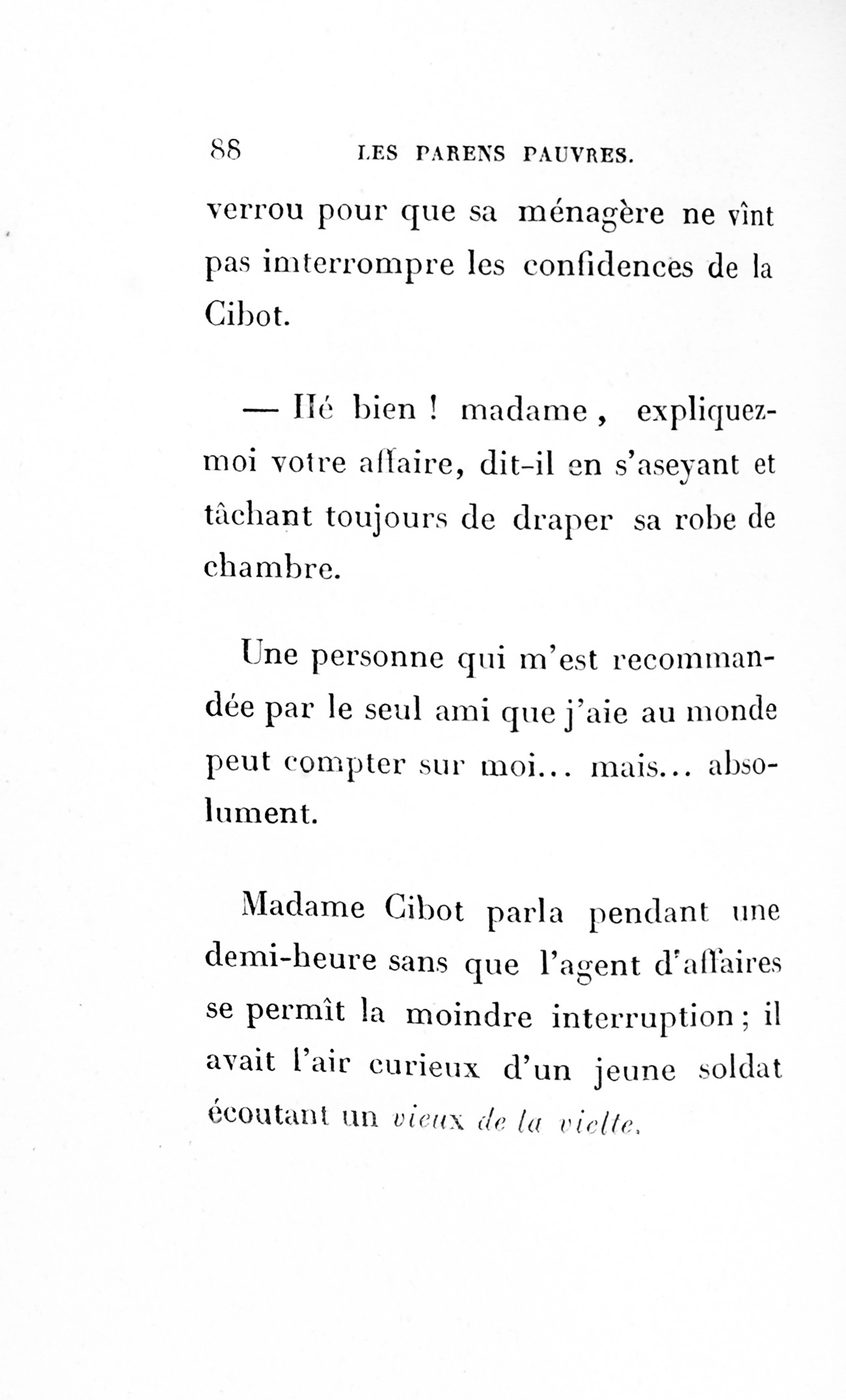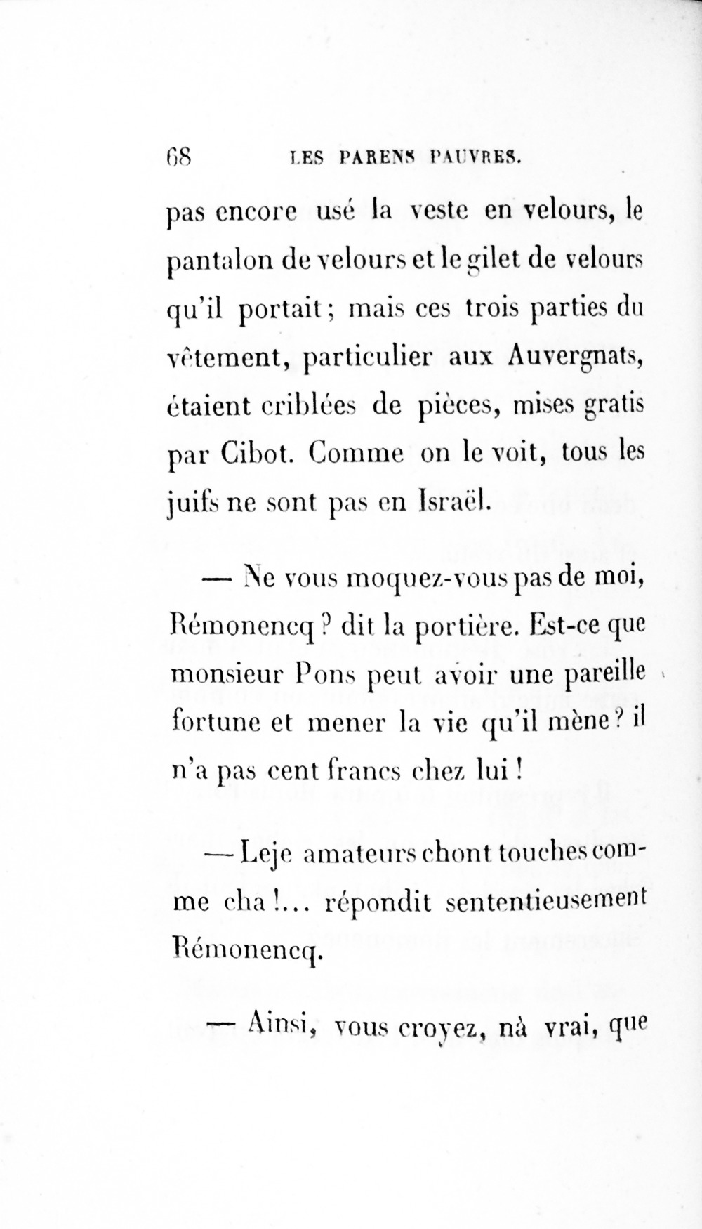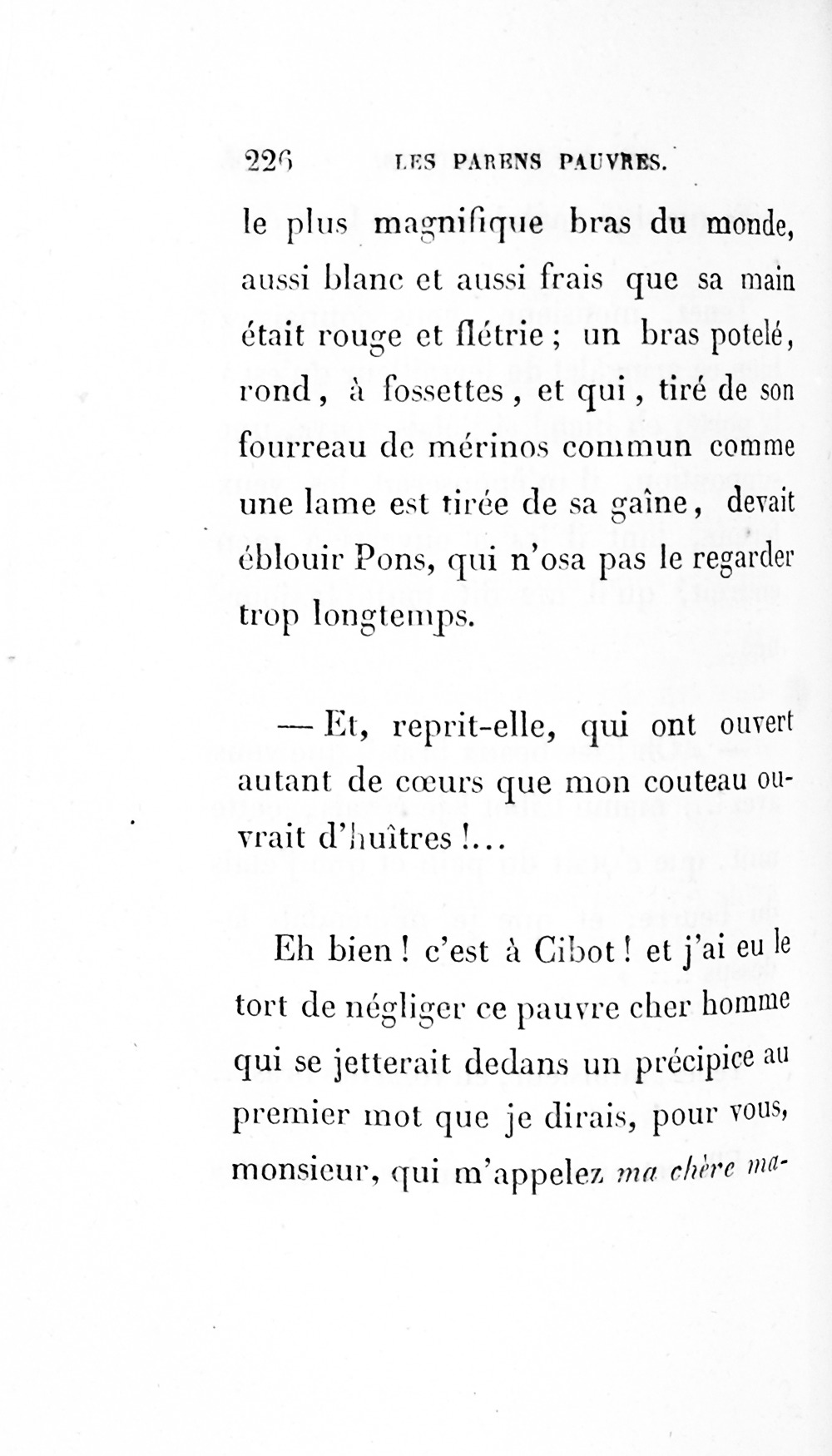 – Eh bien ! madame, je vous ai déjà débarrassée234Erreur du Pétion : « débarrassé » au lieu de « débarrassée ». des soixante mille francs que je calculais devoir être donnés à cette ignoble portière, cette madame Cibot.