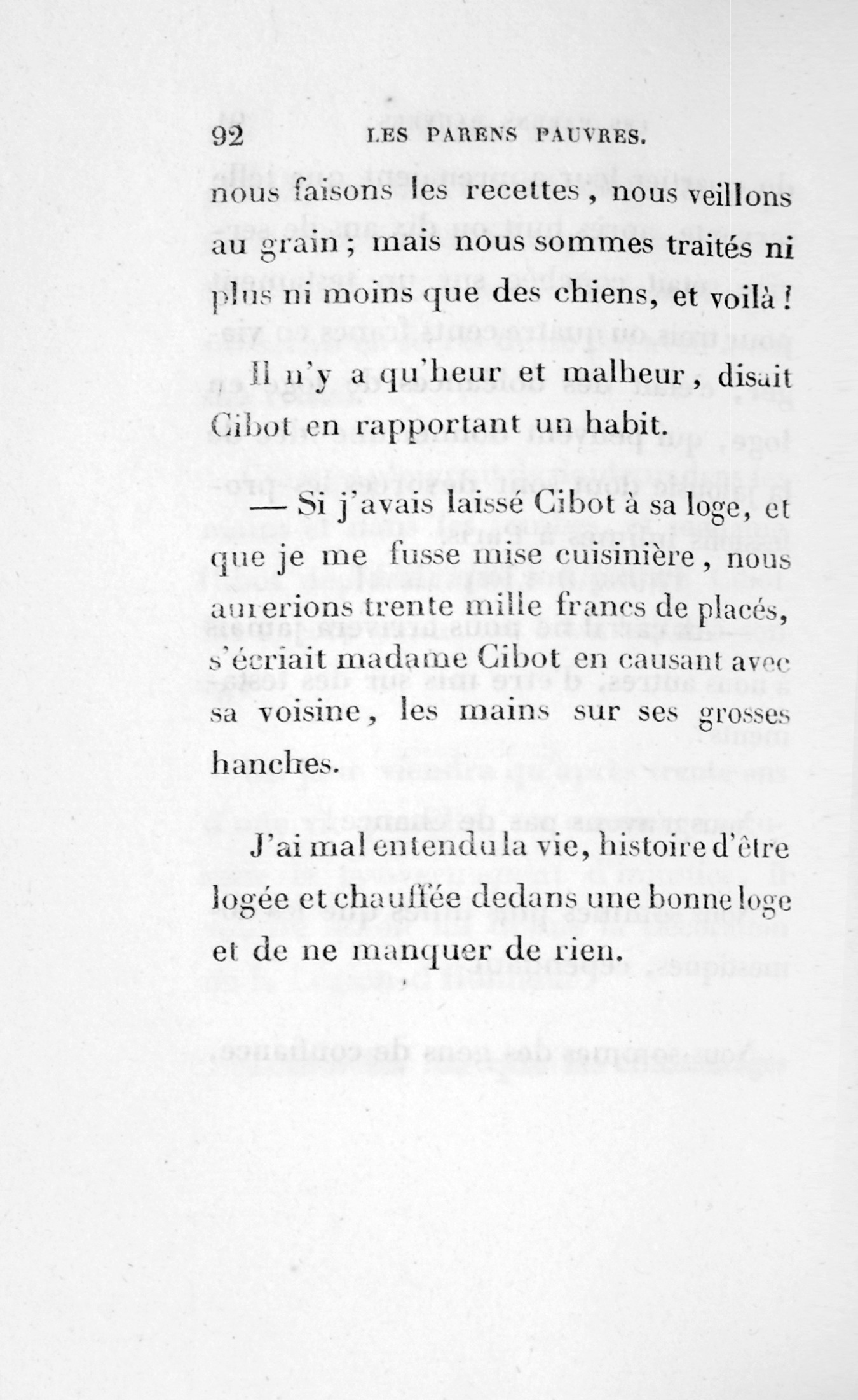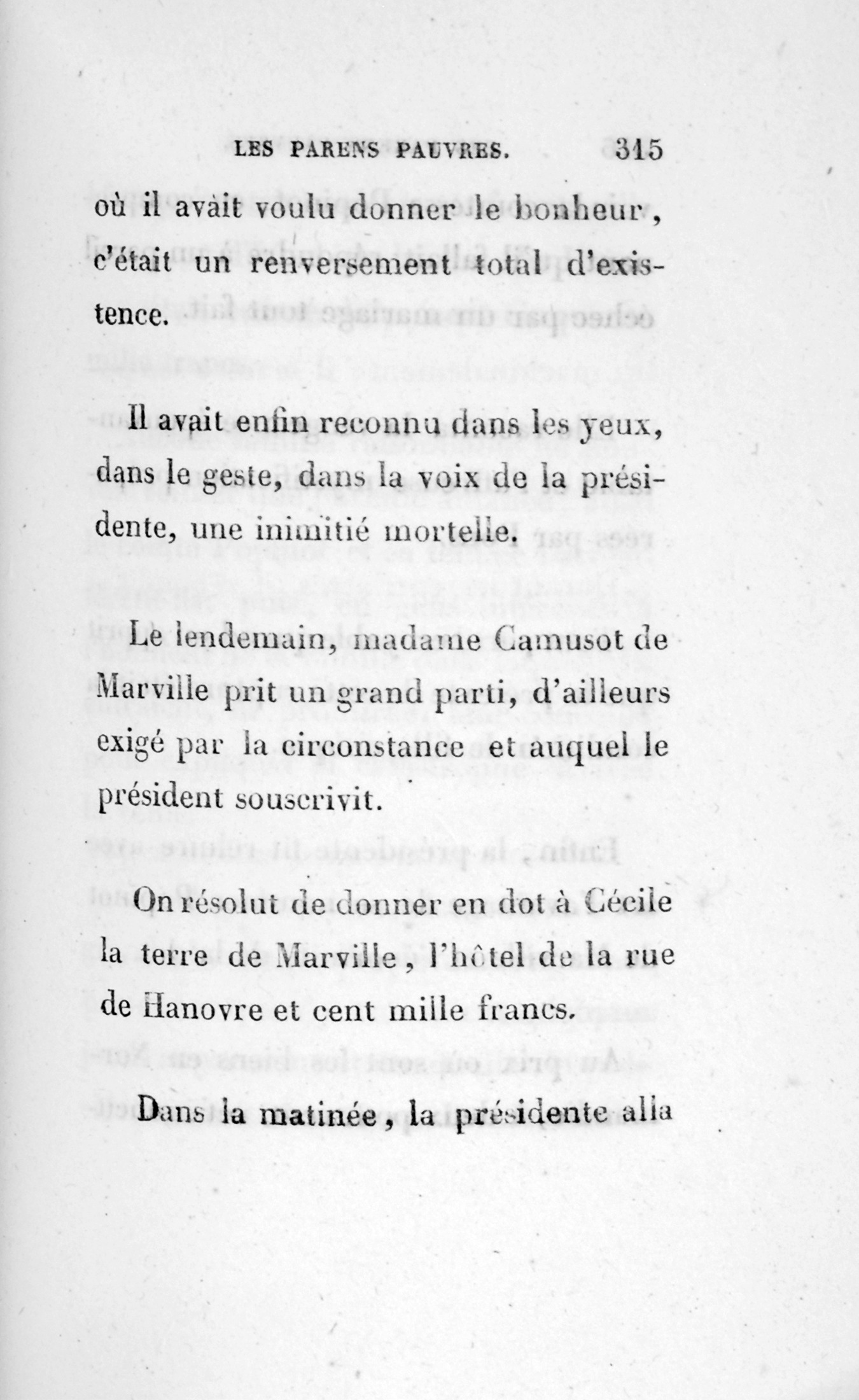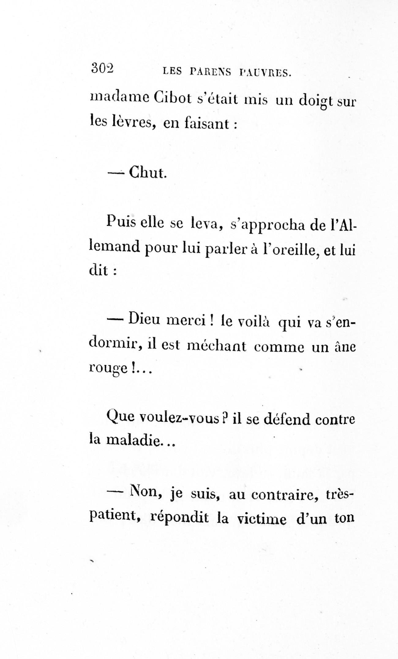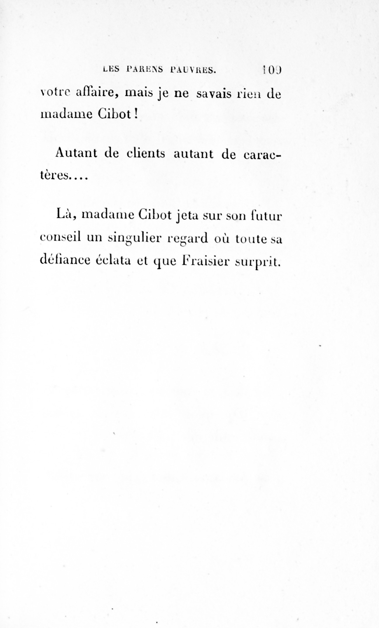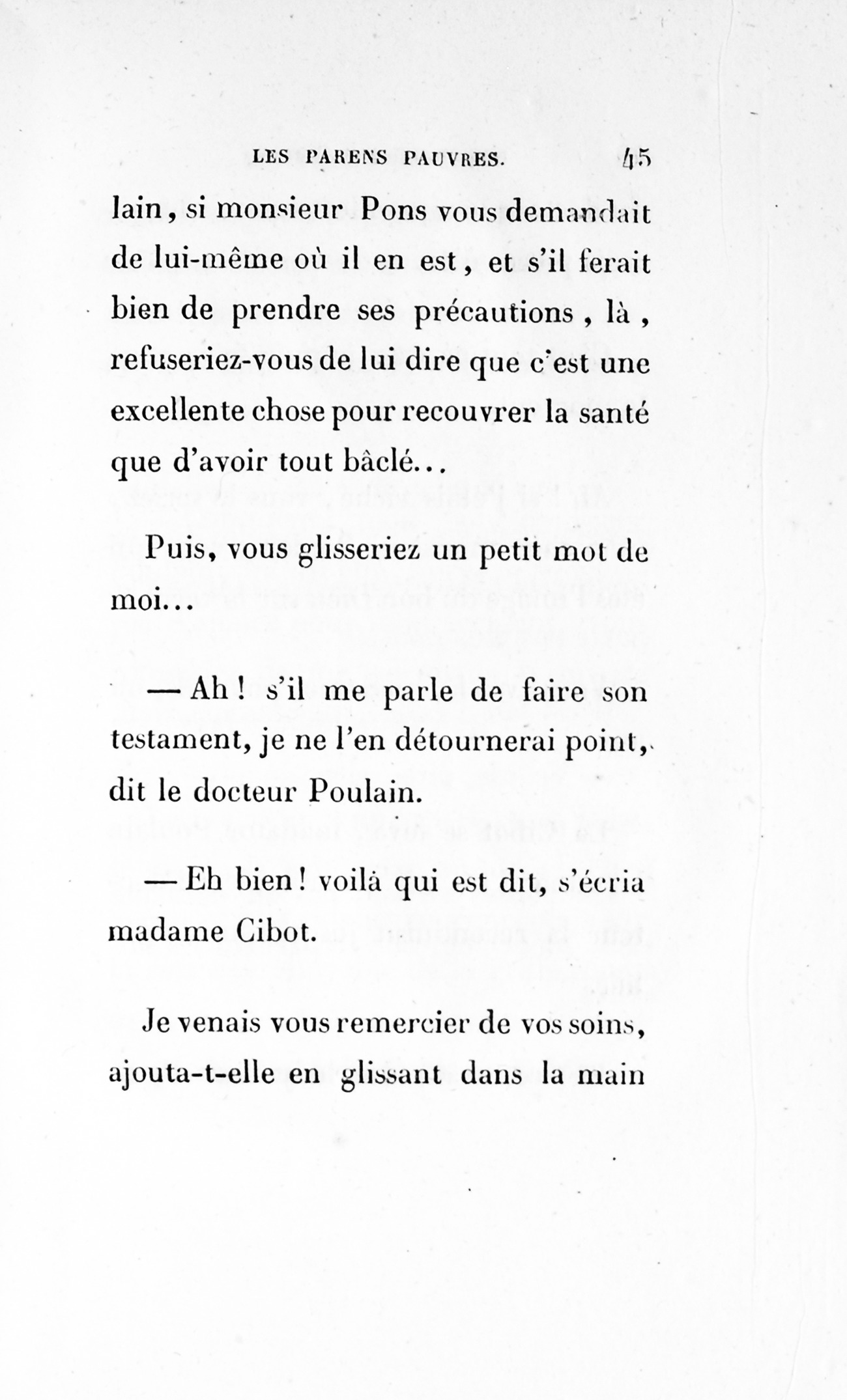 – Eh bien ! madame, je vous ai déjà débarrassée234Erreur du Pétion : « débarrassé » au lieu de « débarrassée ». des soixante mille francs que je calculais devoir être donnés à cette ignoble portière, cette madame Cibot.