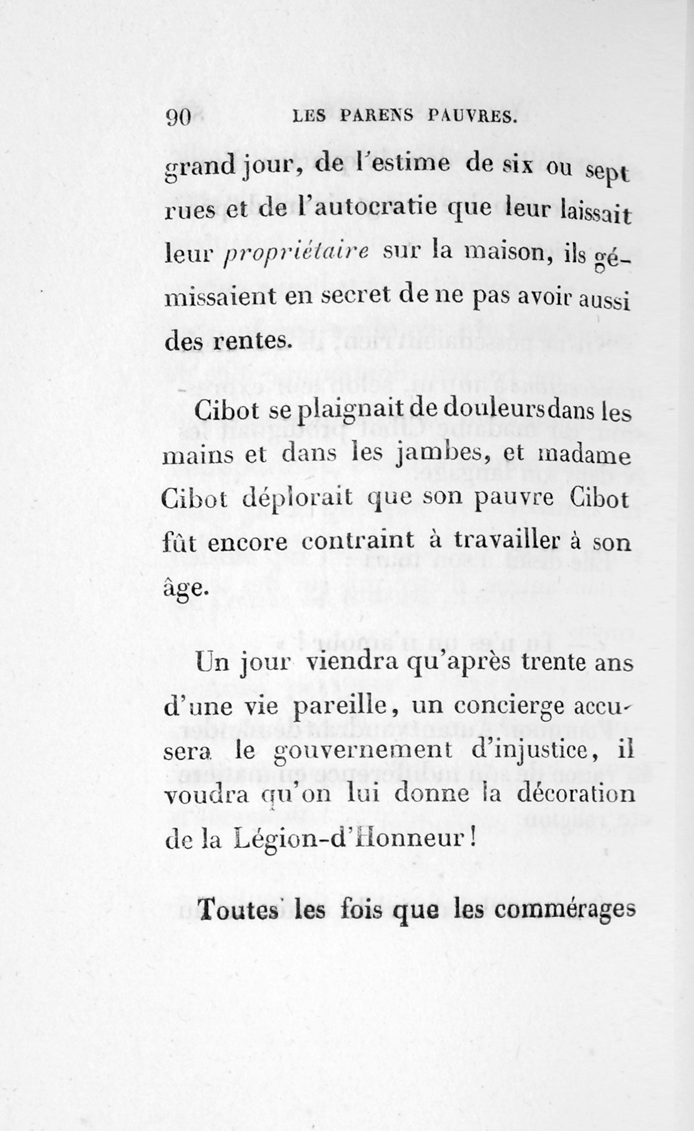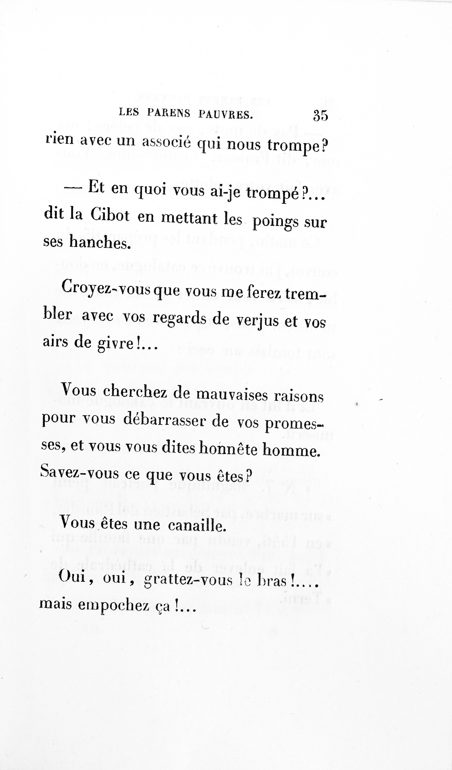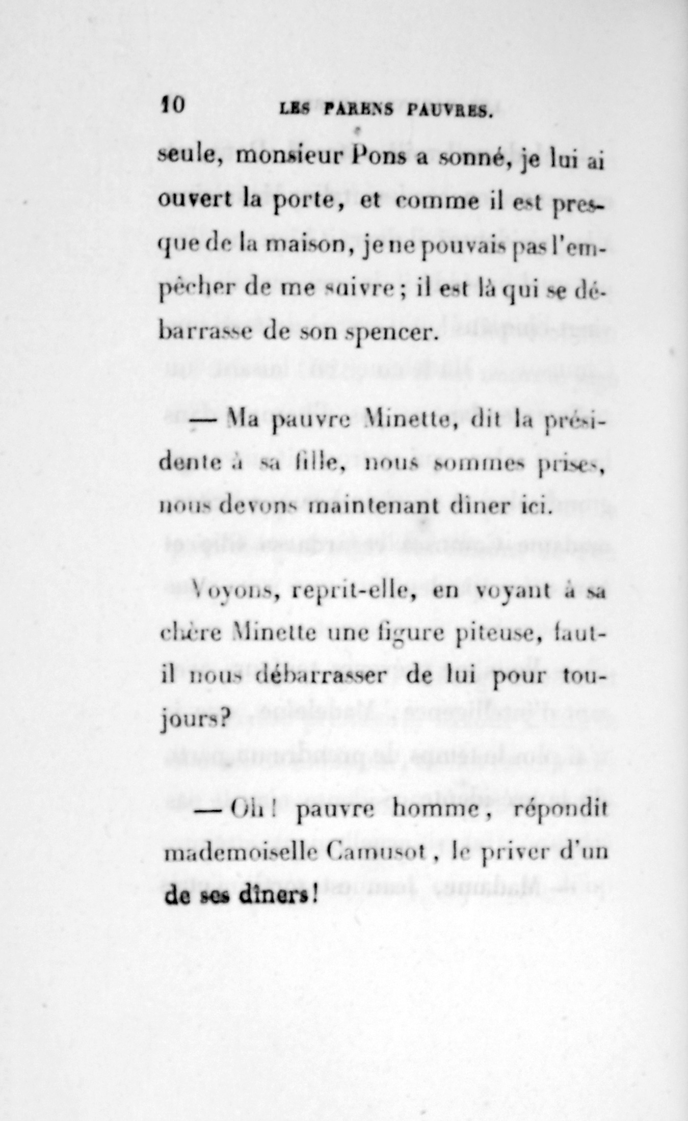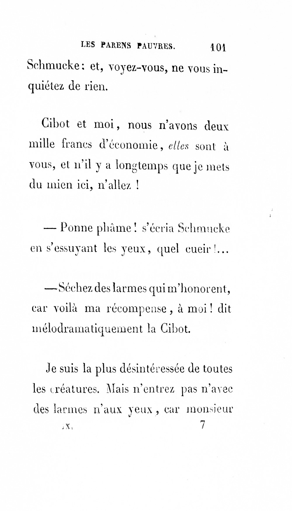 – Eh bien ! madame, je vous ai déjà débarrassée234Erreur du Pétion : « débarrassé » au lieu de « débarrassée ». des soixante mille francs que je calculais devoir être donnés à cette ignoble portière, cette madame Cibot.