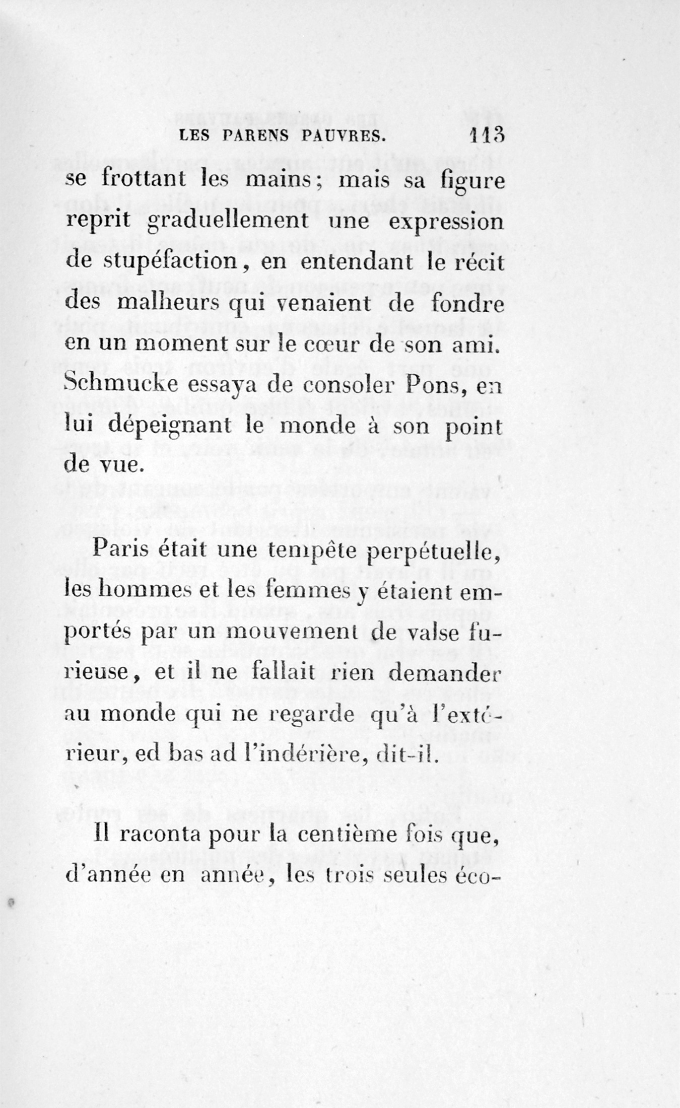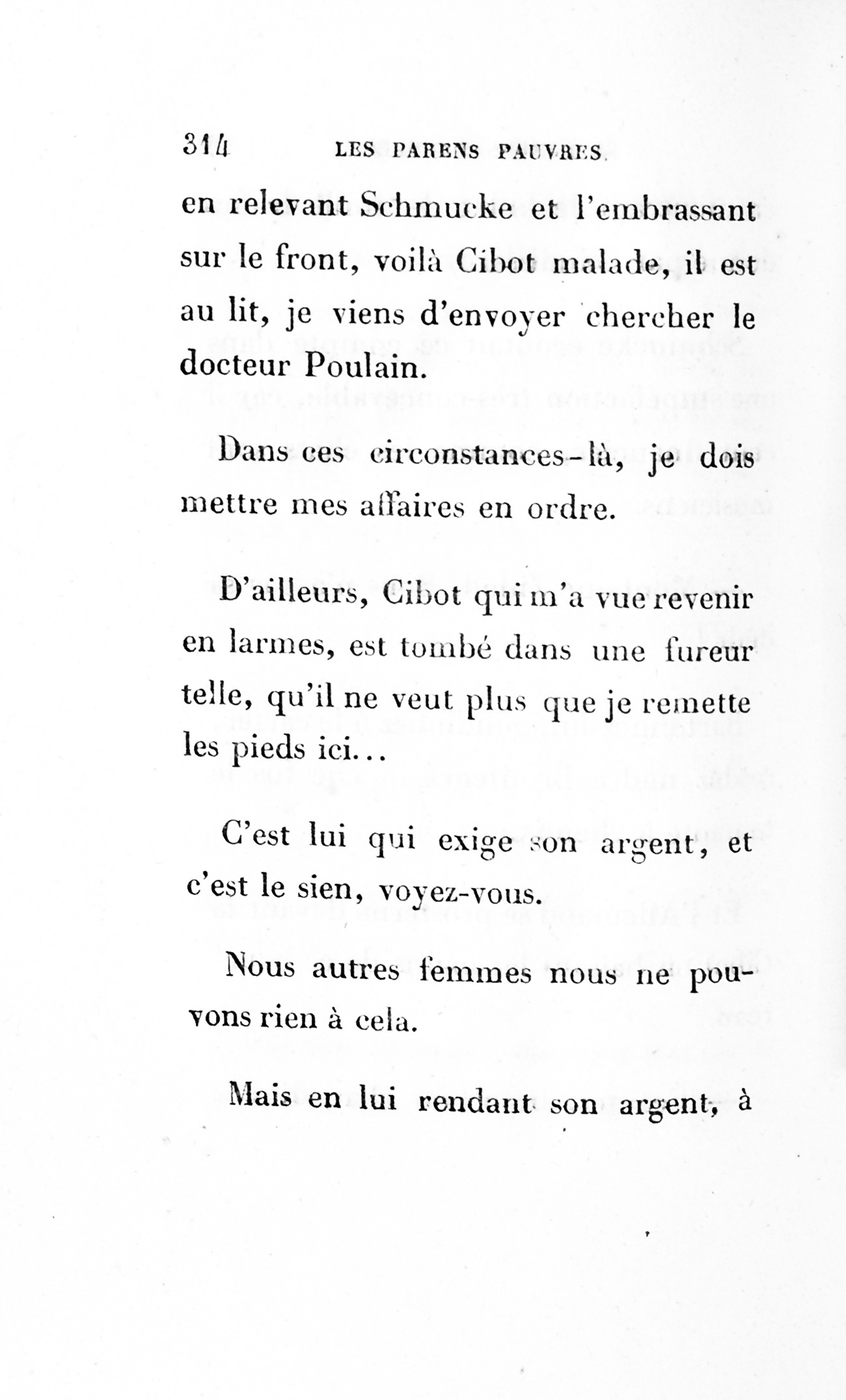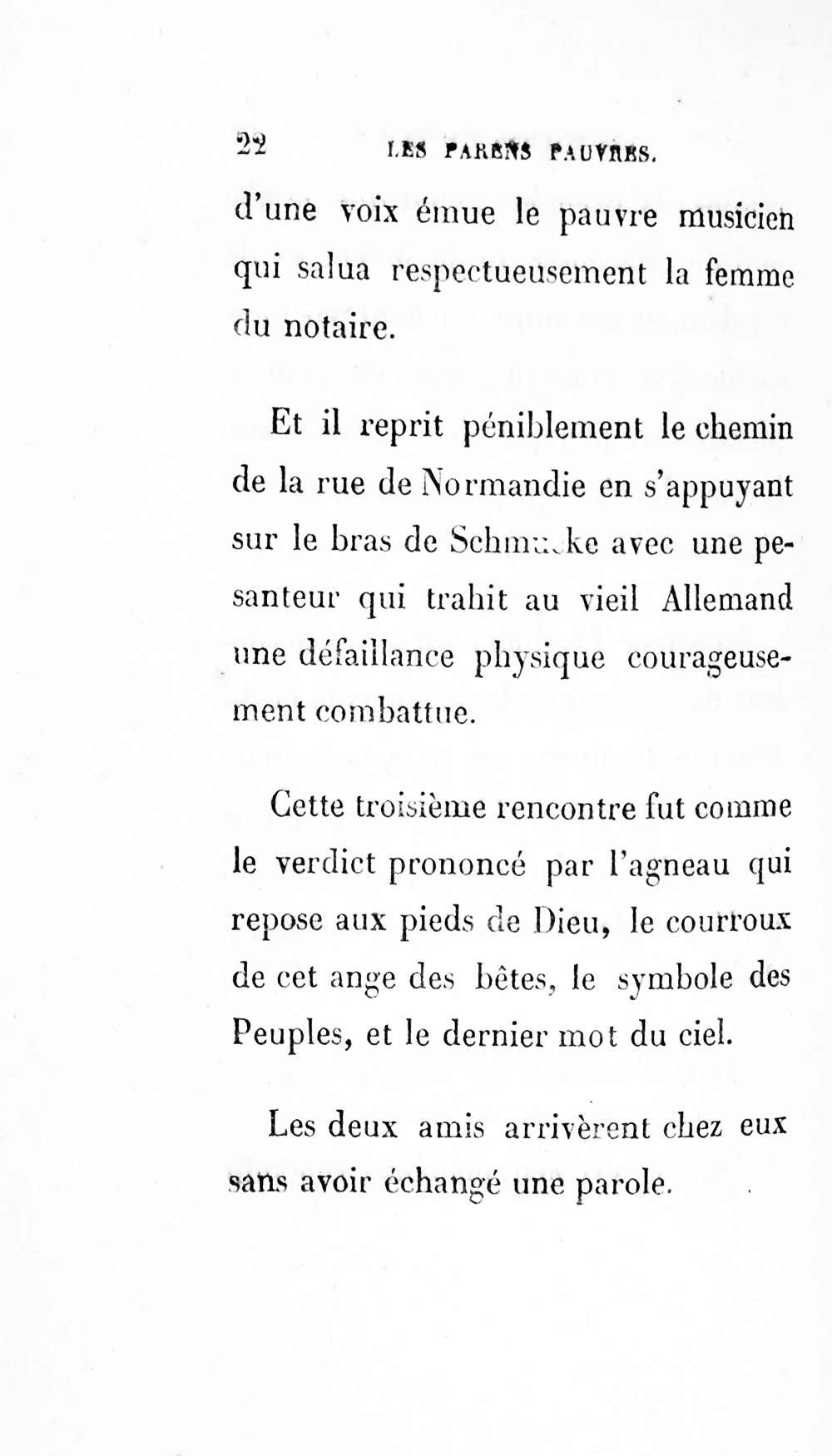 p. 158 Schmucke prit le papier, le lut, et en se voyant traité comme il l’était, ne comprenant rien aux gentillesses de la procédure, il reçut un coup mortel.
