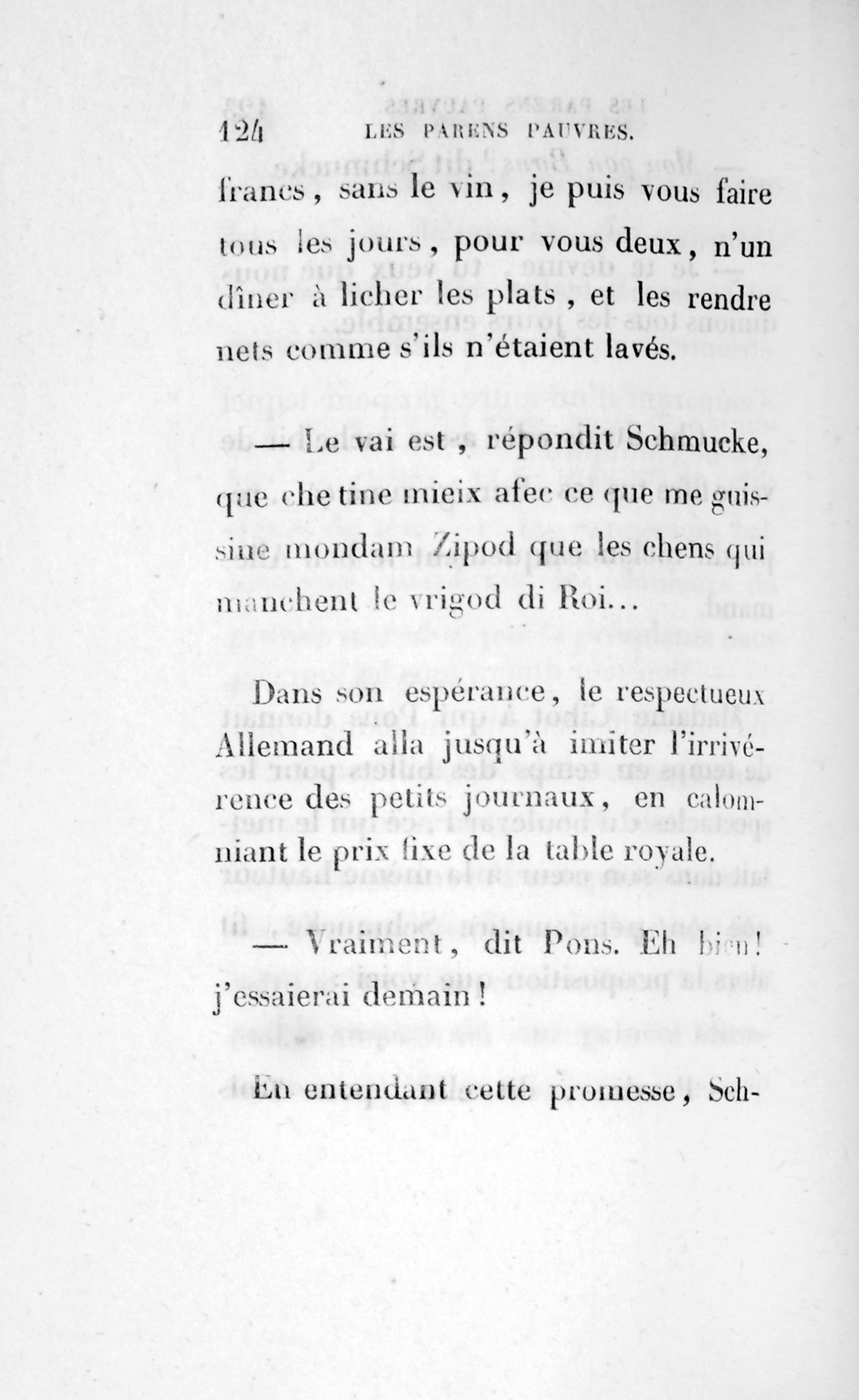 Avec le temps, Schmucke finit par comprendre Pons, car il était trop Allemand pour avoir la rapidité d’observation dont jouissent les Français, et il n’en aima que mieux le pauvre Pons.