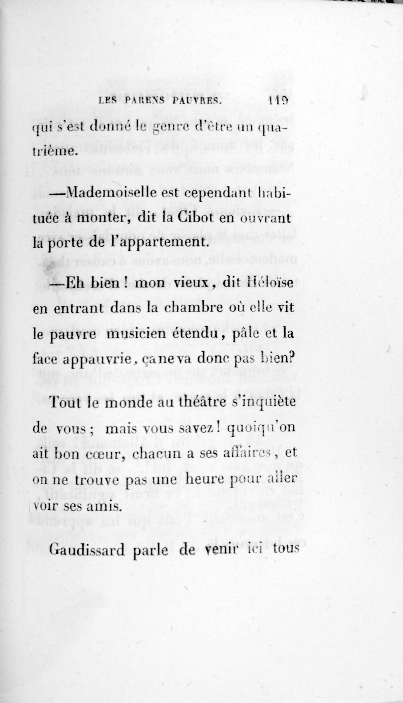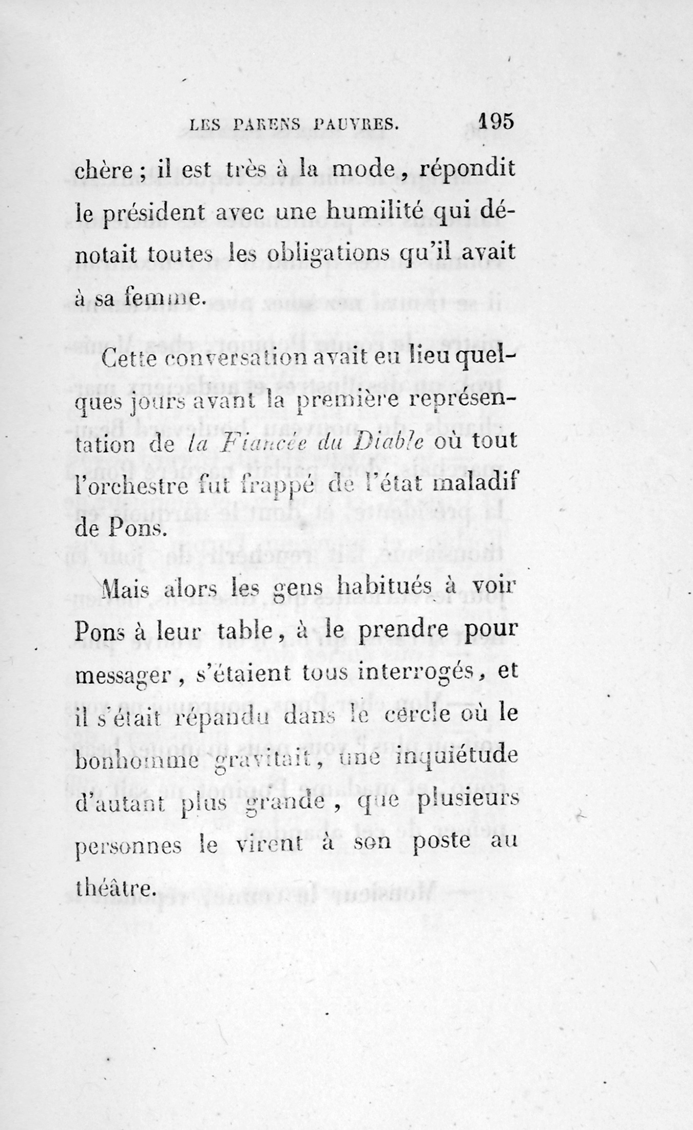 Ce passant était pourtant un grand prix, l’auteur de la première cantate couronnée à l’Institut, lors du rétablissement de l’Académie de Rome, enfin M. Sylvain Pons !… l’auteur de célèbres romances roucoulées par nos mères, de deux ou trois opéras joués en 1815 et 1816, puis de quelques partitions inédites. Ce digne homme finissait chef d’orchestre à un théâtre des boulevards. Il était, grâce à sa figure, professeur dans quelques pensionnats de demoiselles, et n’avait pas d’autres revenus que ses appointemens et ses cachets.