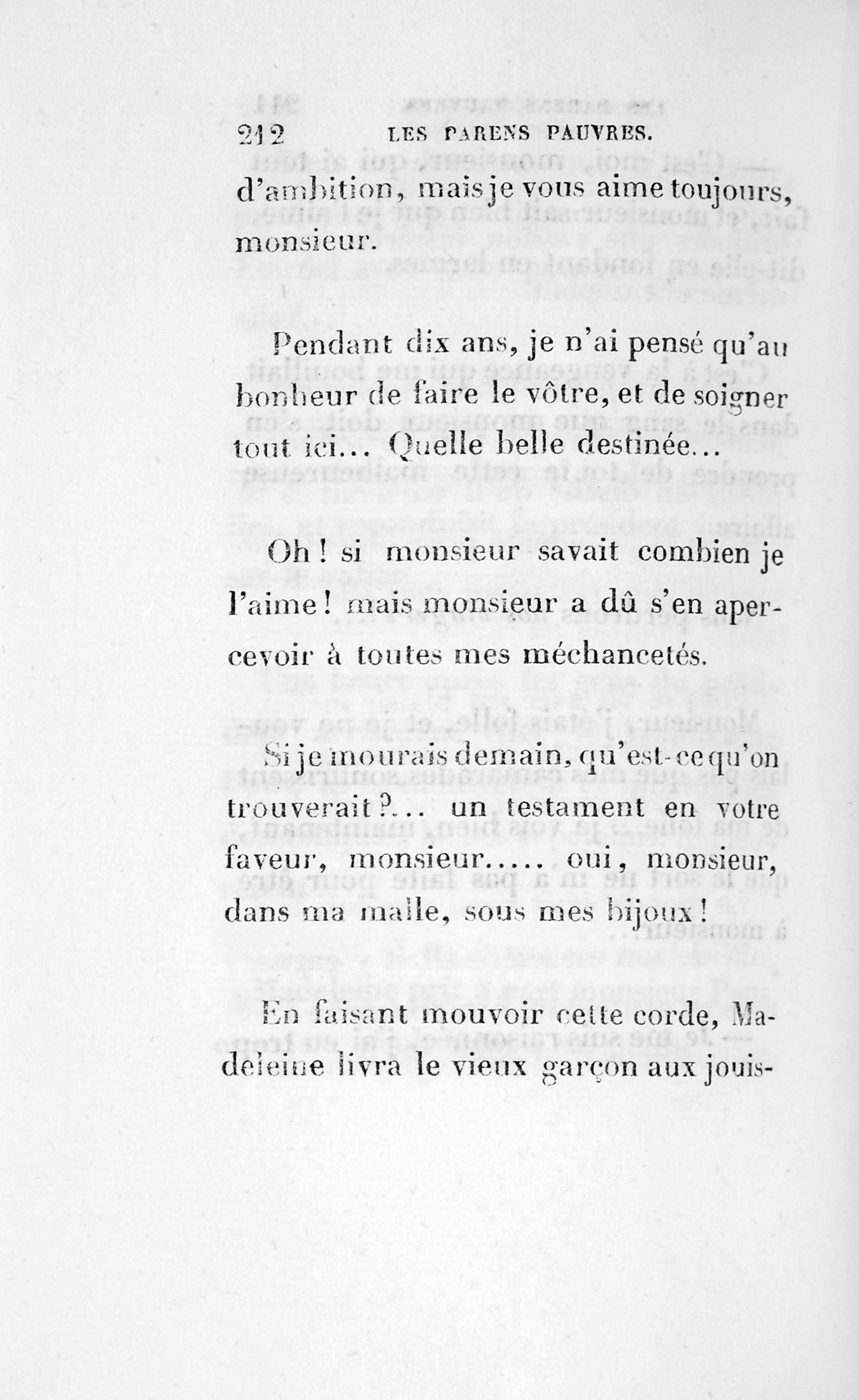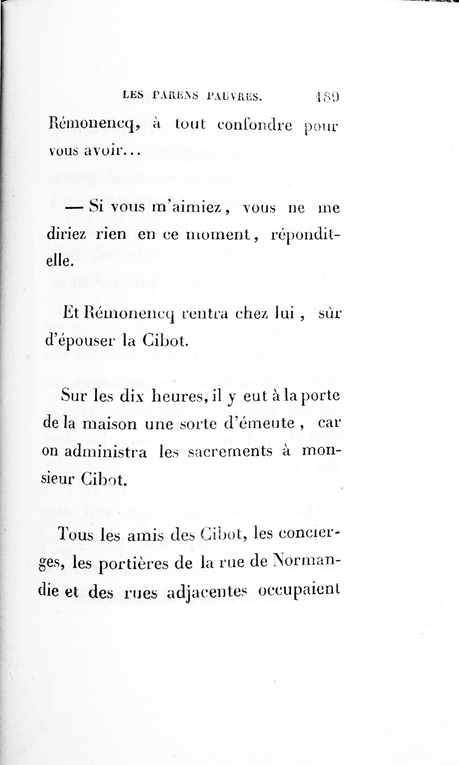 p. 169 Madame Rémonencq, frappée de la prédiction de madame Fontaine, ne veut pas se retirer à la campagne, elle reste dans son magnifique magasin du boulevard de la Madeleine, encore une fois veuve, car l’Auvergnat, après s’être fait donner par contrat de mariage les biens au dernier vivant, avait mis à portée de sa femme un petit verre de vitriol, comptant sur une erreur, et sa femme, dans une intention excellente, ayant mis ailleurs le petit verre, Rémonencq l’avala.