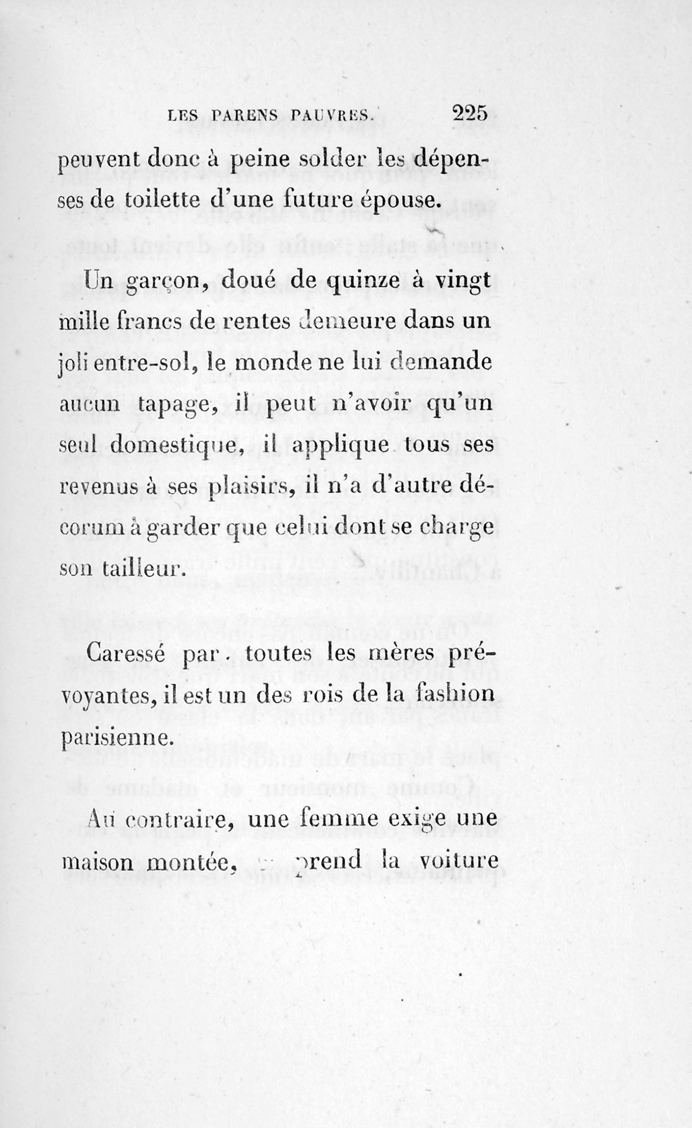 Avant la paix d’Amiens, cet Anglais avait résolu le problème de couvrir le buste sans assommer le corps par le poids de cet affreux carrick qui finit aujourd’hui sur le dos des vieux cochers de fiacre ; mais comme les fines tailles sont en minorité, la mode [p. 248] du spencer pour homme n’eut en France qu’un succès passager, quoique ce fût une invention anglaise.