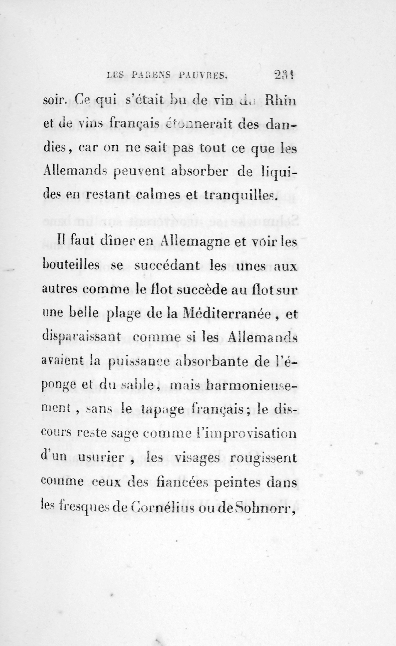 Pons et Schmucke avaient en abondance, l’un comme l’autre, dans le cœur et dans le caractère, ces enfantillages de sentimentalité qui distinguent les Allemands : comme la passion des fleurs, comme l’adoration des effets naturels, qui les porte à planter de grosses bouteilles dans leurs jardins pour voir en petit le paysage qu’ils ont en grand sous les yeux ; comme cette prédisposition aux recherches qui fait faire à un savant germanique cent lieues dans ses guêtres pour trouver une vérité qui le regarde en riant, assise à la marge du puits sous le jasmin de la cour ; comme enfin ce besoin de prêter une signifiance psychique aux riens de la création, qui produit les œuvres inexplicables de JeanPaul Richter, les griseries imprimées d’Hoffmann et les garde-fous in-folio que l’Allemagne met autour des questions les plus simples, creusées en manière d’abîmes, au fond desquels il ne se trouve qu’un Allemand.